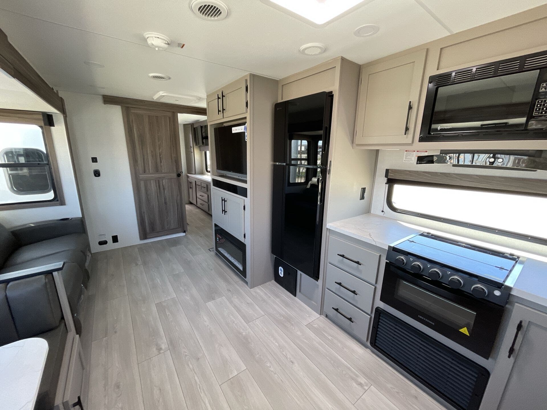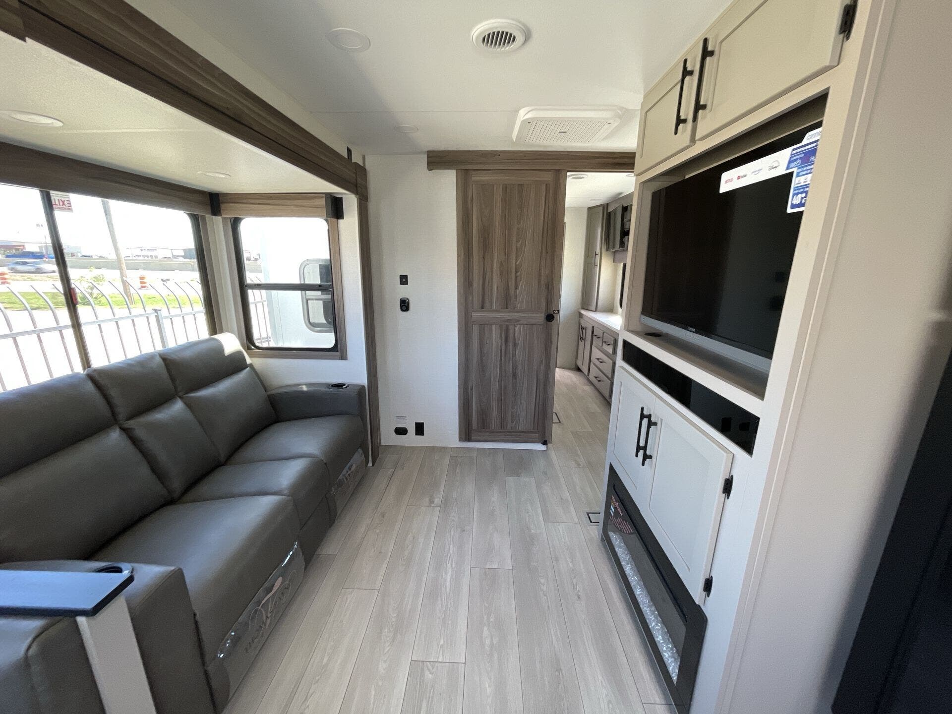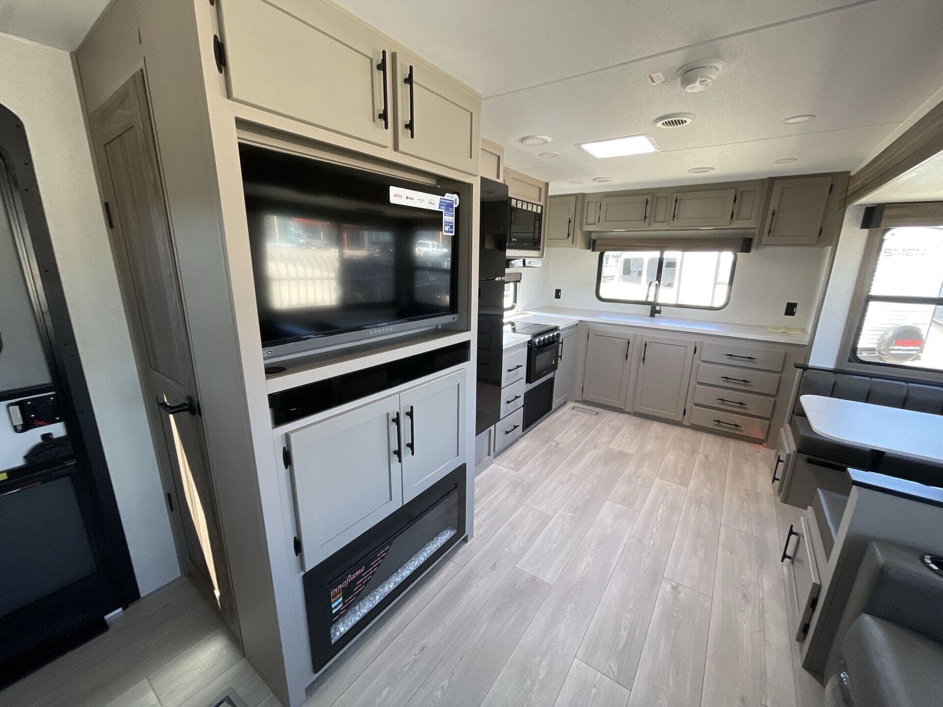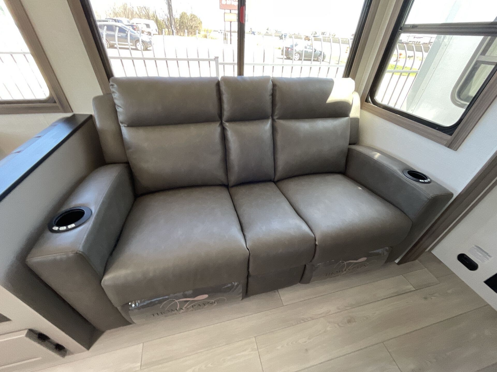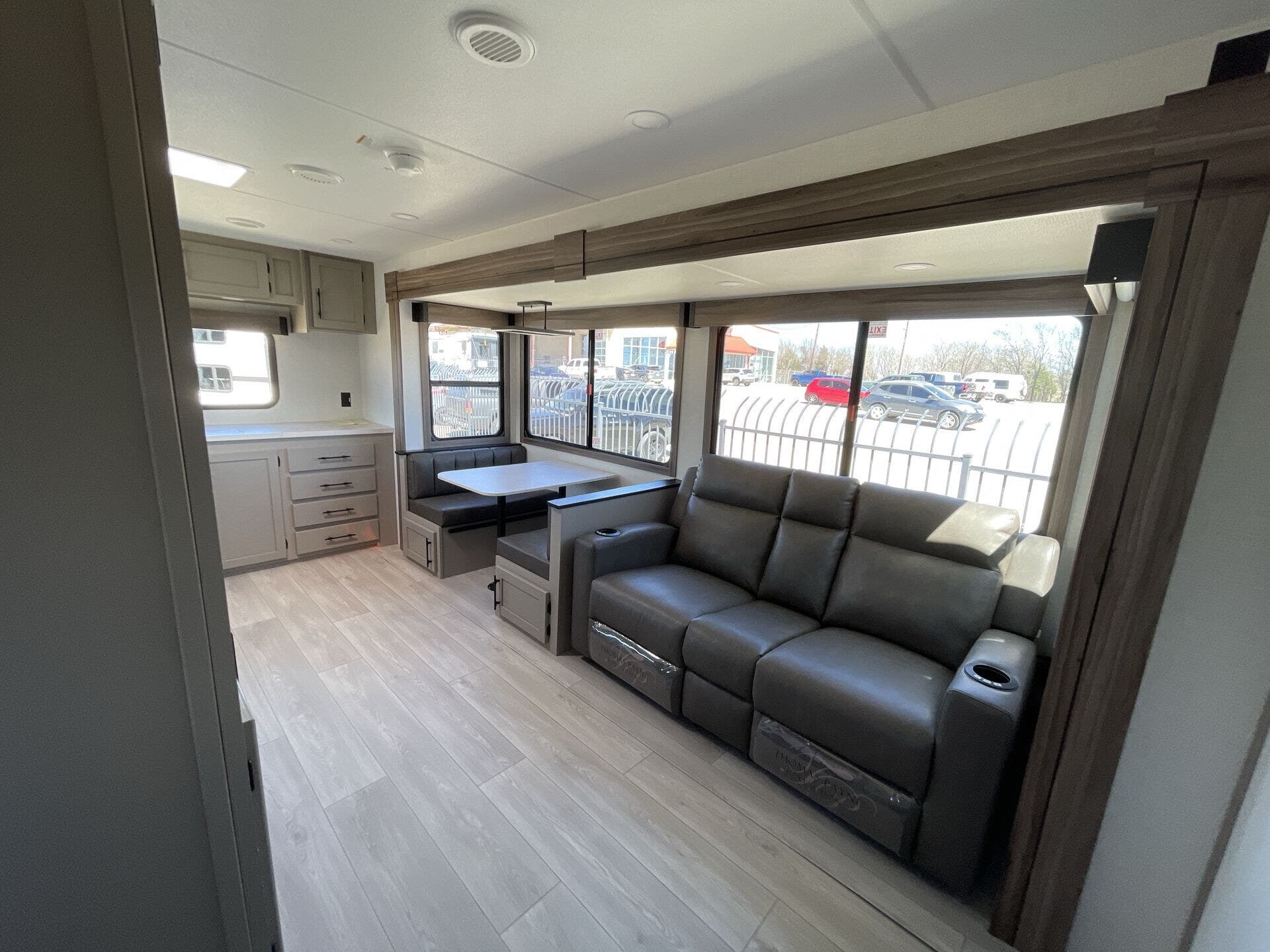 Inside, the 302FBK features a front kitchen floorplan that maximizes both functionality and comfort. The gourmet kitchen is equipped with solid-surface countertops, a three-burner cooktop, oven, refrigerator, and abundant cabinetry, making meal prep simple and efficient. The main living area includes theater seating, a sofa, and an entertainment center, creating a welcoming space for relaxing, entertaining, or spending quality time with family and friends. Large panoramic windows flood the interior with natural light, adding to the open, airy feel.