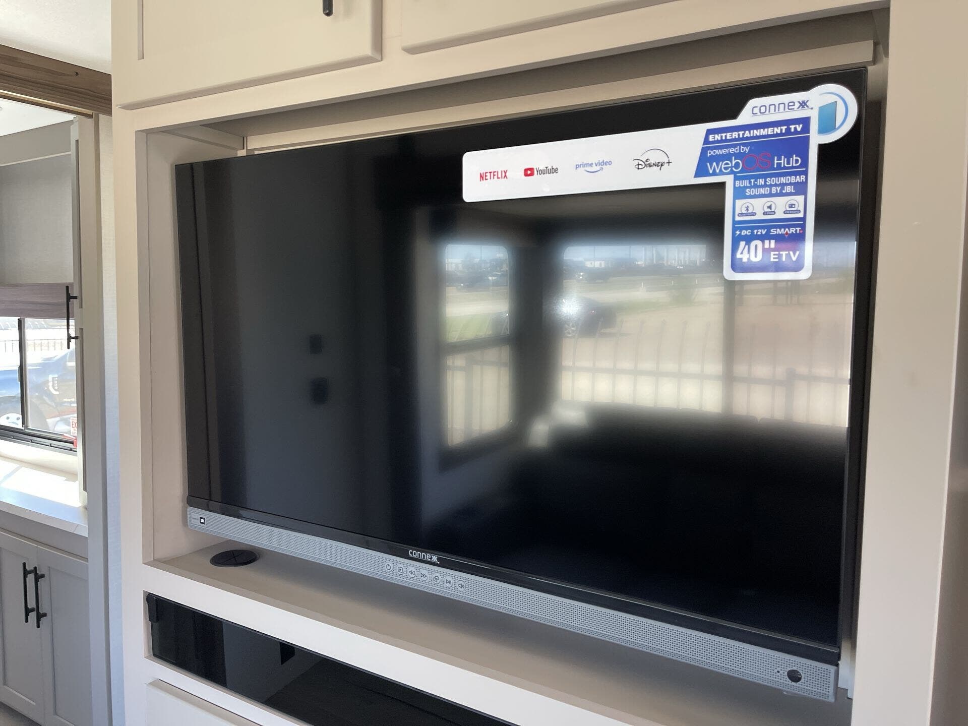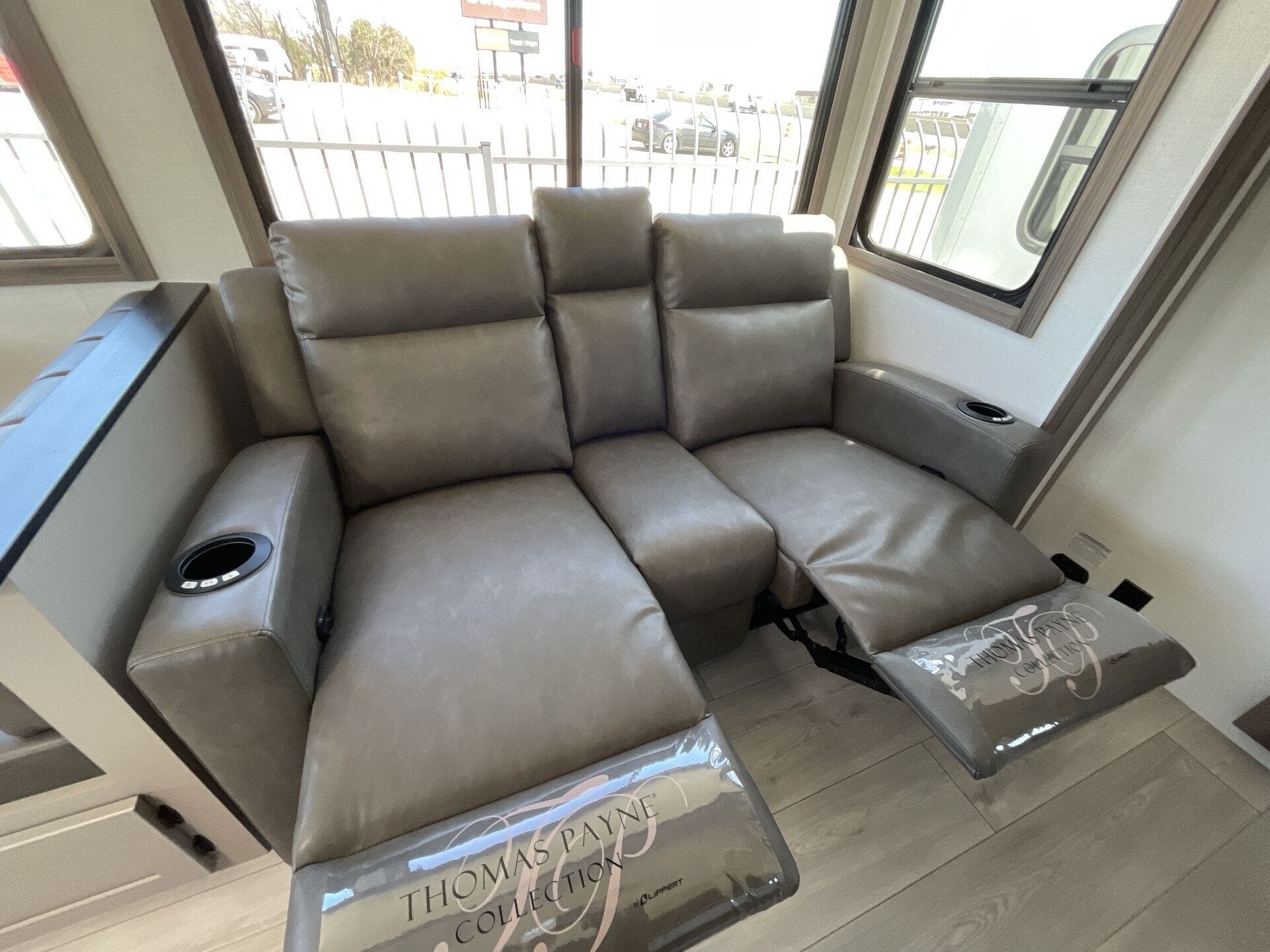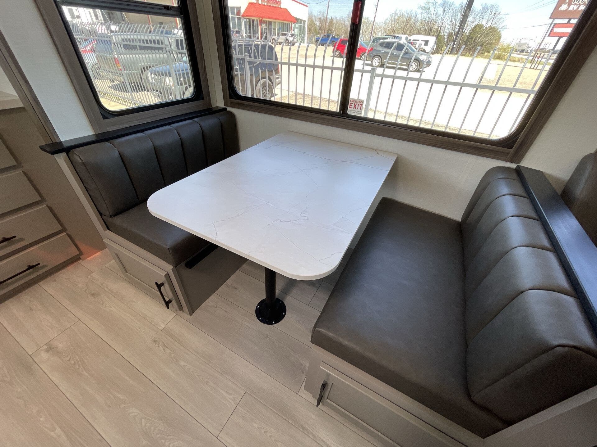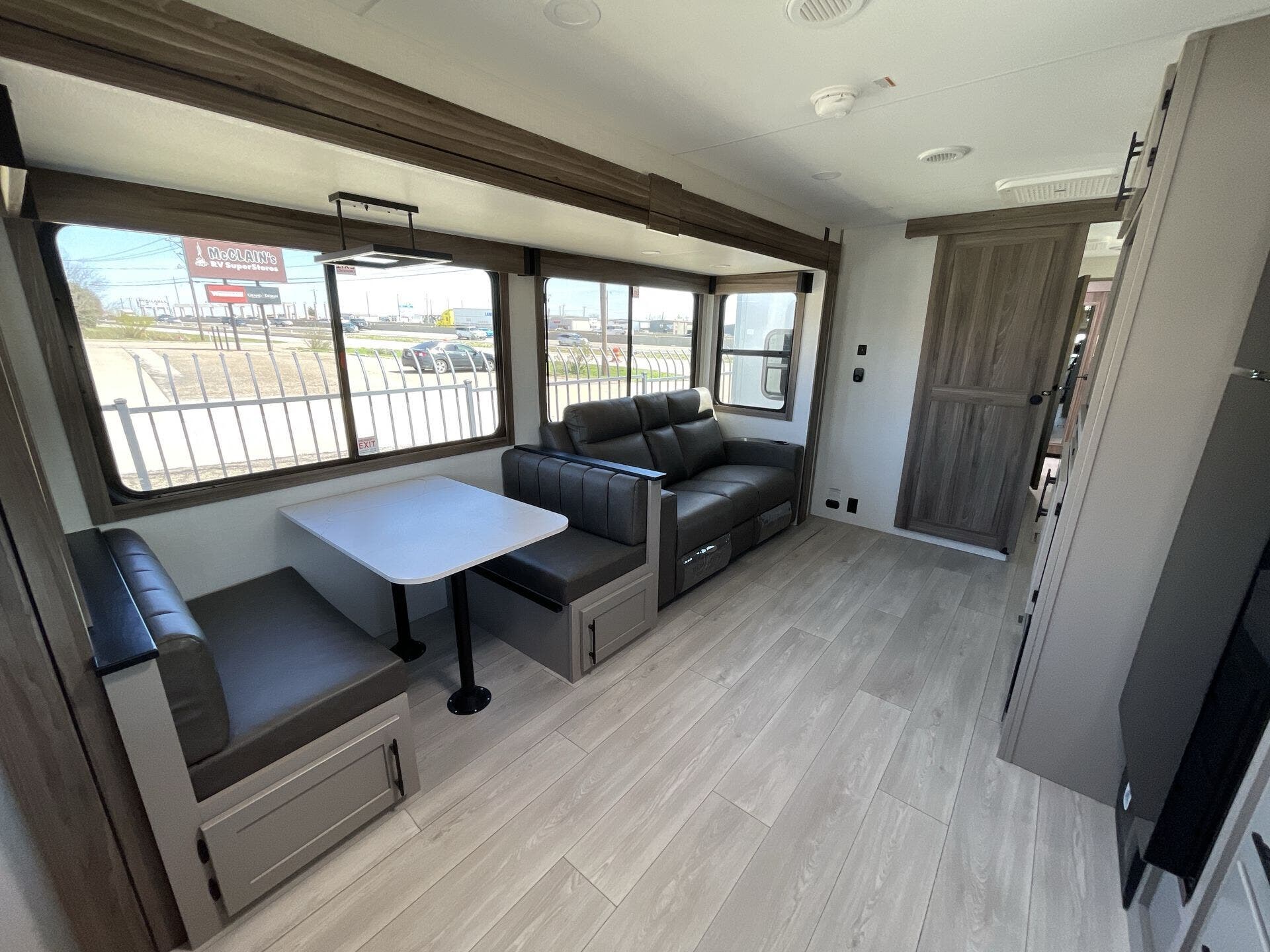 Inside, the 302FBK features a front kitchen floorplan that maximizes both functionality and comfort. The gourmet kitchen is equipped with solid-surface countertops, a three-burner cooktop, oven, refrigerator, and abundant cabinetry, making meal prep simple and efficient. The main living area includes theater seating, a sofa, and an entertainment center, creating a welcoming space for relaxing, entertaining, or spending quality time with family and friends. Large panoramic windows flood the interior with natural light, adding to the open, airy feel.