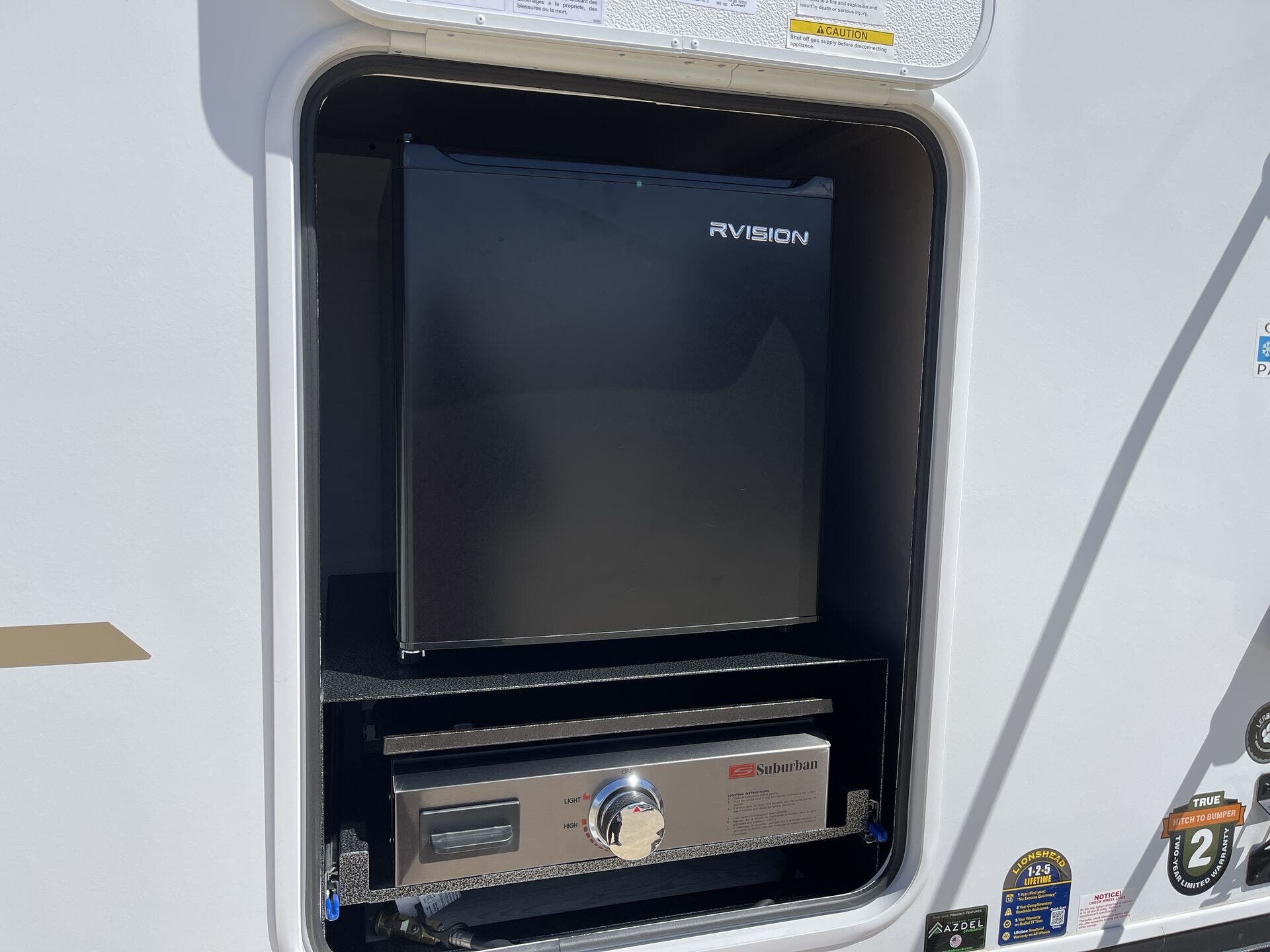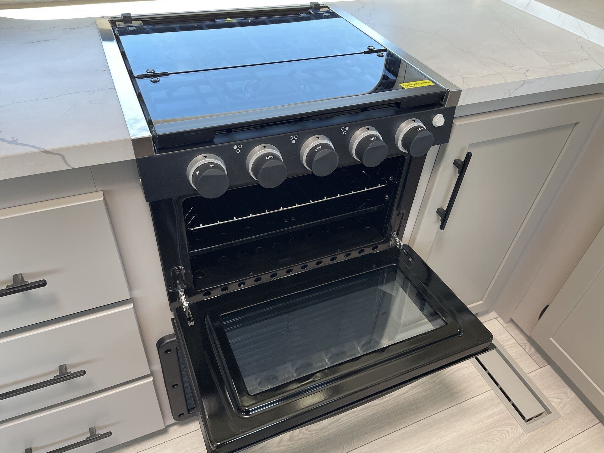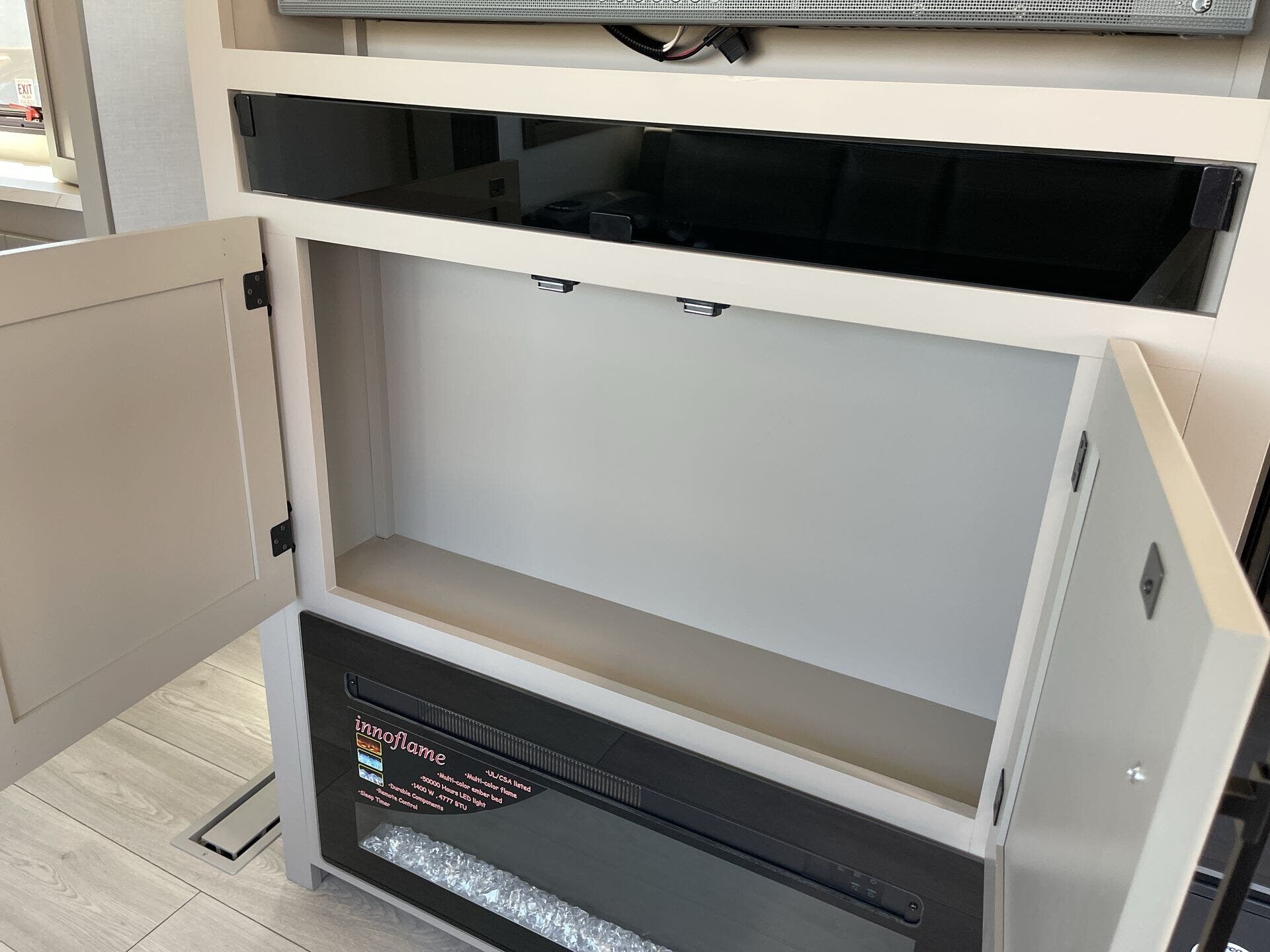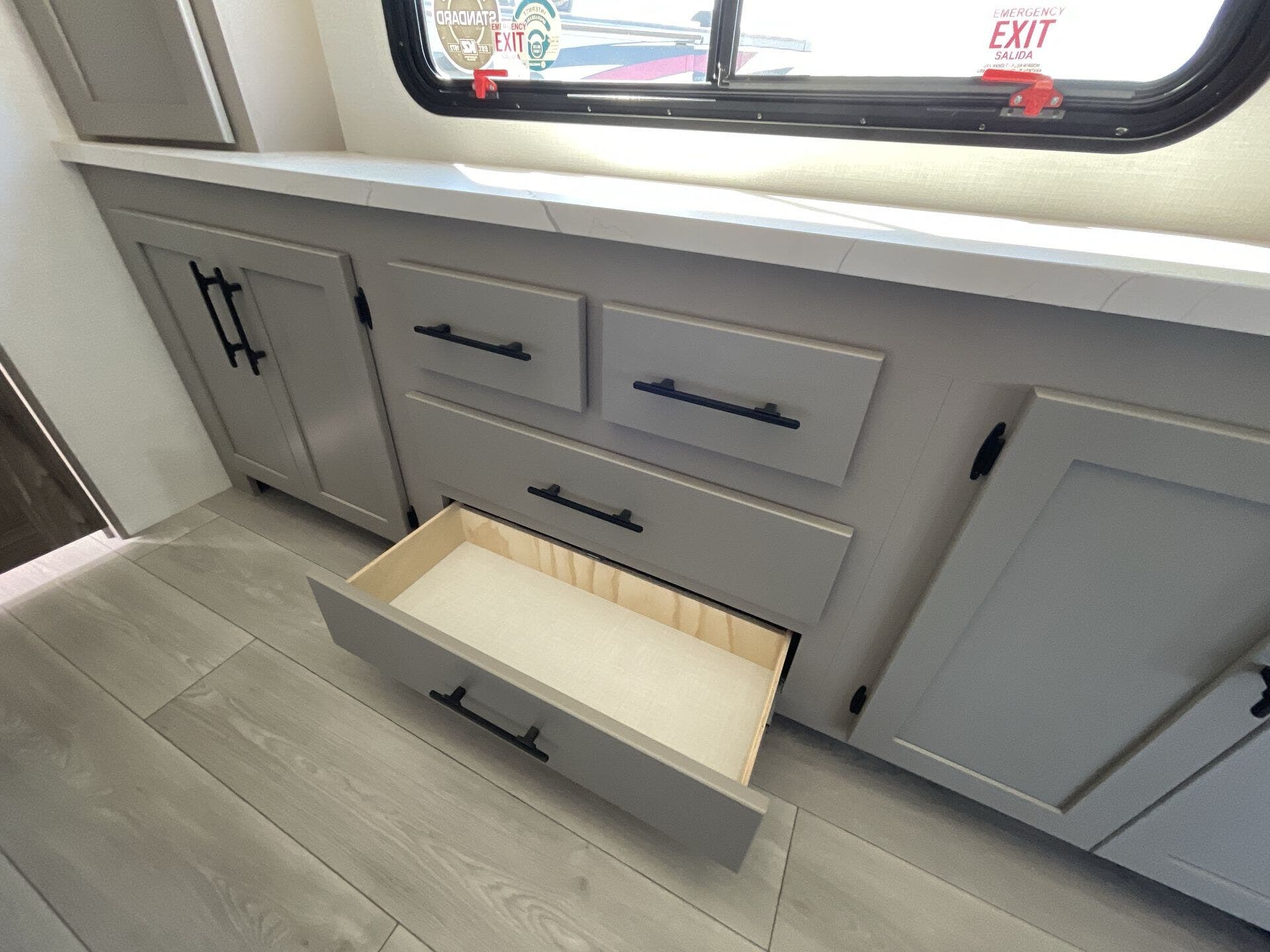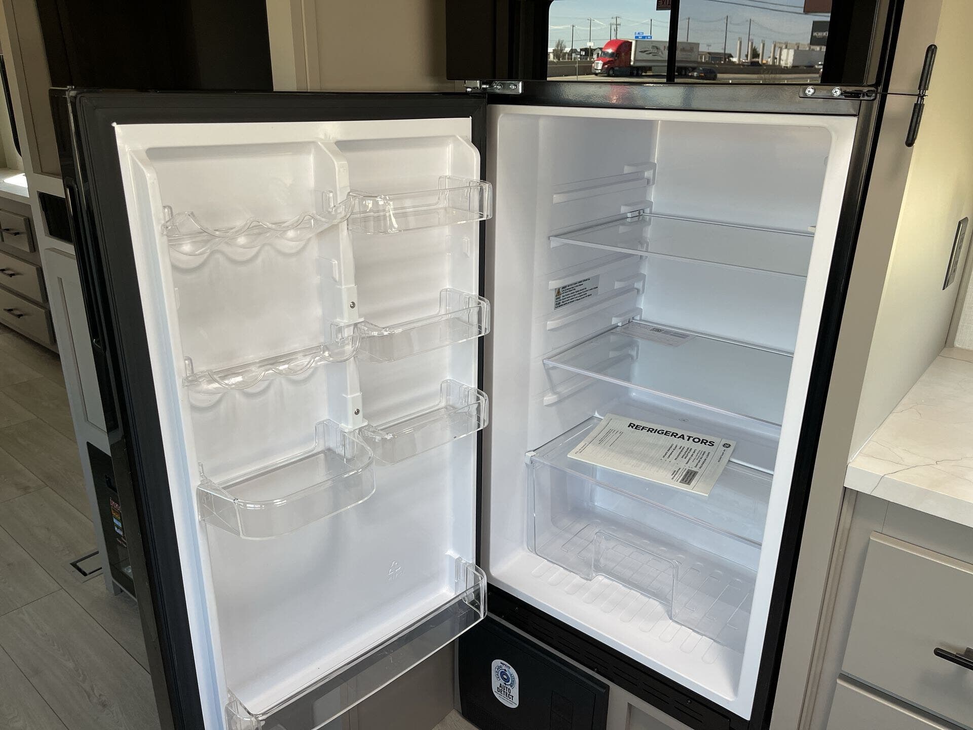 Inside, the 302FBK features a front kitchen floorplan that maximizes both functionality and comfort. The gourmet kitchen is equipped with solid-surface countertops, a three-burner cooktop, oven, refrigerator, and abundant cabinetry, making meal prep simple and efficient. The main living area includes theater seating, a sofa, and an entertainment center, creating a welcoming space for relaxing, entertaining, or spending quality time with family and friends. Large panoramic windows flood the interior with natural light, adding to the open, airy feel.