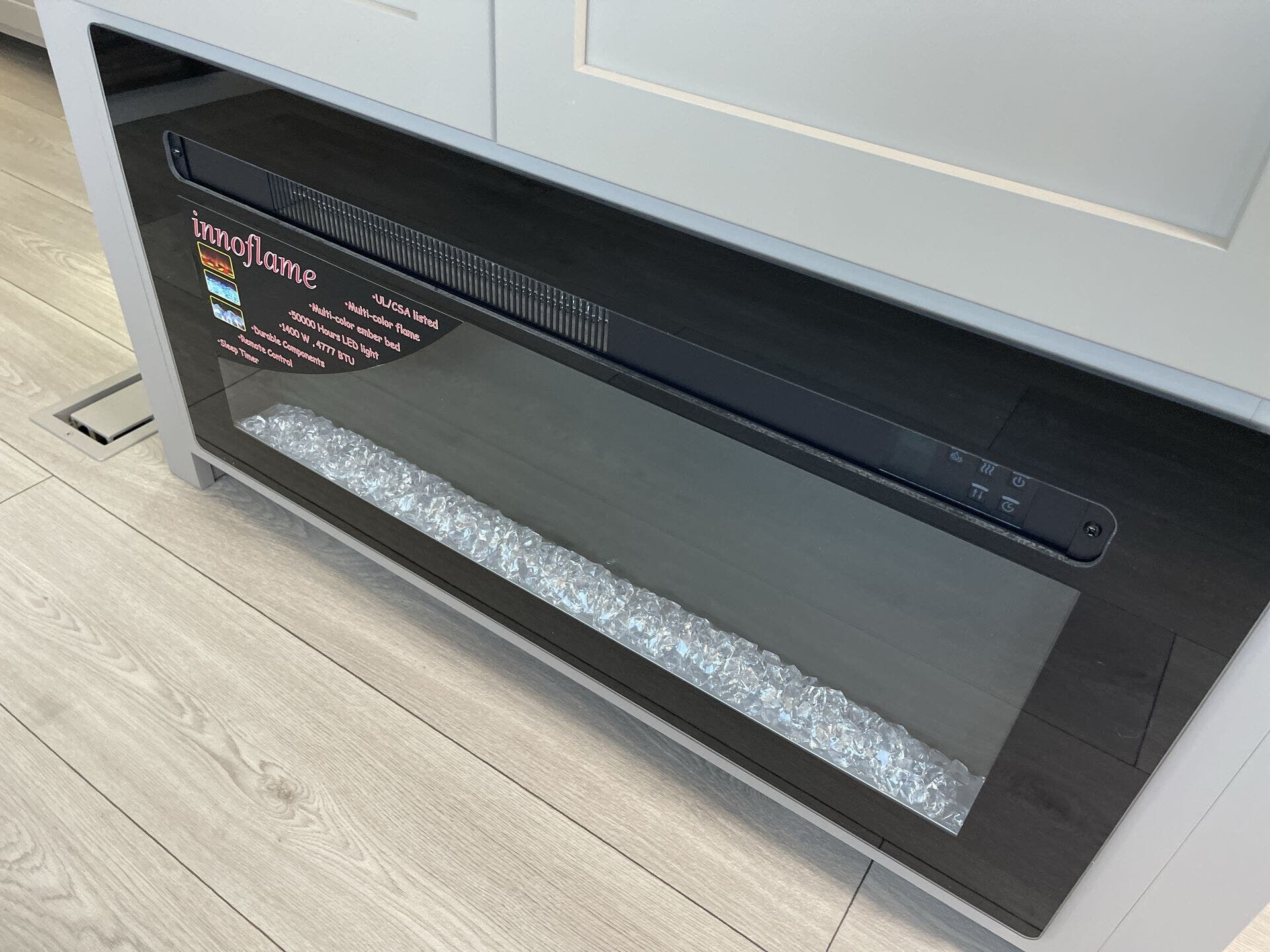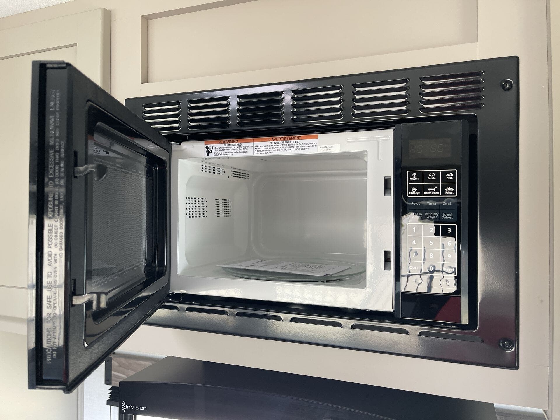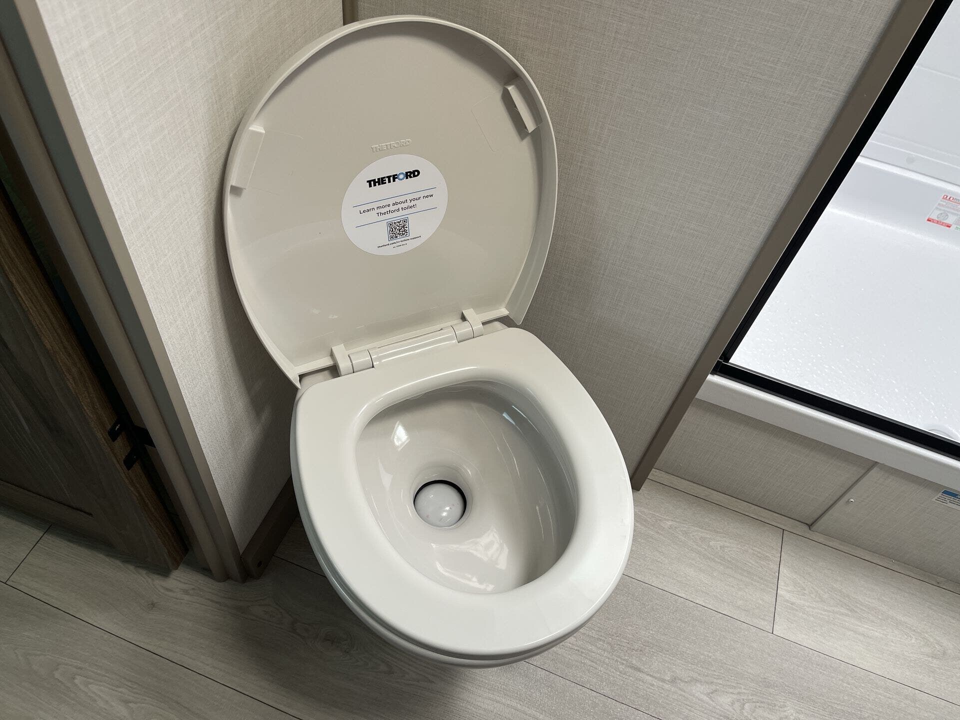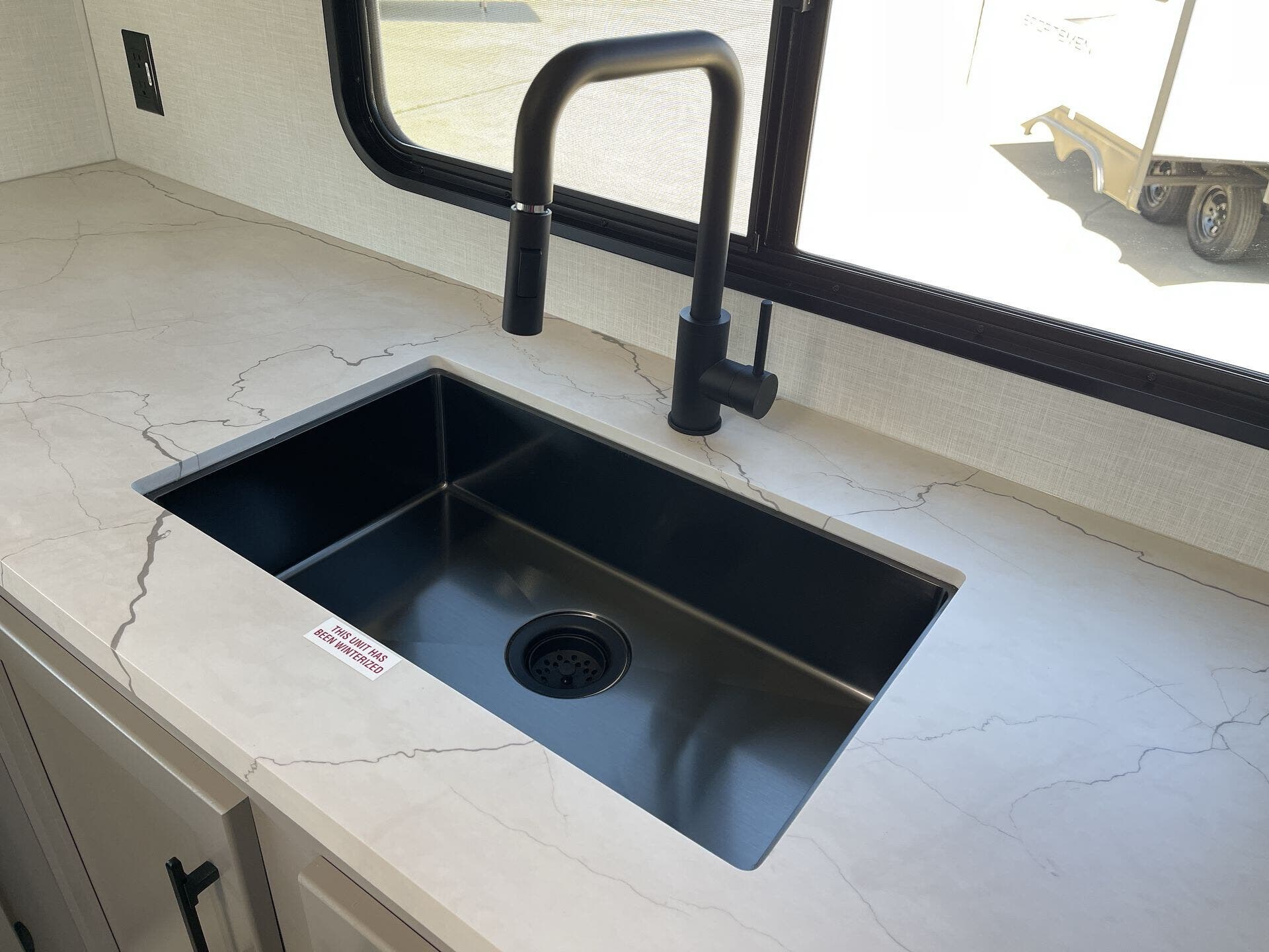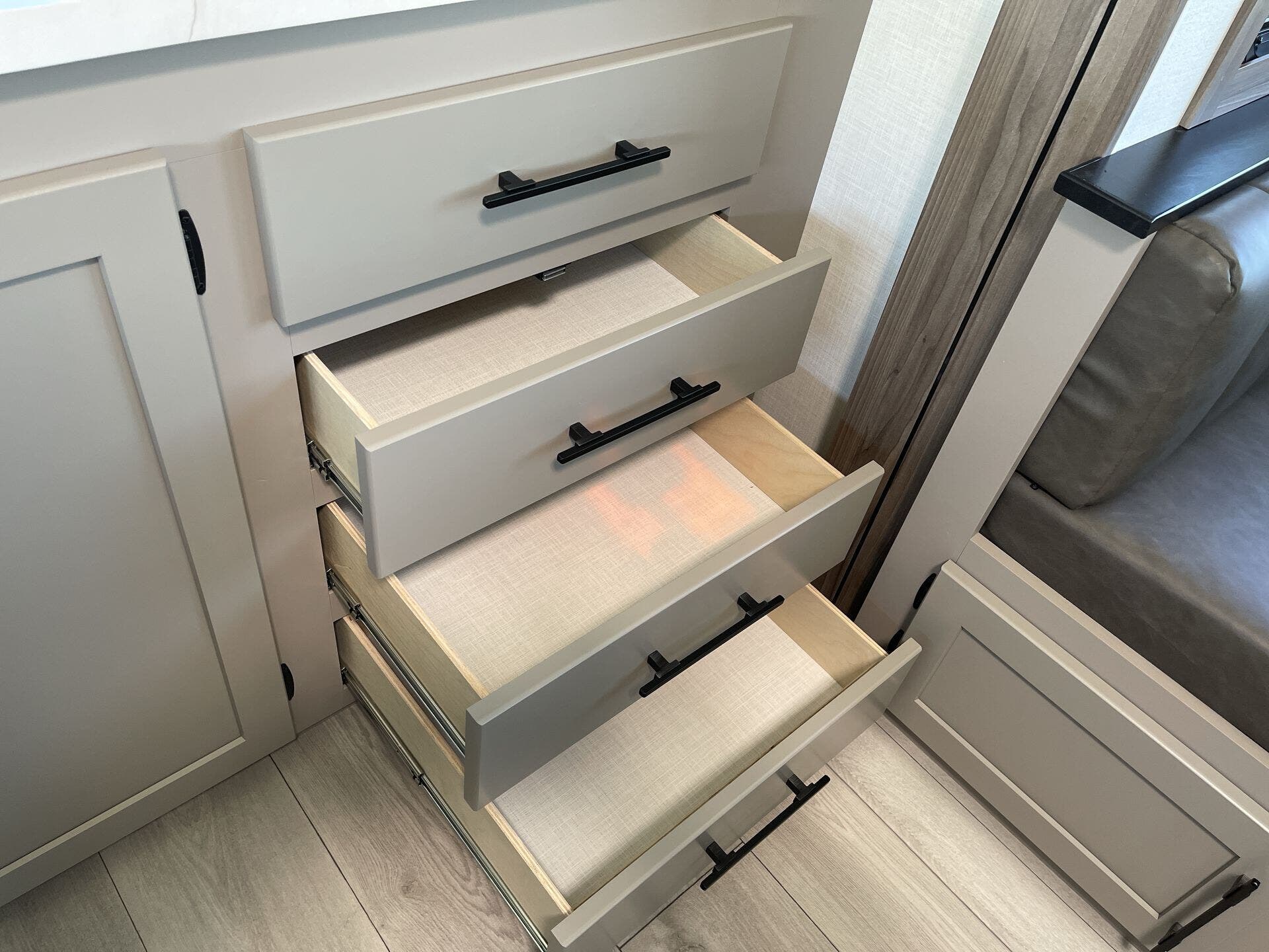 Inside, the 302FBK features a front kitchen floorplan that maximizes both functionality and comfort. The gourmet kitchen is equipped with solid-surface countertops, a three-burner cooktop, oven, refrigerator, and abundant cabinetry, making meal prep simple and efficient. The main living area includes theater seating, a sofa, and an entertainment center, creating a welcoming space for relaxing, entertaining, or spending quality time with family and friends. Large panoramic windows flood the interior with natural light, adding to the open, airy feel.