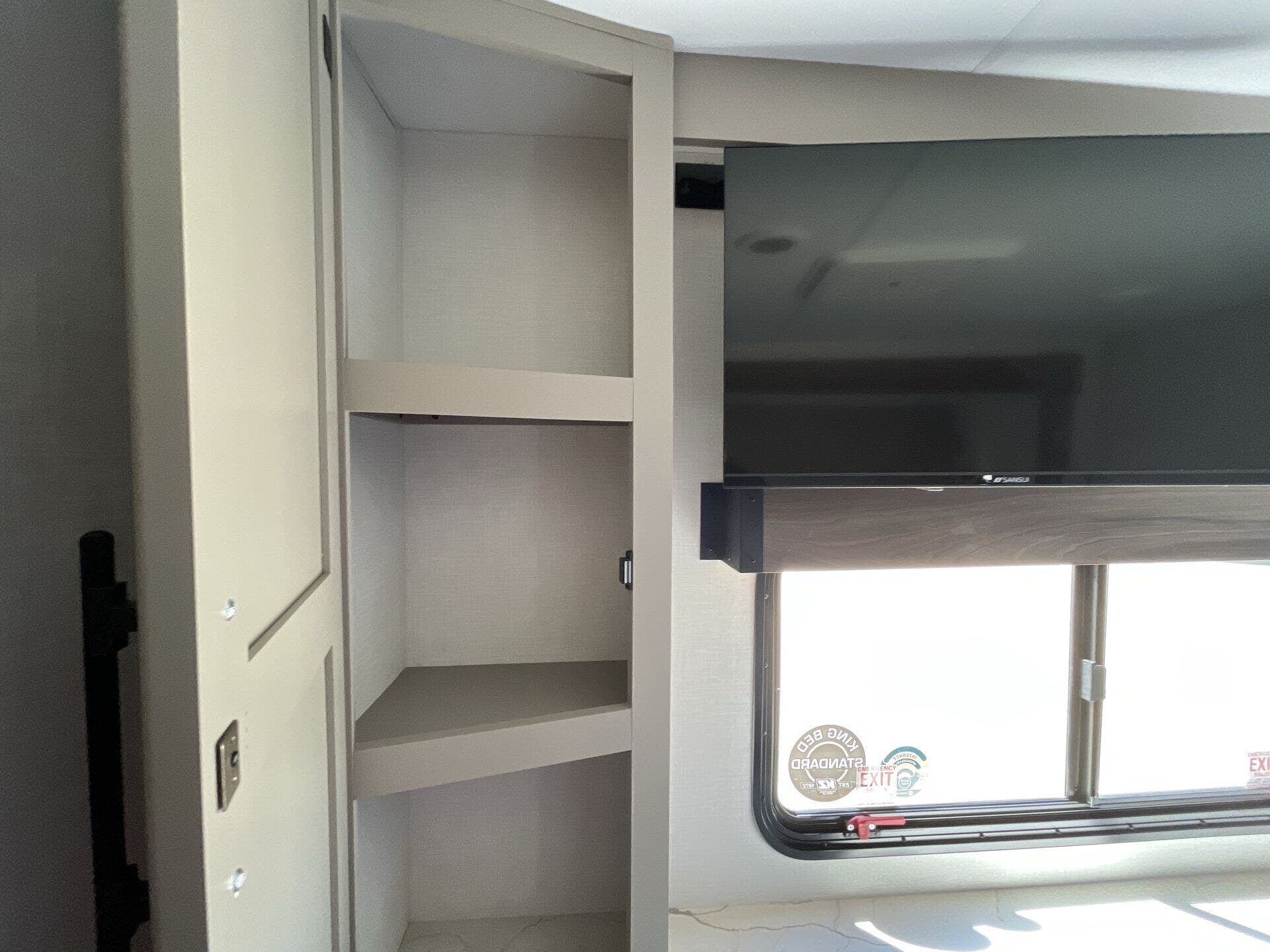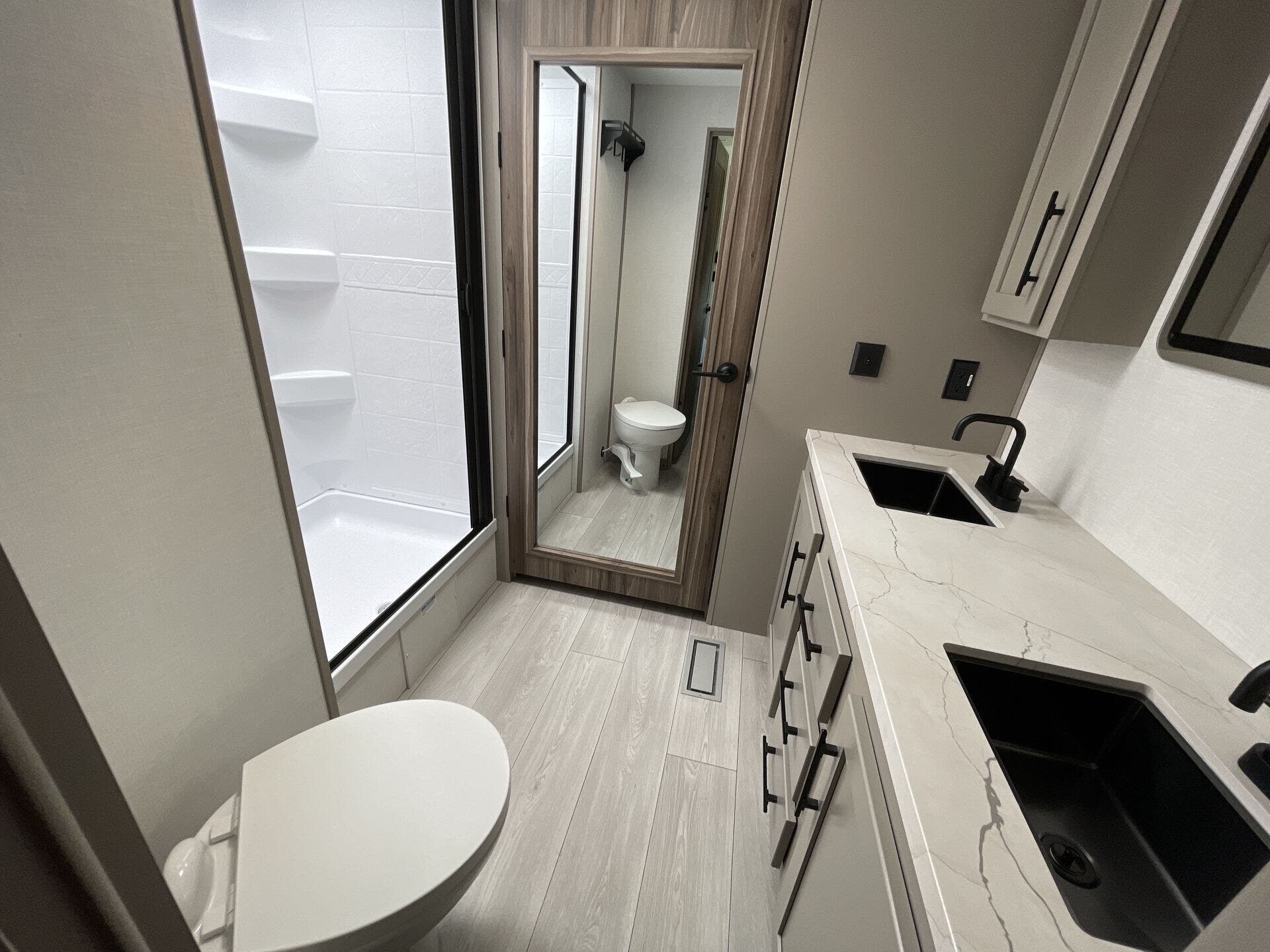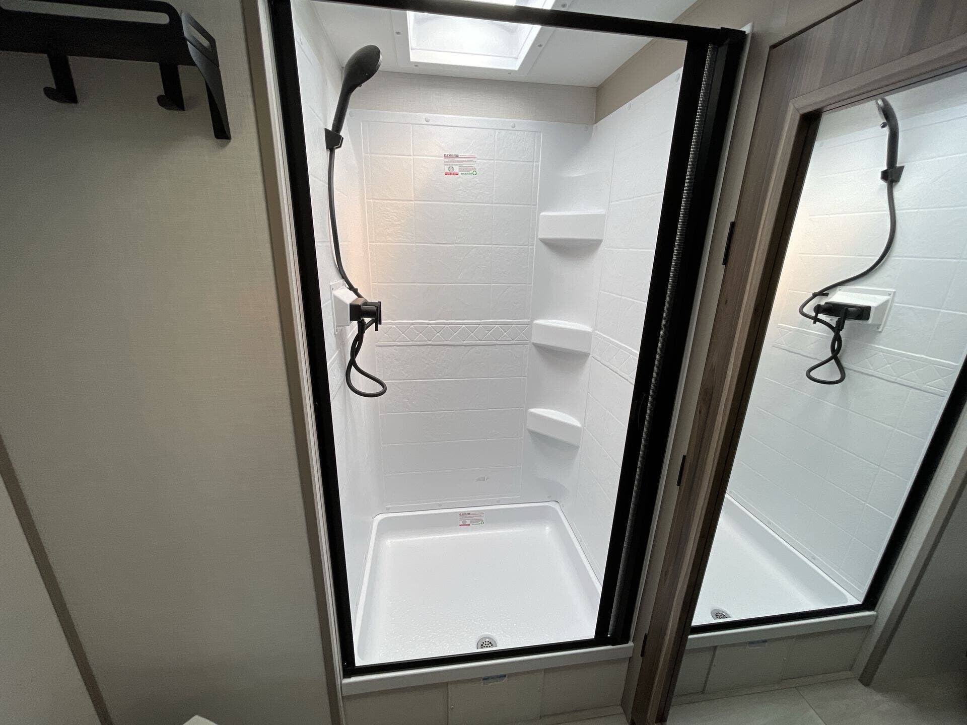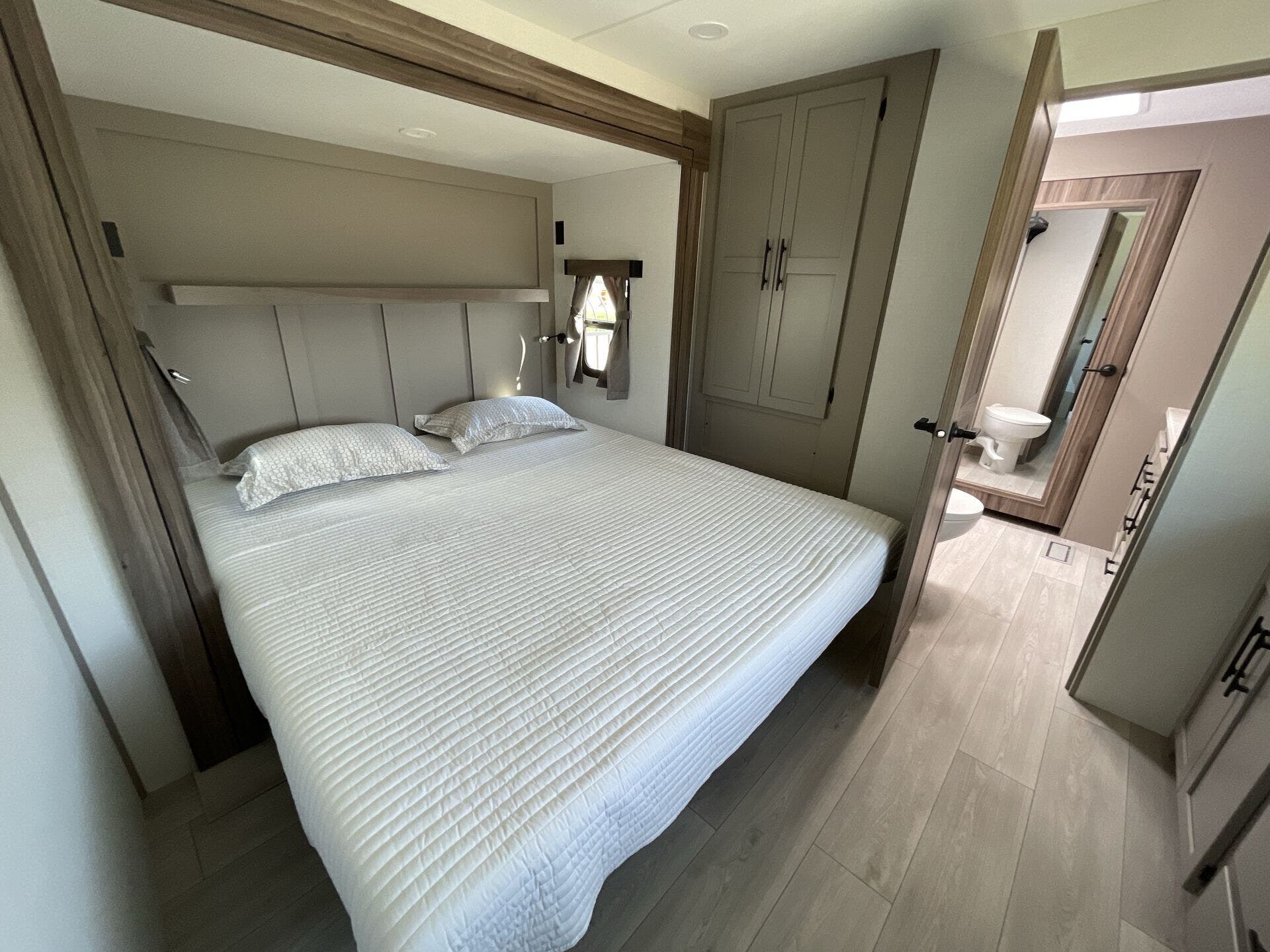 The private rear bedroom offers a cozy retreat with a comfortable bed, wardrobe storage, and convenient access to the spacious bathroom, which includes a residential-style shower and modern finishes. Designed for extended comfort, the Connect 302FBK also includes efficient climate control, user-friendly systems, and optional solar prep for off-grid adventures. Whether traveling cross-country, exploring scenic campgrounds, or enjoying a quiet getaway, the 2026 K-Z Connect 302FBK delivers a perfect blend of luxury, practicality, and convenience for every journey.