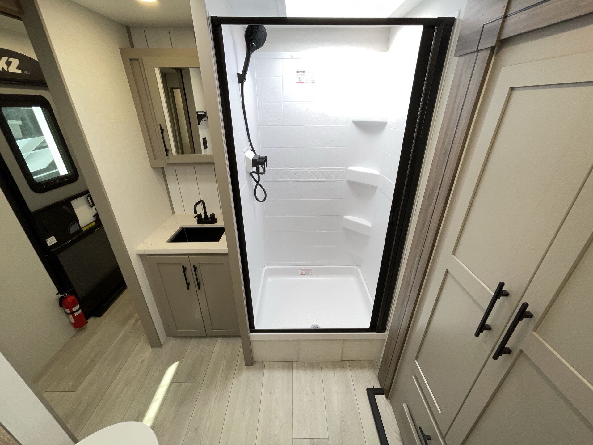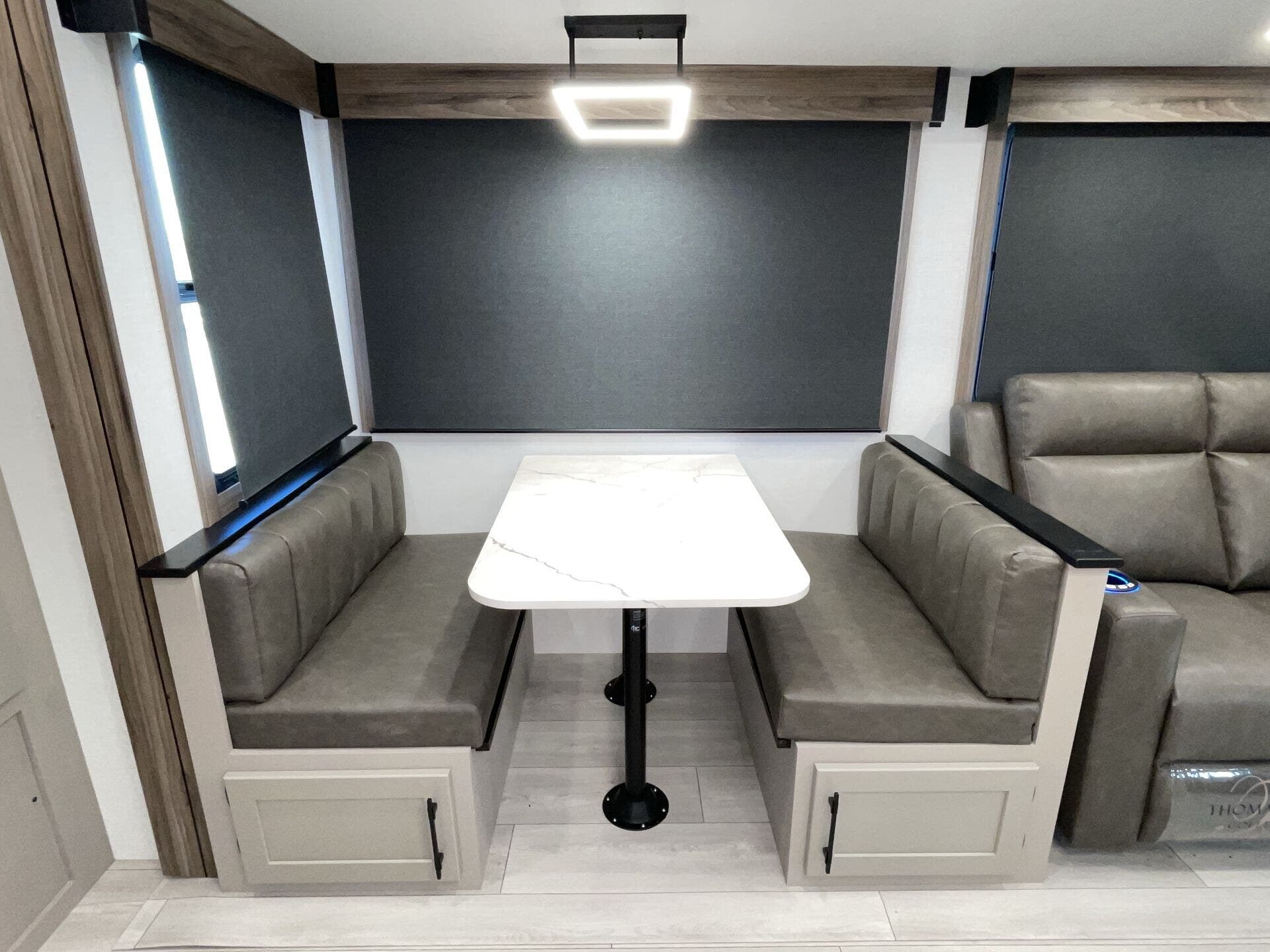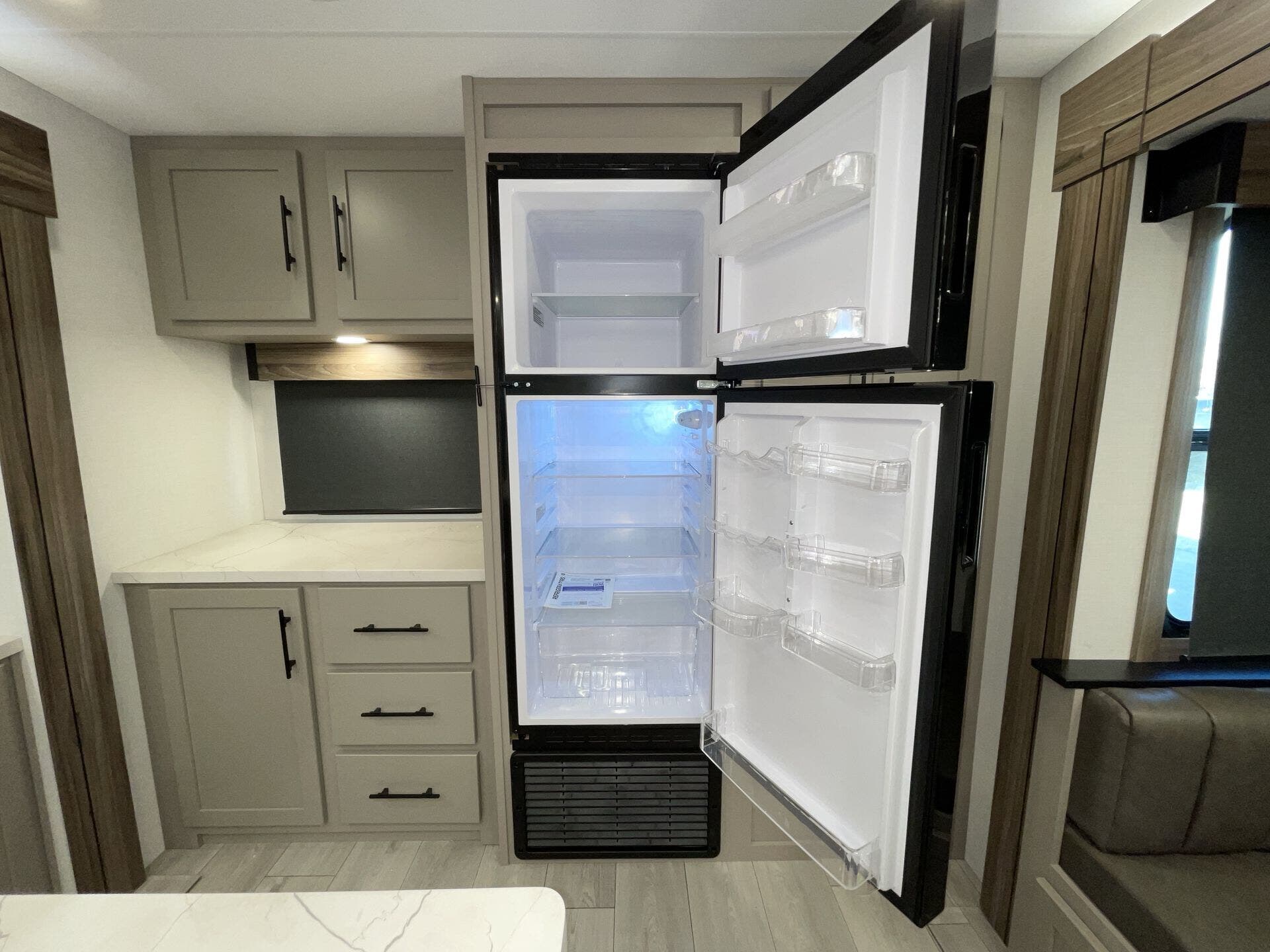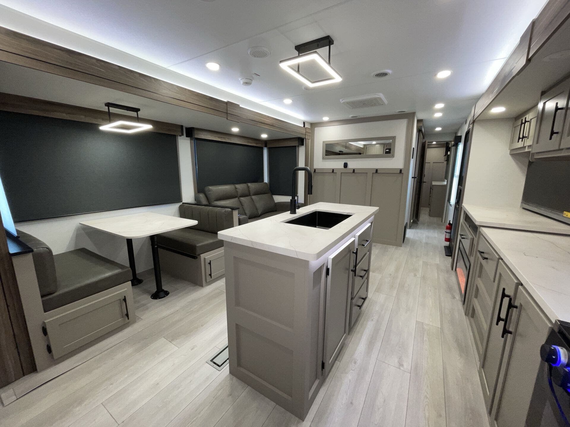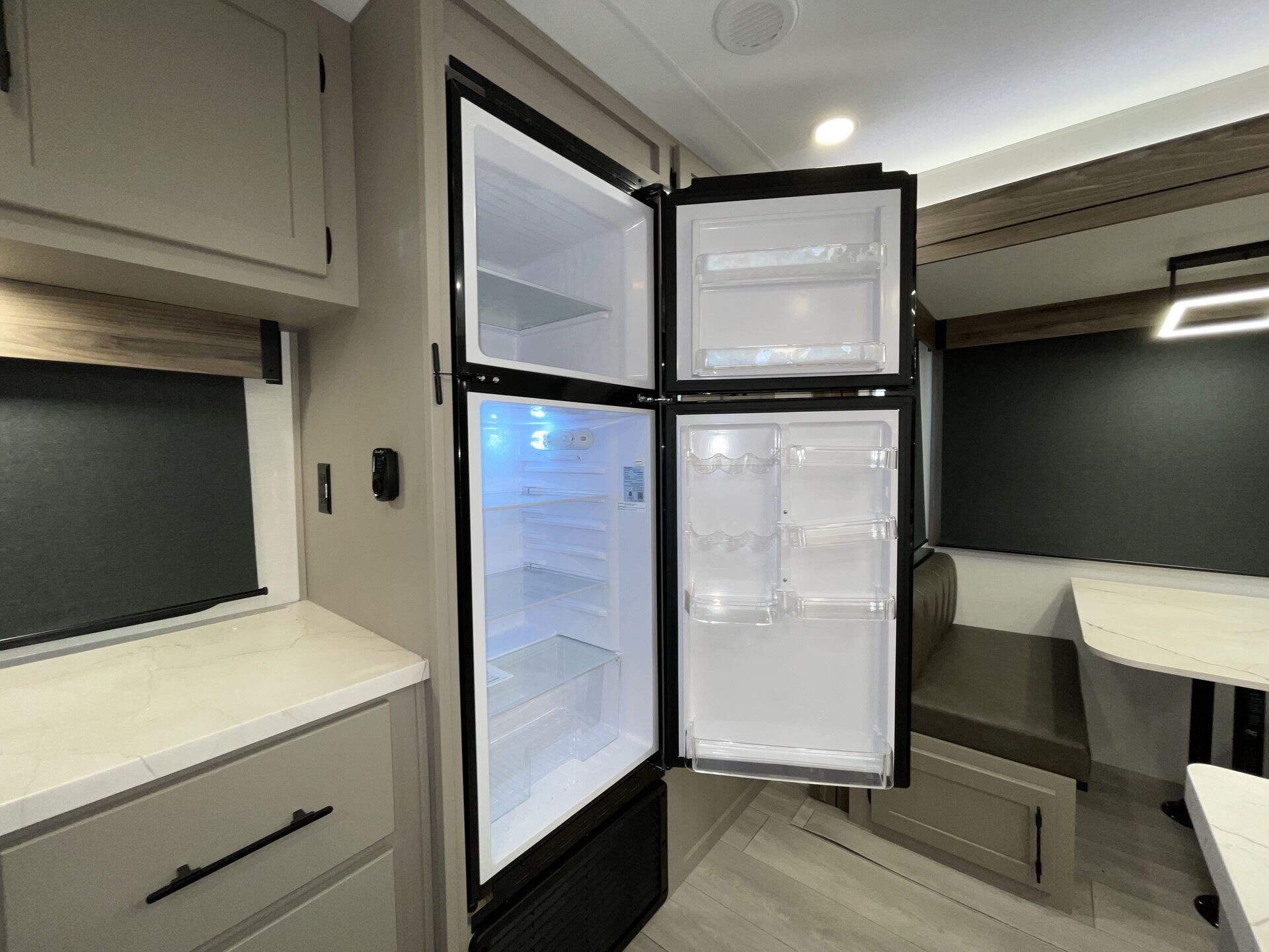 Up front, the private bedroom offers a comfortable queen bed along with wardrobe storage and a desk so you can settle in and feel at home. The bathroom is roomy and practical for longer trips, and the overall layout is designed to make everyday living simple. With three slides, a length of about 38'7", and solid tank capacity for extended camping, the 333RLK delivers a residential feel while still being a towable travel trailer.