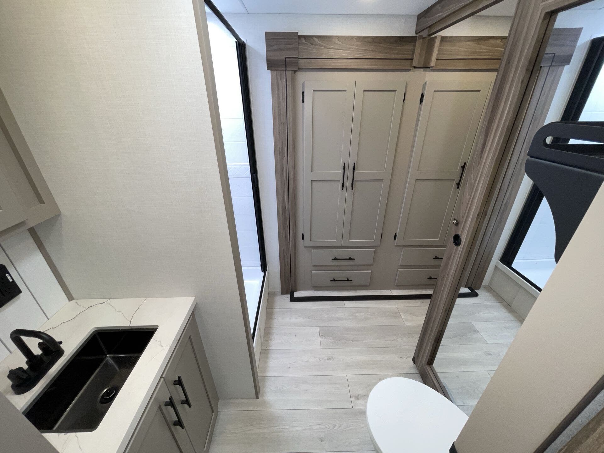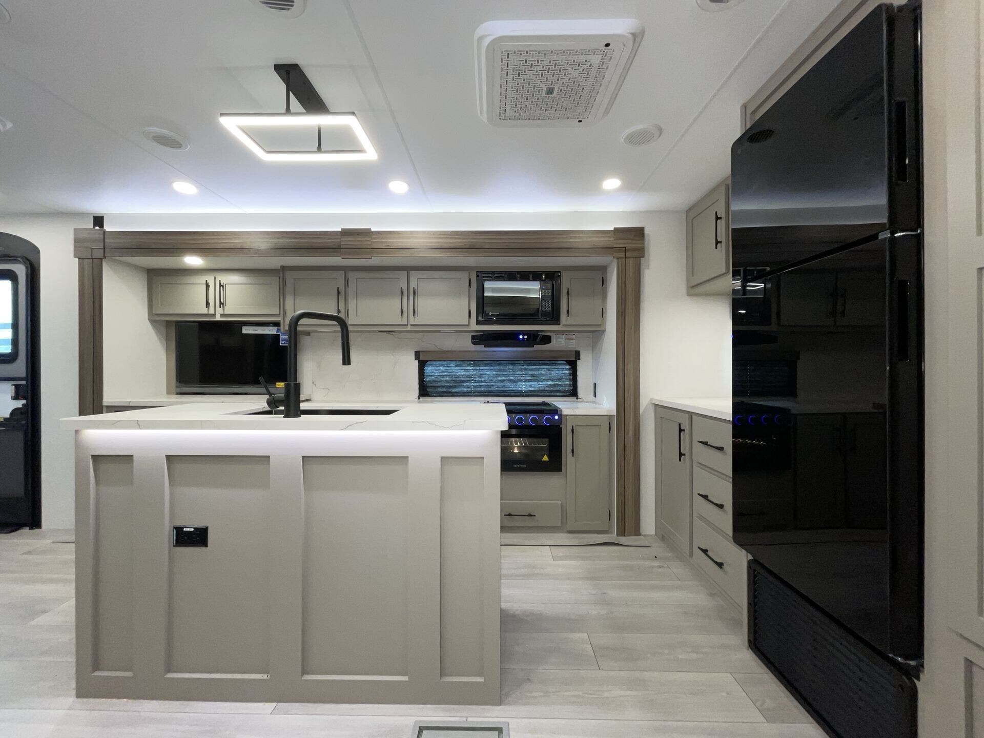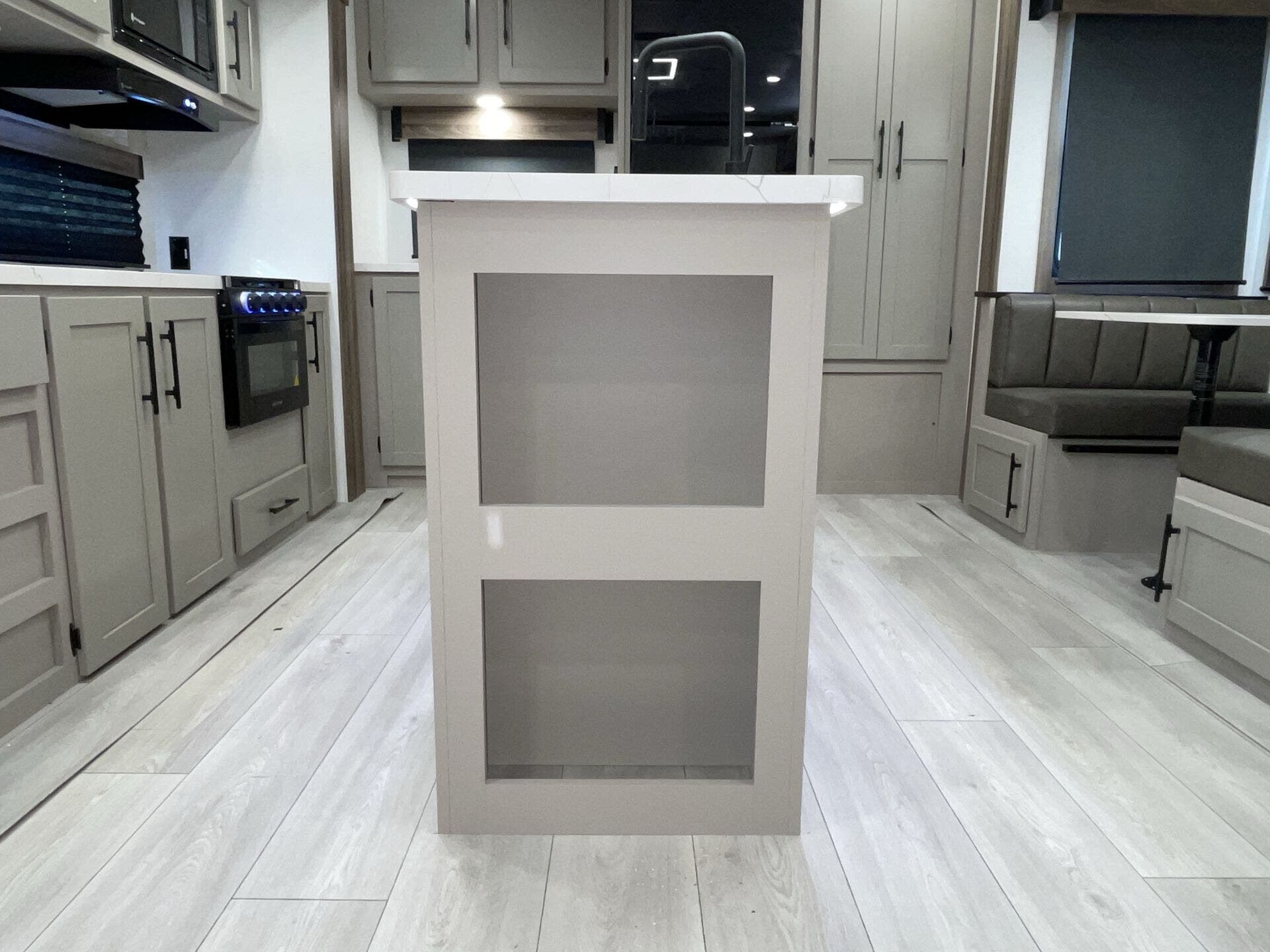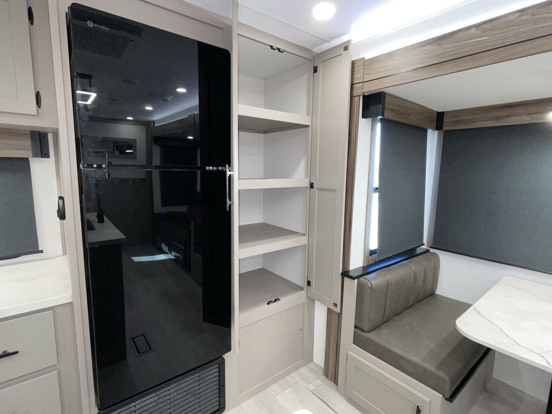 Up front, the private bedroom offers a comfortable queen bed along with wardrobe storage and a desk so you can settle in and feel at home. The bathroom is roomy and practical for longer trips, and the overall layout is designed to make everyday living simple. With three slides, a length of about 38'7", and solid tank capacity for extended camping, the 333RLK delivers a residential feel while still being a towable travel trailer.