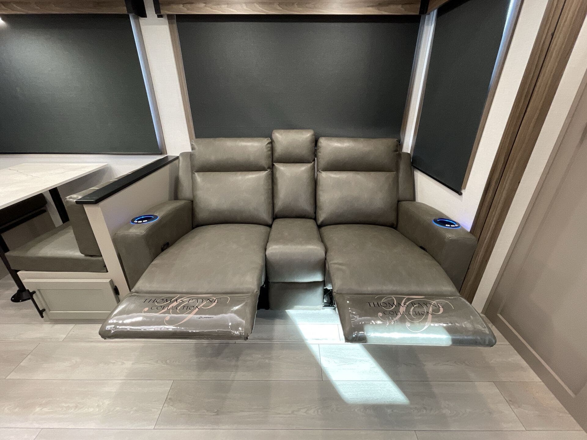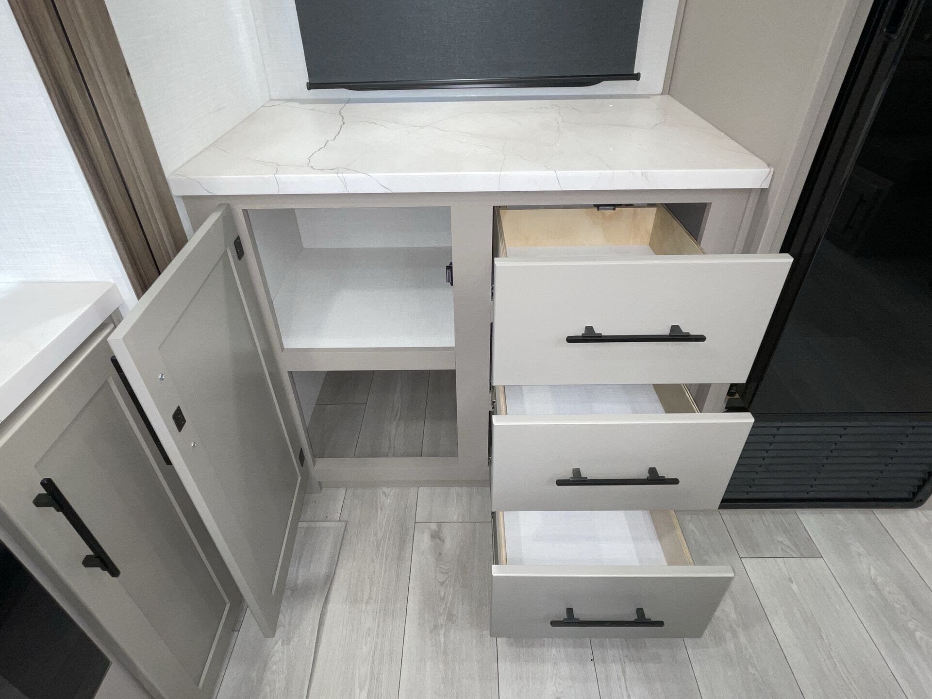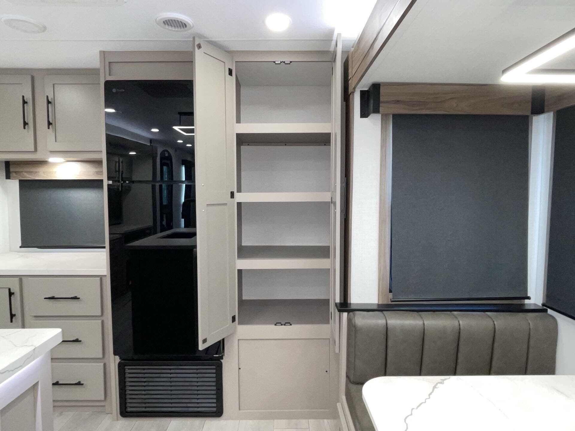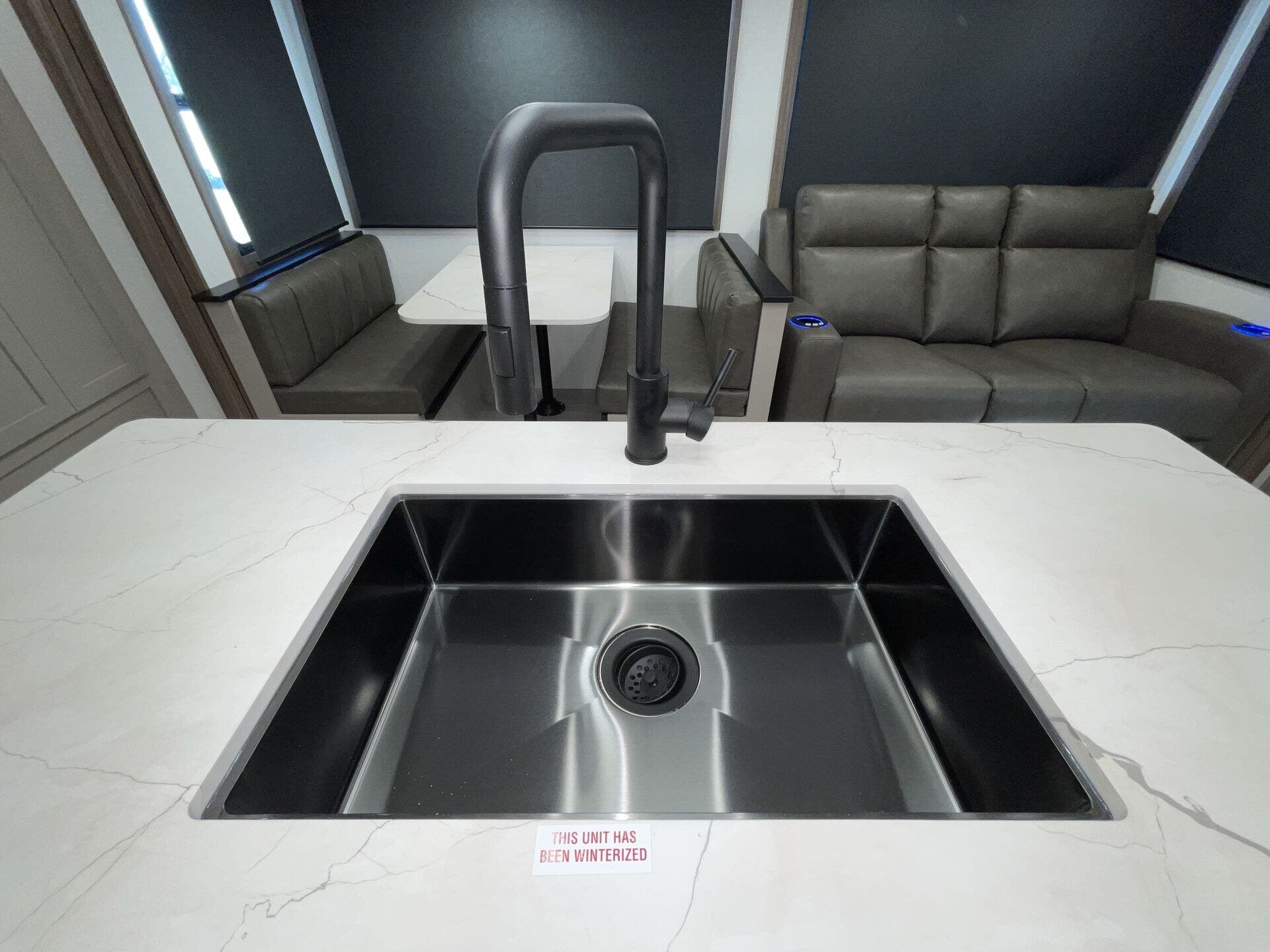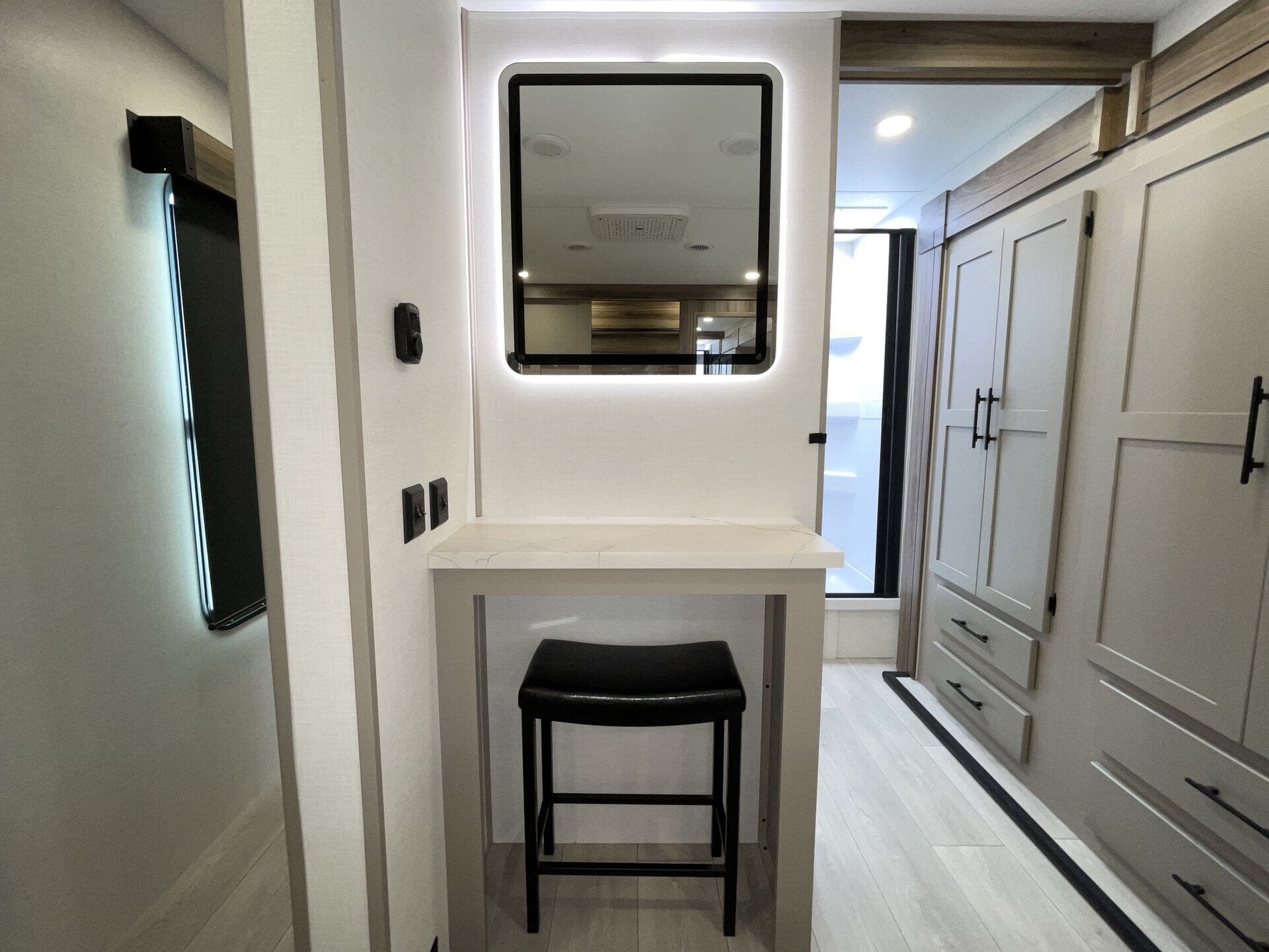 Up front, the private bedroom offers a comfortable queen bed along with wardrobe storage and a desk so you can settle in and feel at home. The bathroom is roomy and practical for longer trips, and the overall layout is designed to make everyday living simple. With three slides, a length of about 38'7", and solid tank capacity for extended camping, the 333RLK delivers a residential feel while still being a towable travel trailer.
