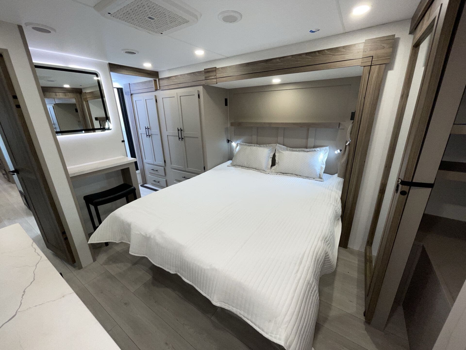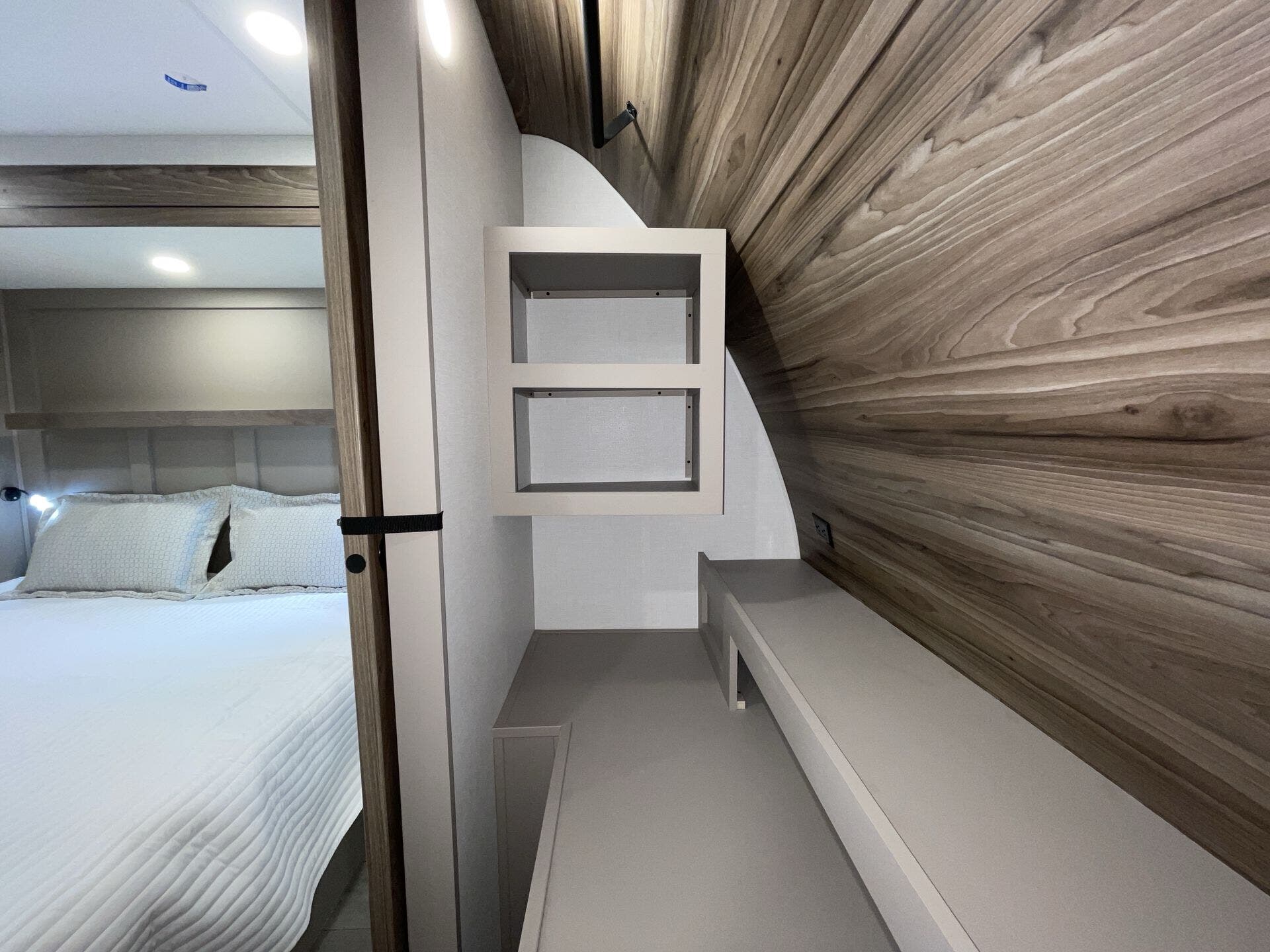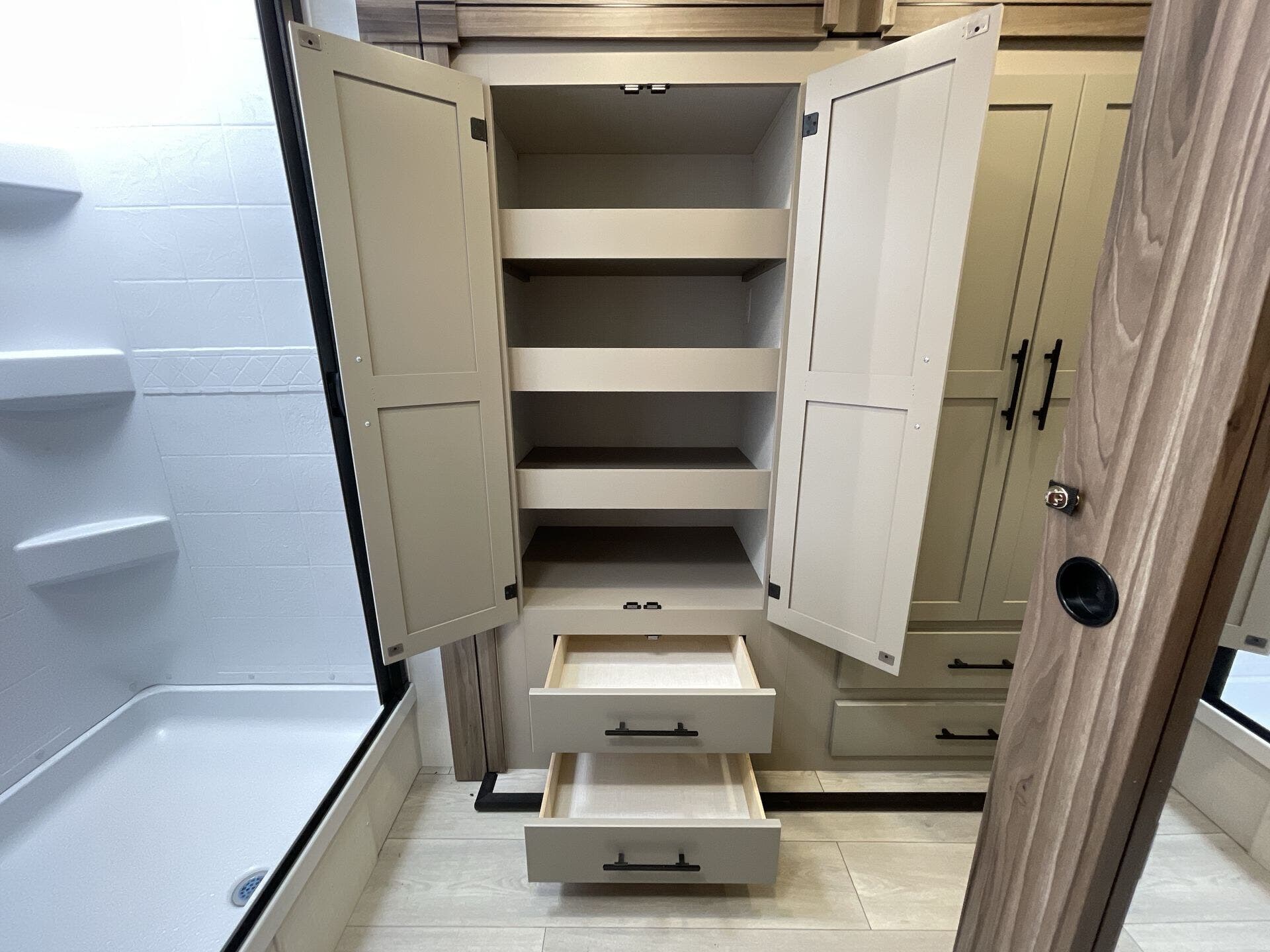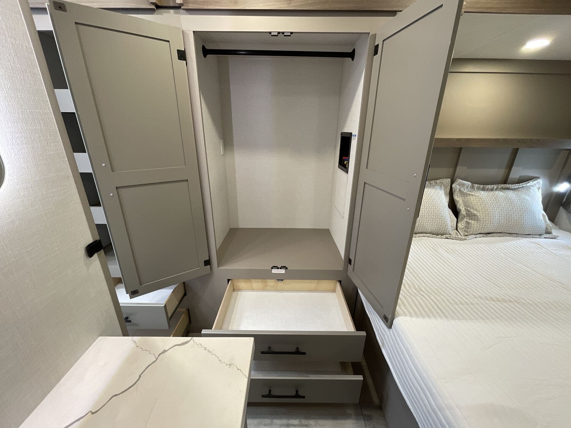 Up front, the private bedroom offers a comfortable queen bed along with wardrobe storage and a desk so you can settle in and feel at home. The bathroom is roomy and practical for longer trips, and the overall layout is designed to make everyday living simple. With three slides, a length of about 38'7", and solid tank capacity for extended camping, the 333RLK delivers a residential feel while still being a towable travel trailer.