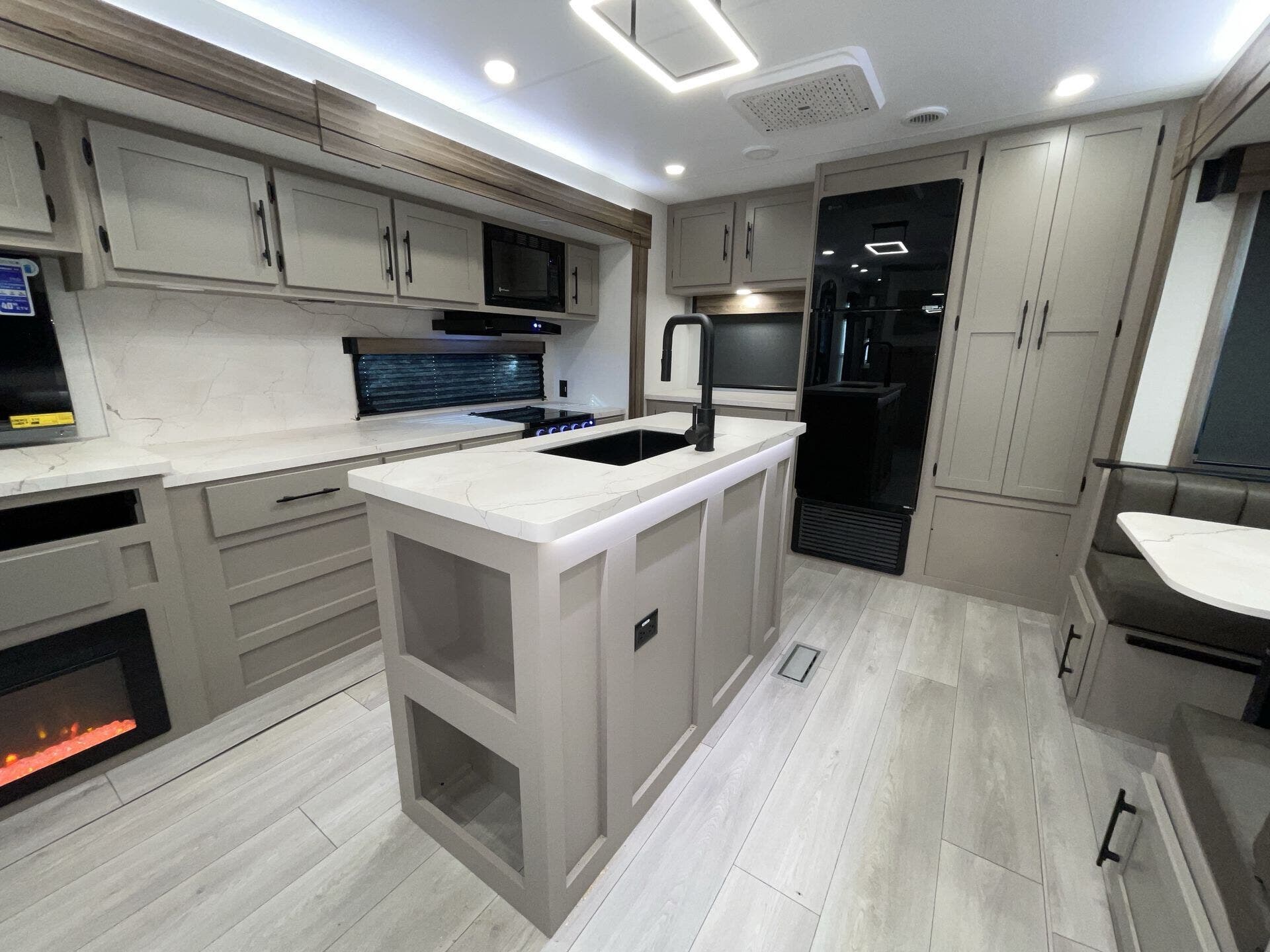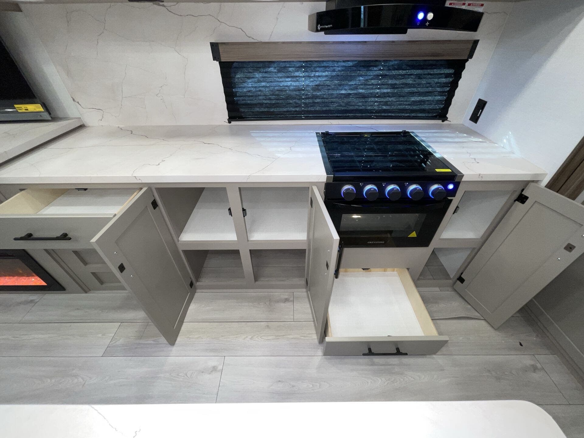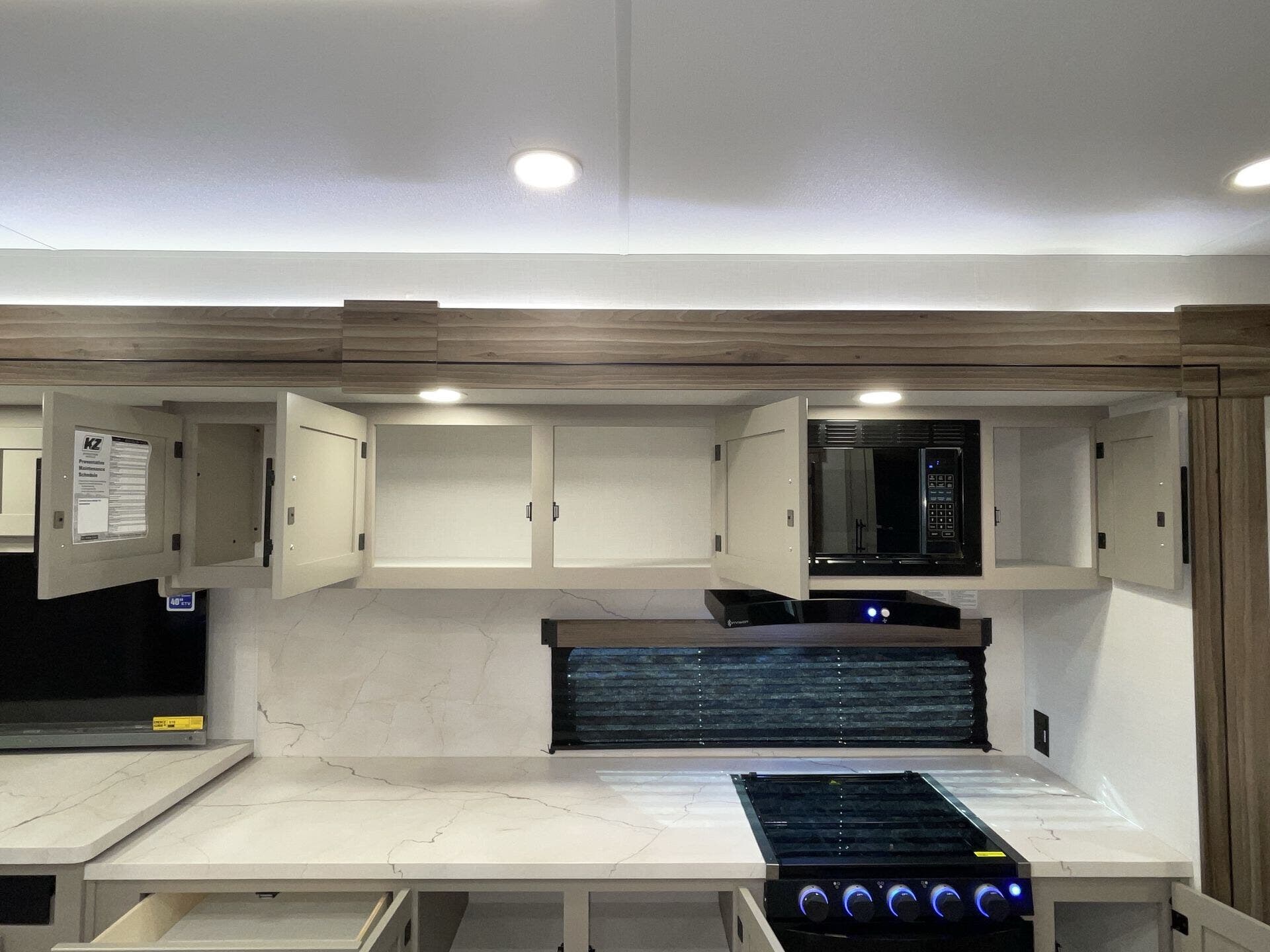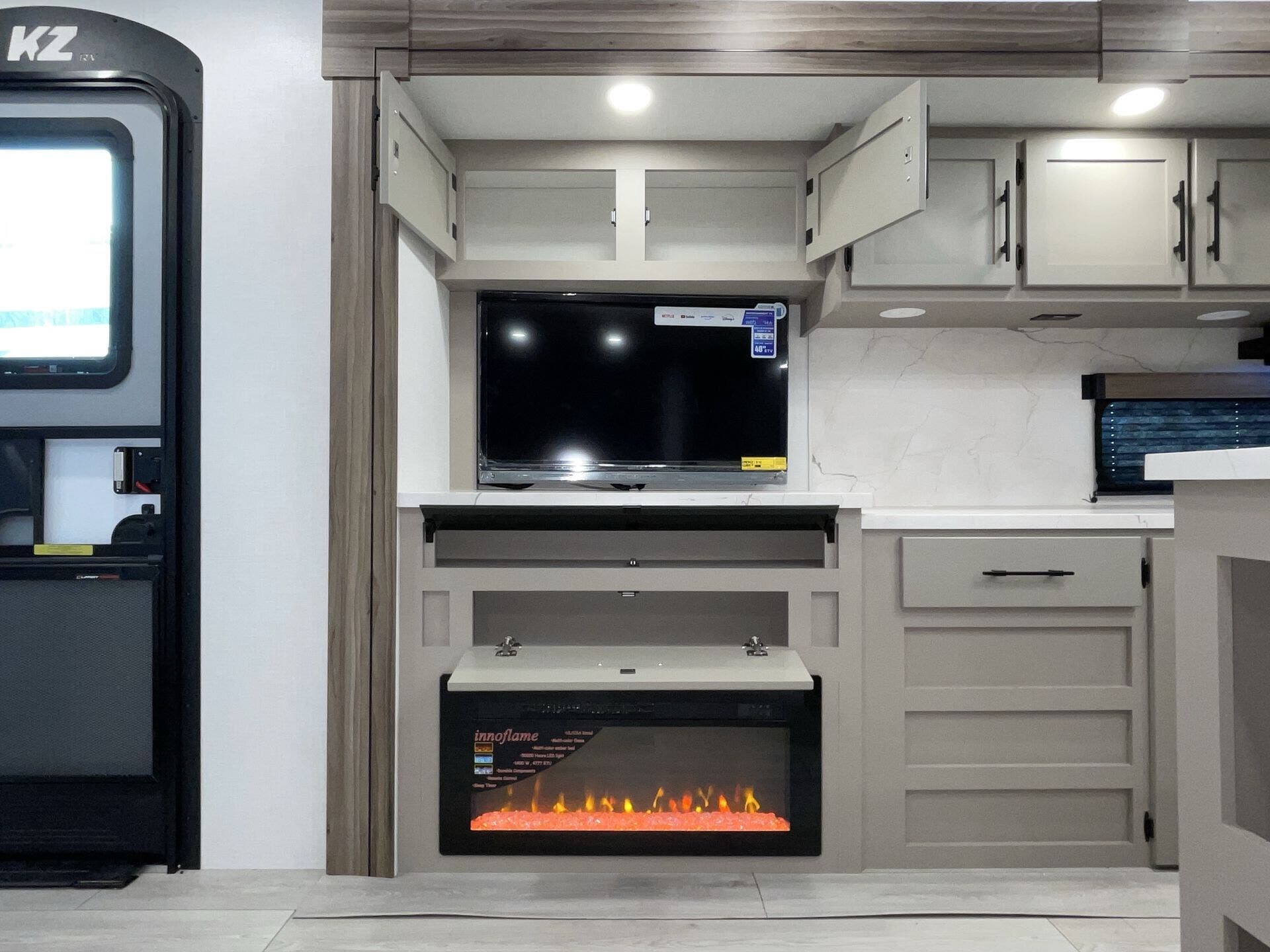 The 2026 K-Z Connect 333RLK is a spacious travel trailer built for comfort and longer stays at the campsite. The triple slide layout really opens up the interior, giving you a large rear living area with seating, a fireplace, and space to relax at the end of the day. The kitchen is set up in the center of the coach and features a large island, good counter space, and plenty of cabinets, making it easy to cook and stay organized while traveling.