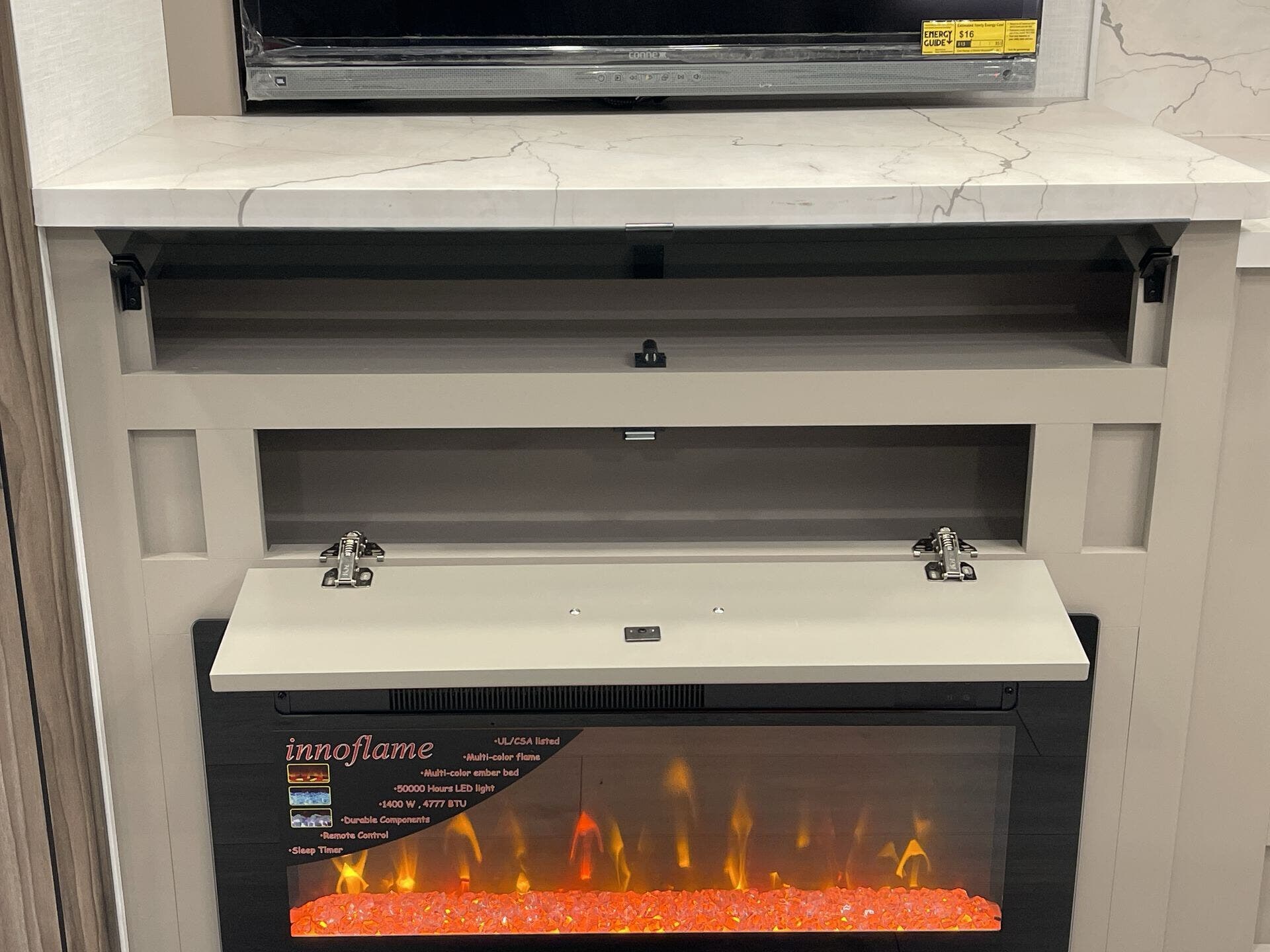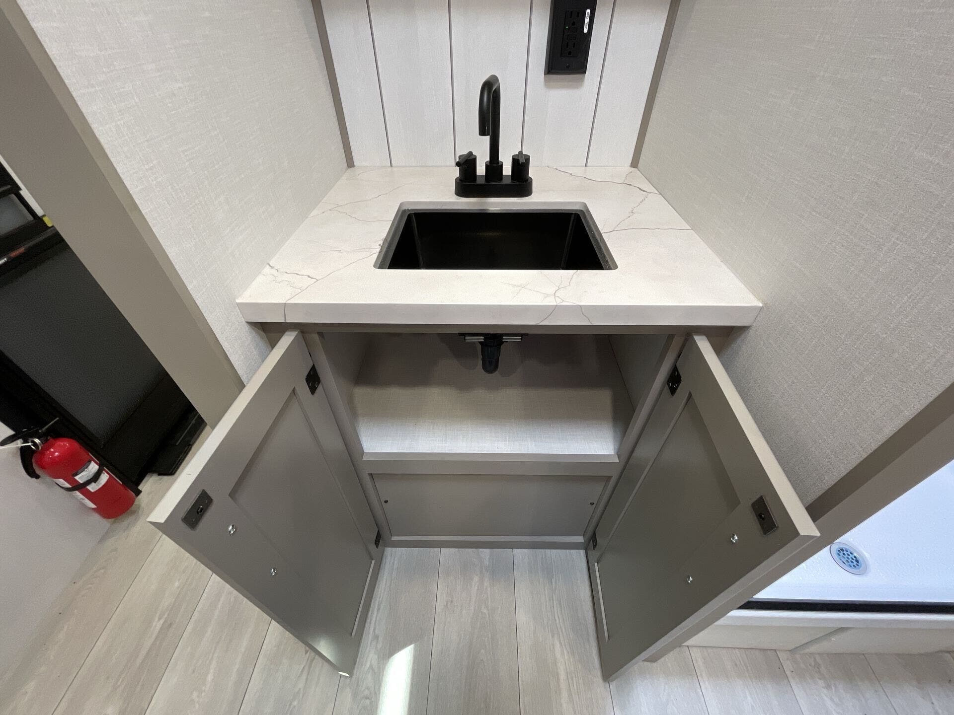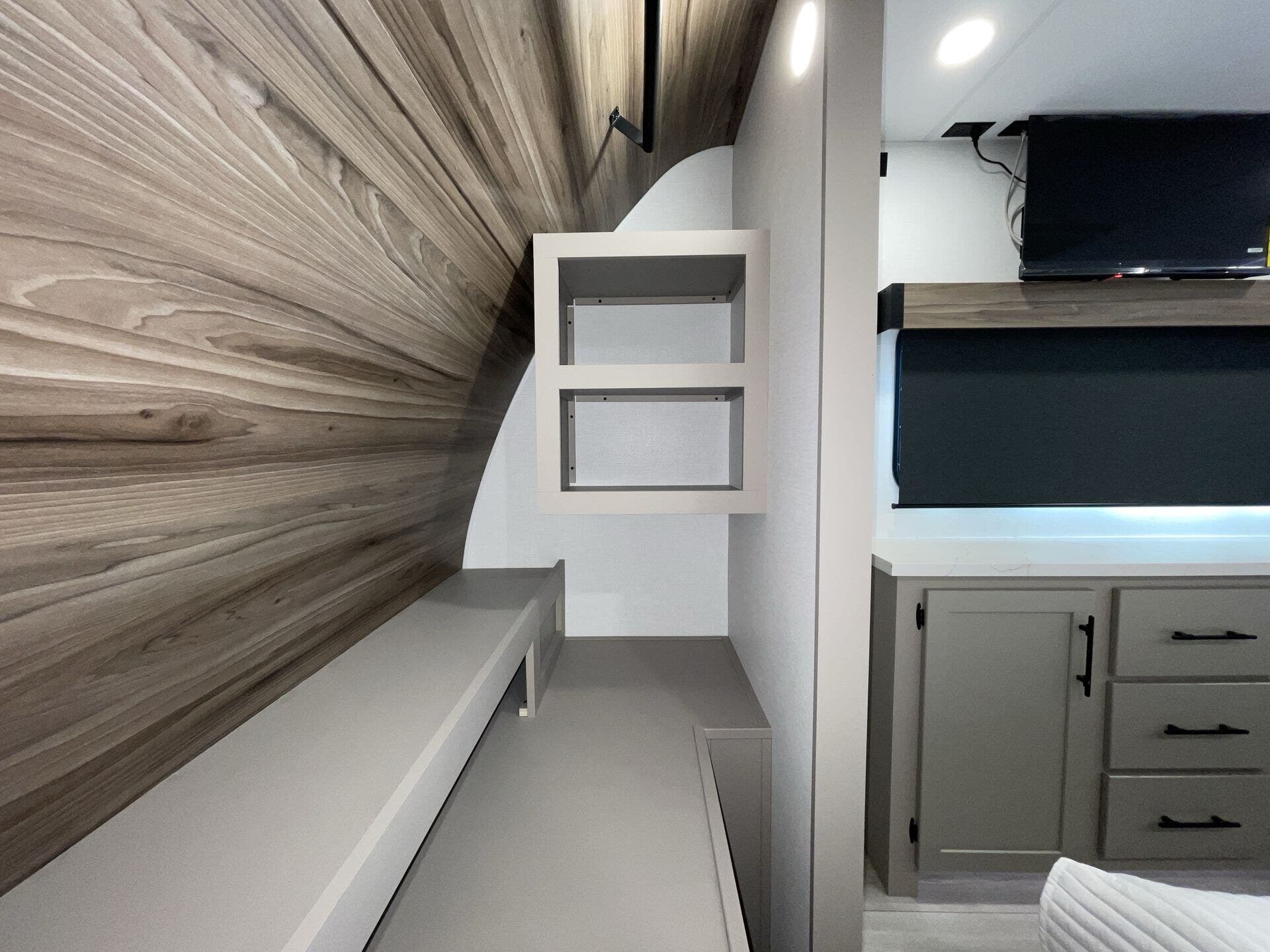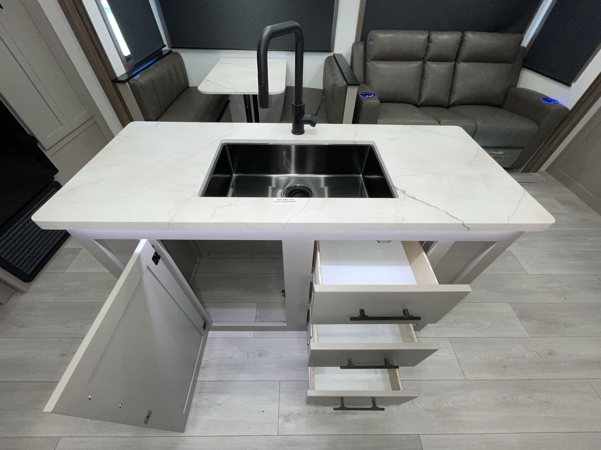 The 2026 K-Z Connect 333RLK is a spacious travel trailer built for comfort and longer stays at the campsite. The triple slide layout really opens up the interior, giving you a large rear living area with seating, a fireplace, and space to relax at the end of the day. The kitchen is set up in the center of the coach and features a large island, good counter space, and plenty of cabinets, making it easy to cook and stay organized while traveling.