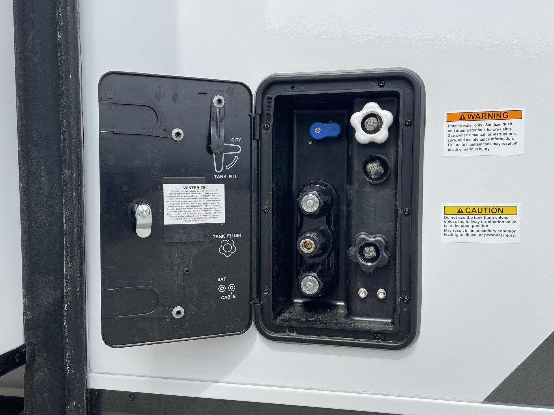 Awning, Black Tank Flush, Enclosed Underbelly, Exterior Speakers, Hitch, Ladder, Power Awning, Roof Deck, Roof Vent, Skylight, Slideout, Stabilizer Jacks -
