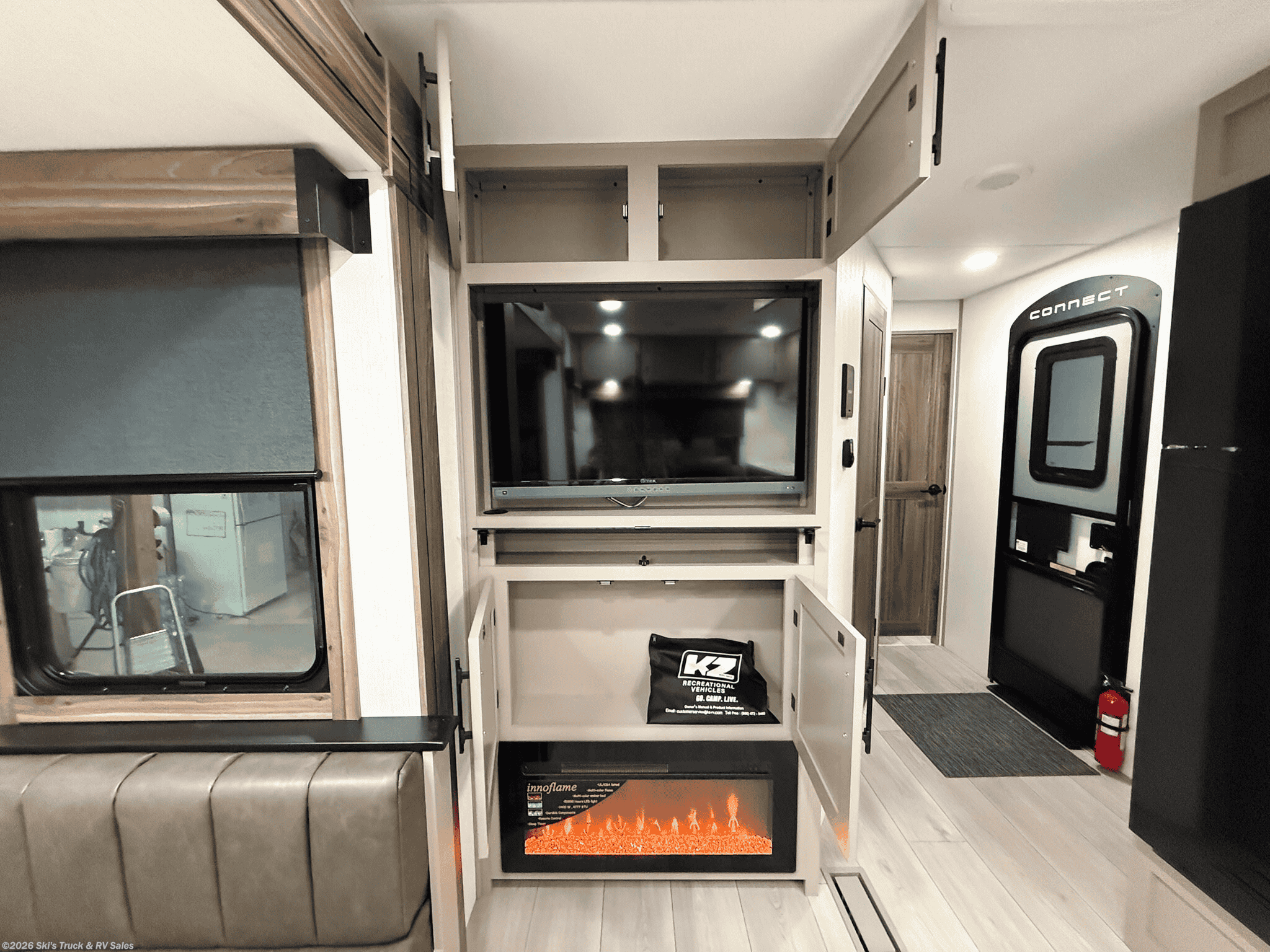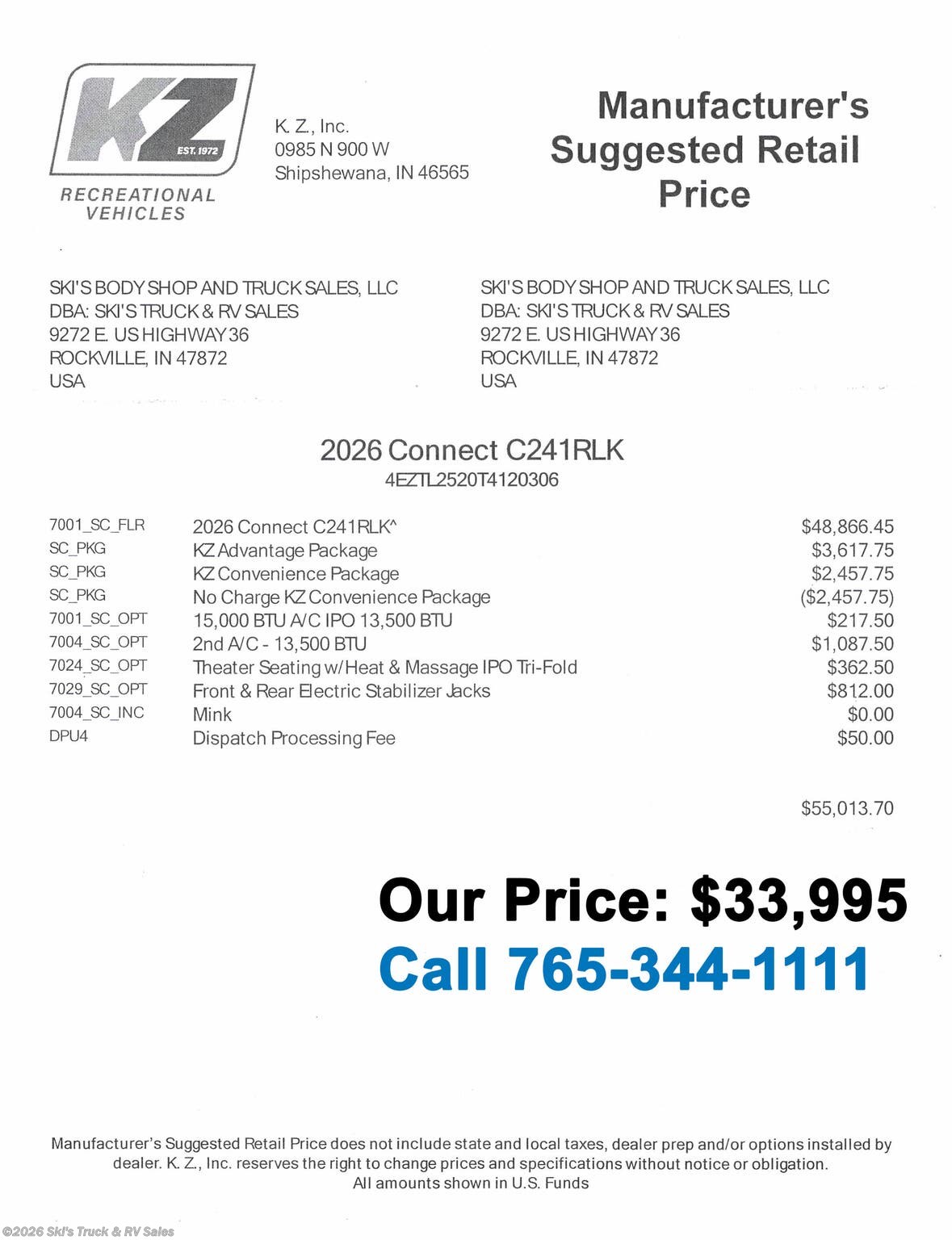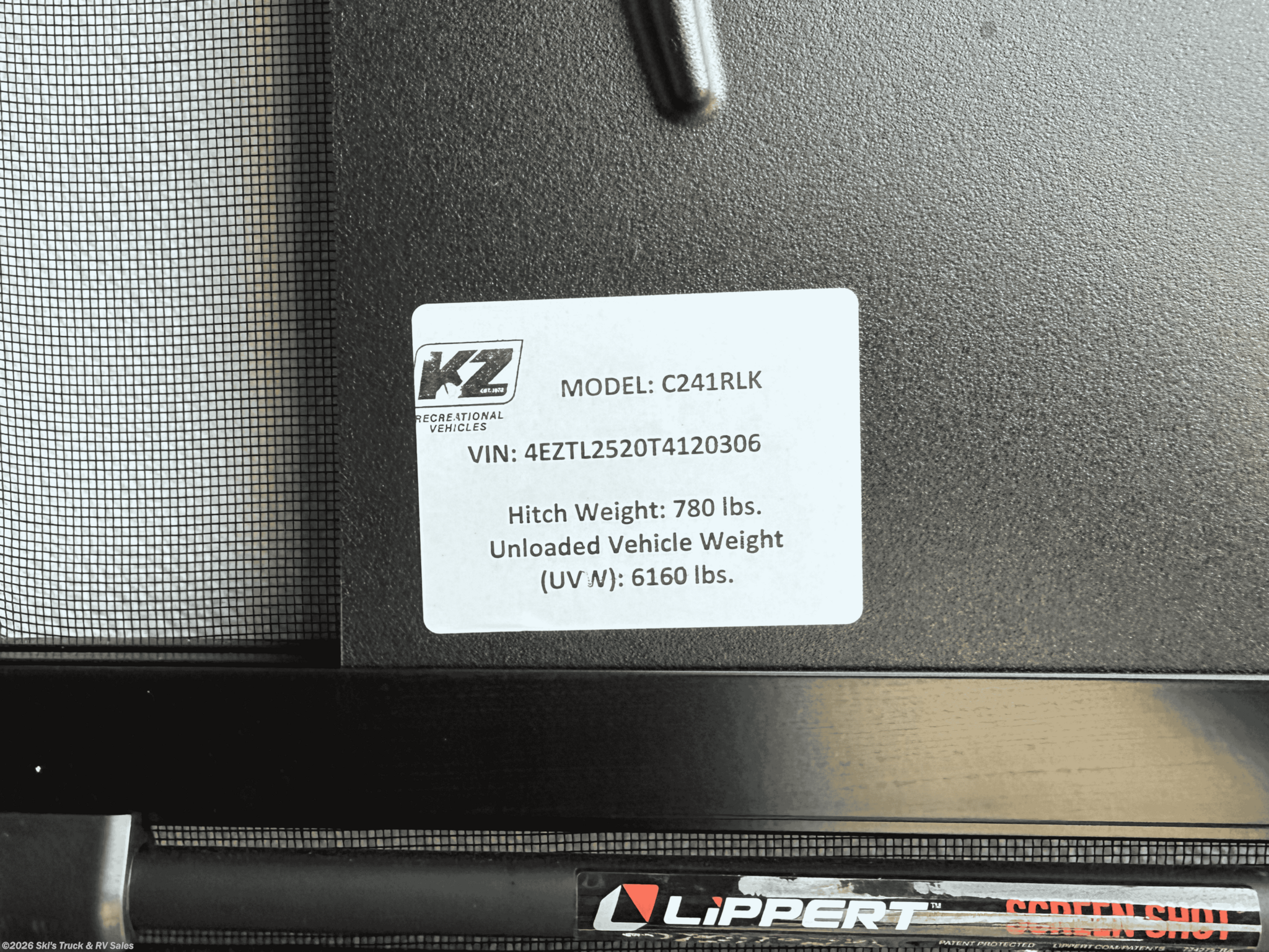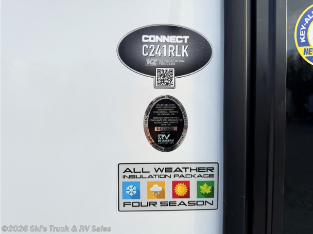 2026 KZ Connect C241RLK Travel Trailer; 25 Foot; 1 Slide; Sleeps 4; Dry Weight: 6,160 Lbs.; Hitch Weight: 780 Lbs.; 50 Amp; Power Tongue and Stabilizer Jacks; 45 Gal. Fresh Water Cap.; 32 Gal. Black Water Cap.; 32 Gal. Gray Water Cap.; Two 20 Lbs. Propane Tanks; Two ACs: 15,000 / 13,500 BTUs; 30,000 BTU Gas Furnace; Microwave; 3-Burner Stove/Oven; 10 Cu. Ft. (12V) Refrigerator; On Demand Water Heater; Two TV Jacks; 39 In.; Speakers; One Fireplace; Stainless Steel Kitchen Sink; Booth; King Bed; Theater Seats; 18 Ft. Power Awning with LED Lights; Backup Camera Prep.; Solar Prep.; Outside Kitchen with Griddle; Outside Shower; Exterior Storage; Foldup Steps; Grab Handle; Roof Ladder; Leash Latch; Key Alike System; Magnetic Storage Door Holders; Battery Disconnect; Black Tank Flush; Azdel Sidewalls; Screen Defender; Screenshot; Tinted Windows; Climate Package; Aluminum Wheels; Goodyear Tires; Spare Tire; Two Year Limited Warranty; Financing Available; Great Travel Trailer for the Price: $33,995. Call Skis Truck & RV Sales at 765-344-1111 or visit us at for more information.