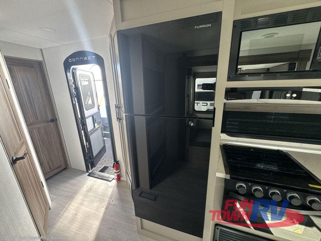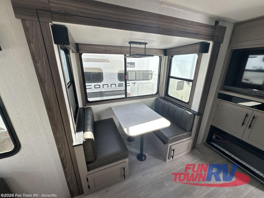 Hitch up this Connect travel trailer and head out for a fabulous weekend away! You will enjoy added space in the living area because of the single slide that holds the booth dinette, and another convenient feature is the dual-entry bathroom that can be accessed from the main hallway or the bedroom. You will be quite surprised to find a king-size bed inside the bedroom, along with dual wardrobes and a TV mount if you want to add a television. A pass-through storage on the exterior allows you to bring along extra gear, and the interior is kept cozy on chilly fall evenings with the 34" fireplace.