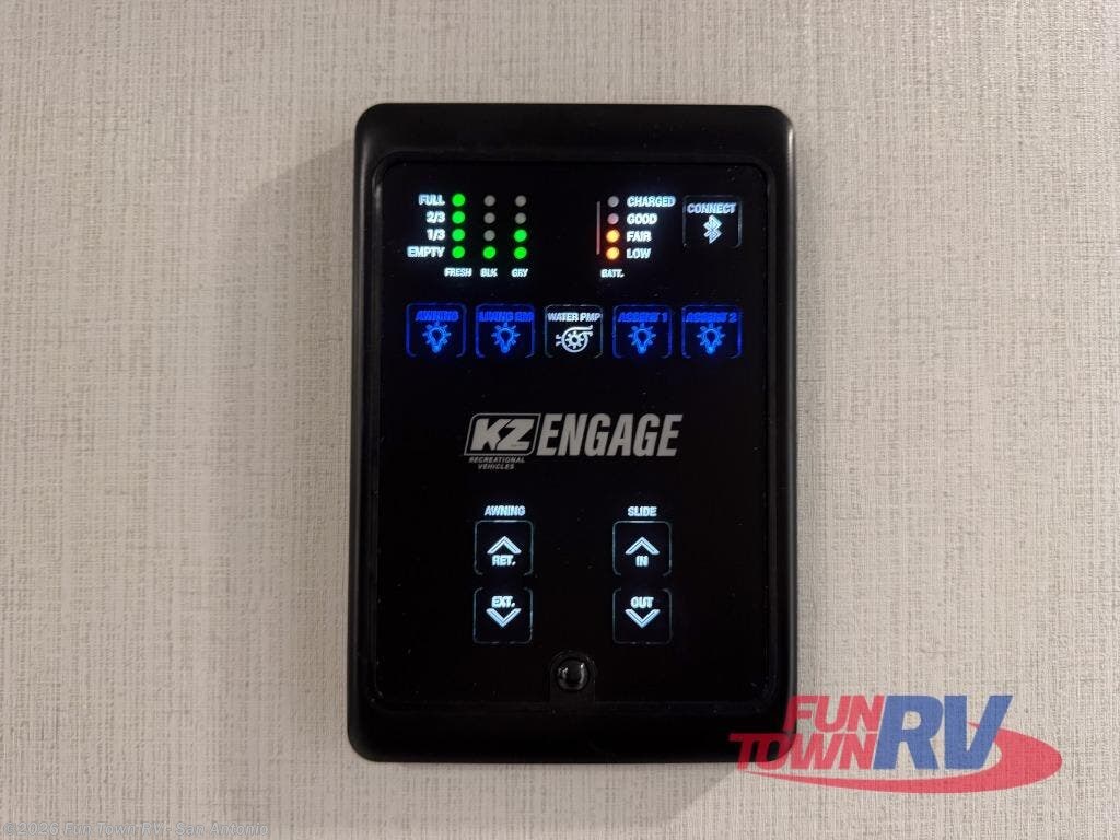 The KZ Connect travel trailer comes with an RV Airflow System which optimizes the airflow for your air conditioner. This improves performance, speeds up cooling times, and reduces noise in your trailer. Some of the other helpful features found on the Connect are the heated, insulated, and enclosed underbelly, the exterior docking station, the fiberglass front cap with front windshield, the 82" interior ceiling height, and the protective front diamond plate. There are some useful technological features, like the two LED motion-sensor lights, the HDMI and USB charger. The KZ Engage is powered by OneControl, and it monitors battery levels and controls slide rooms, the leveling system, the awning, inside/outside lighting, and the TPMS prep.