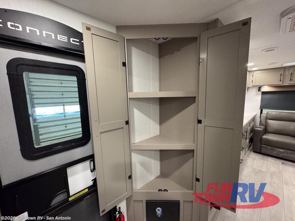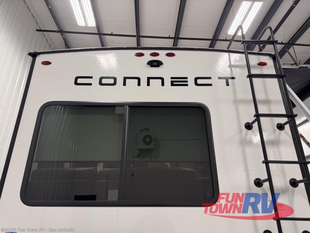 Hitch up this Connect travel trailer and head out for a fabulous weekend away! You will enjoy added space in the living area because of the single slide that holds the booth dinette, and another convenient feature is the dual-entry bathroom that can be accessed from the main hallway or the bedroom. You will be quite surprised to find a king-size bed inside the bedroom, along with dual wardrobes and a TV mount if you want to add a television. A pass-through storage on the exterior allows you to bring along extra gear, and the interior is kept cozy on chilly fall evenings with the 34" fireplace.