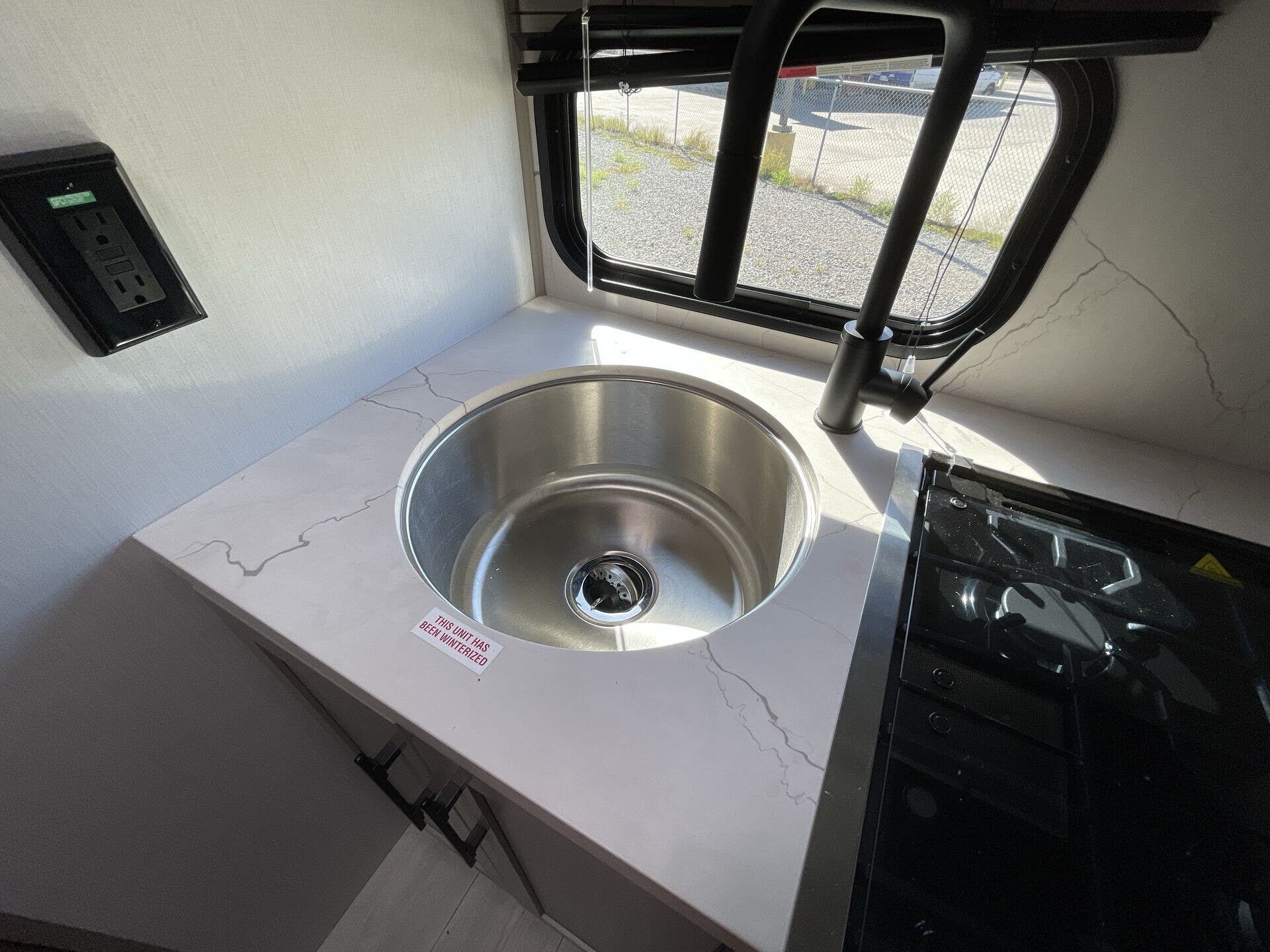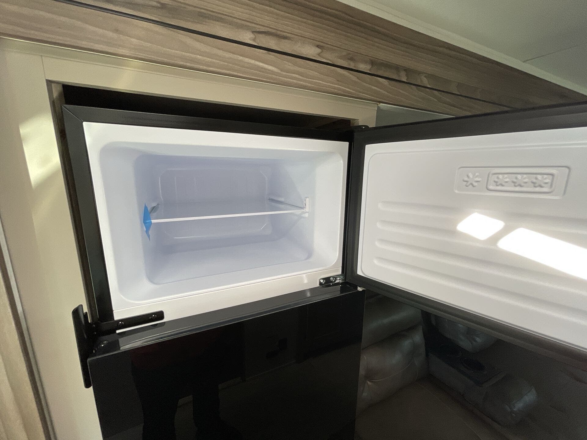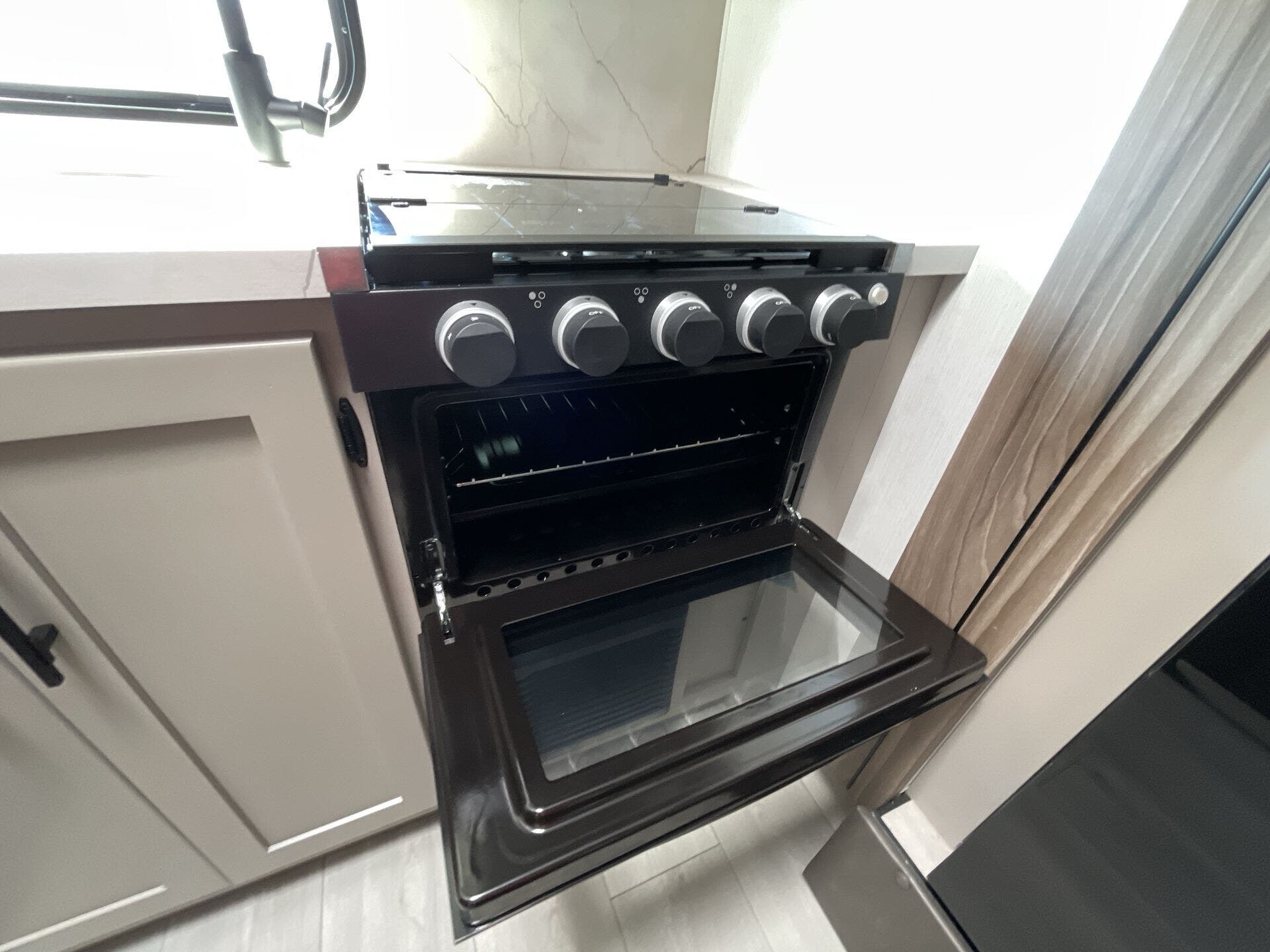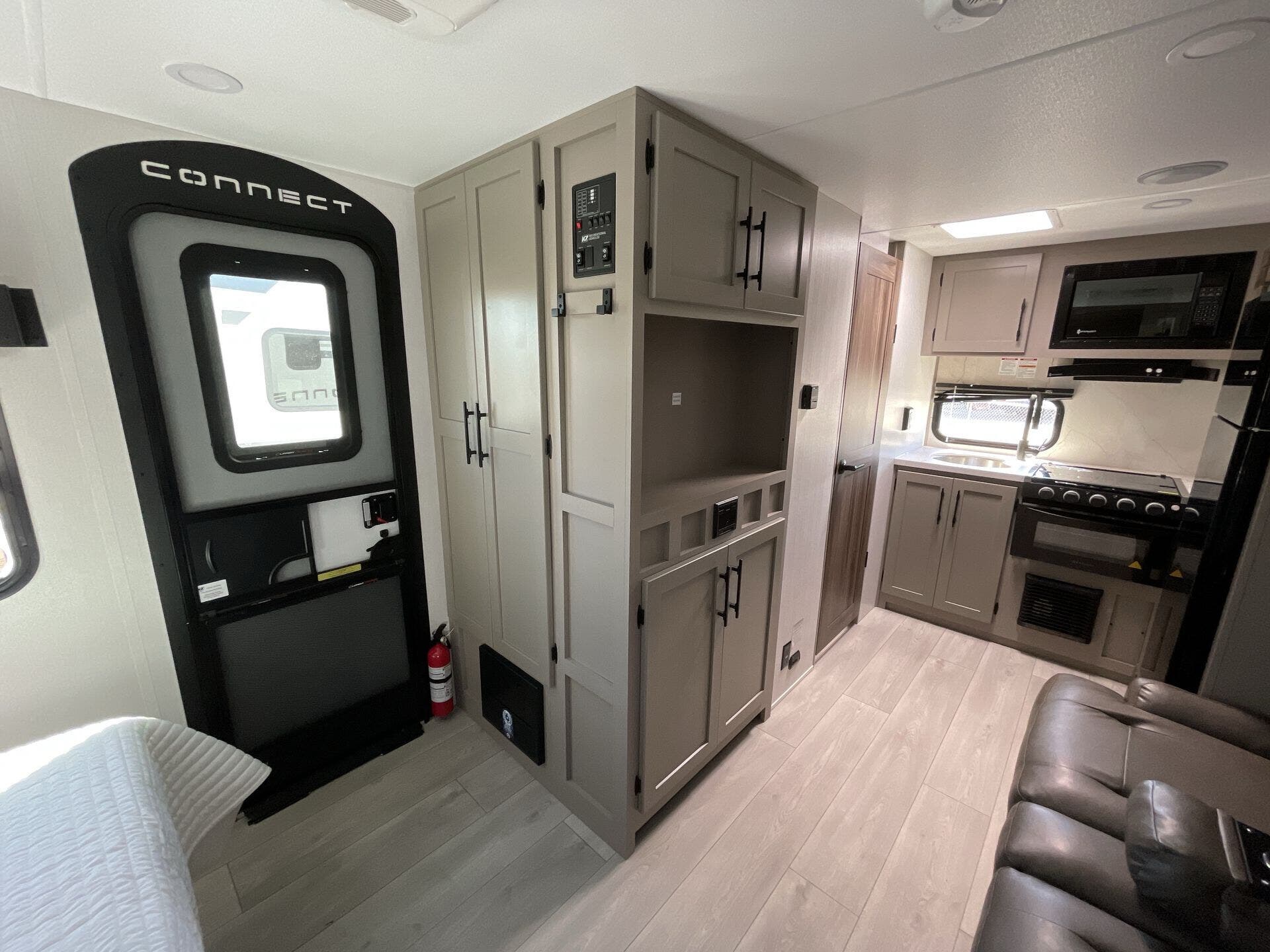 Inside, the rear kitchen layout maximizes space and convenience with modern features including a stainless-steel sink, two-burner cooktop, microwave, and ample counter space for meal prep. The open-concept living area includes a cozy dinette and entertainment center, providing the perfect spot to relax after a day of adventure. With premium materials, LED lighting, and clever storage throughout, the Connect Mini 171RK proves that small doesn’t mean sacrificing comfort or style.