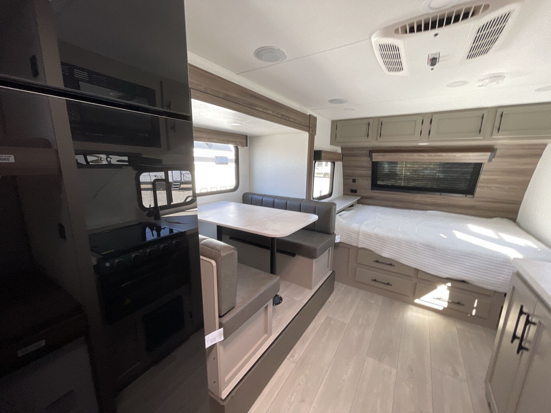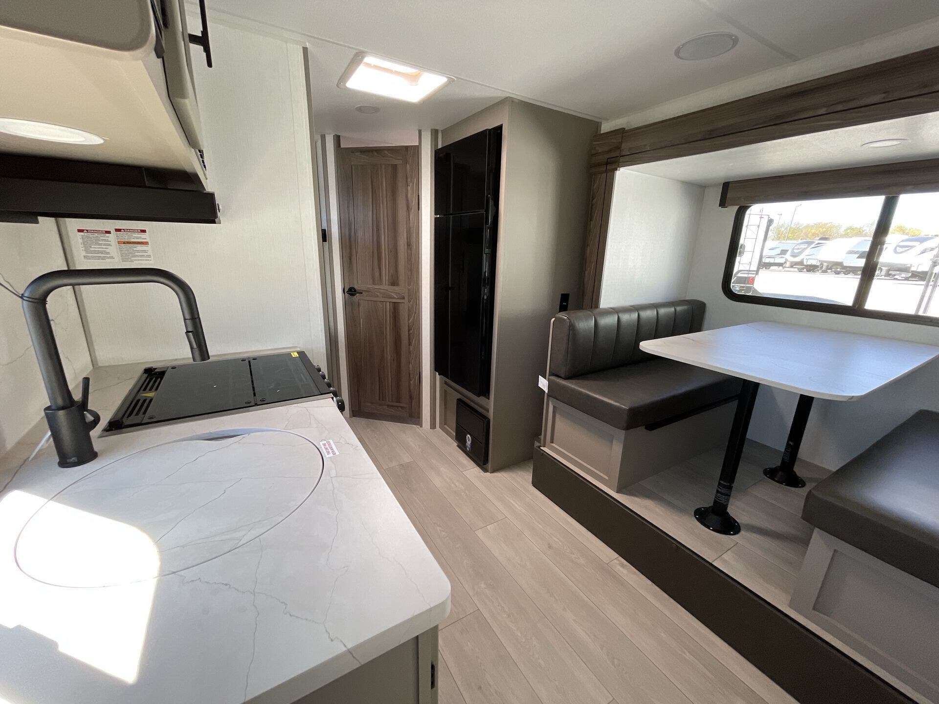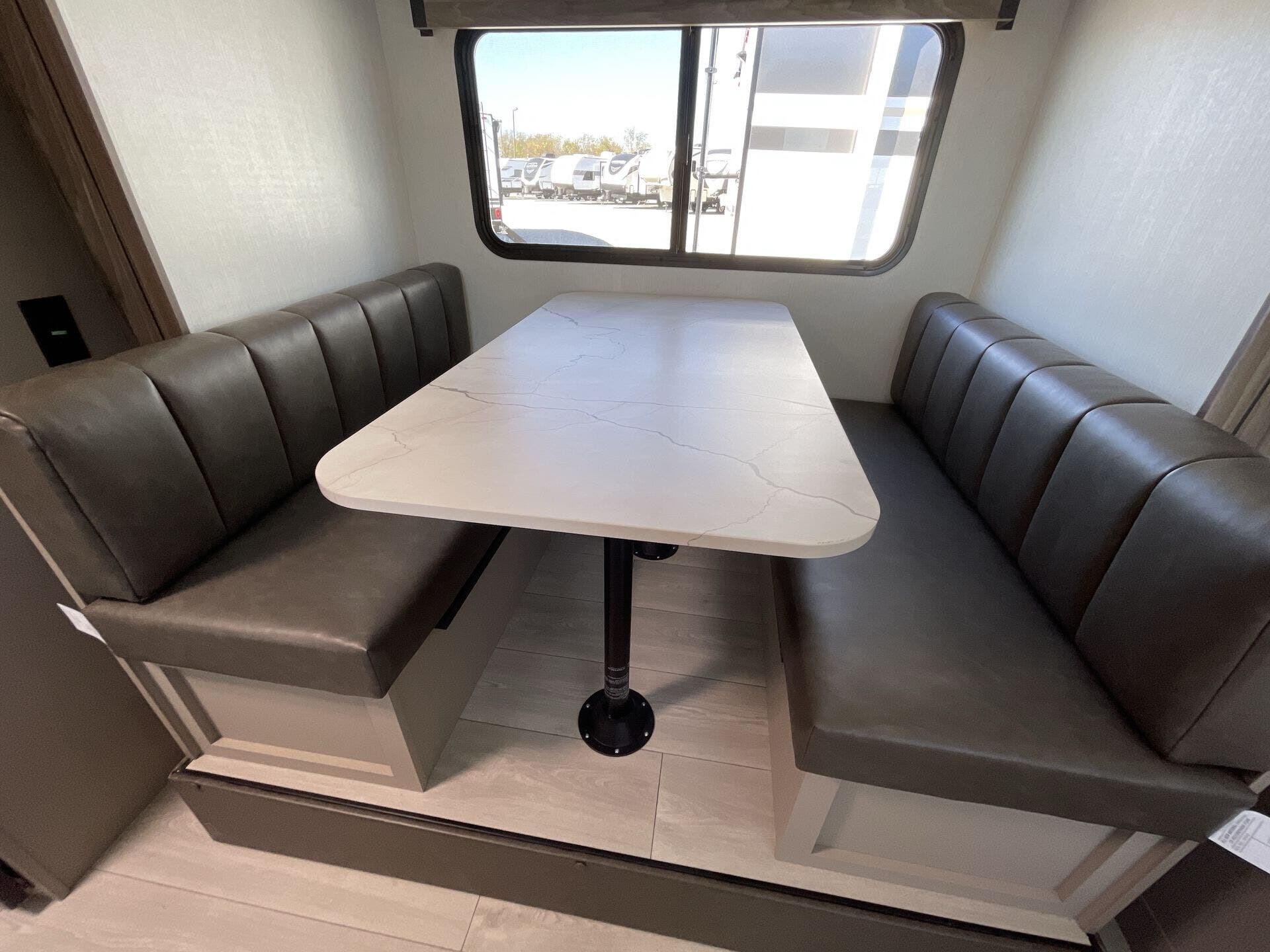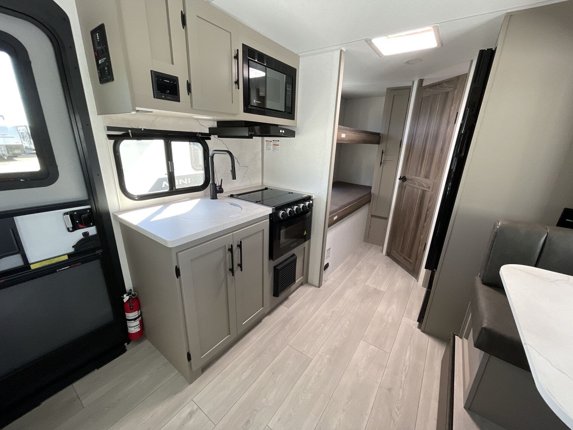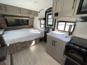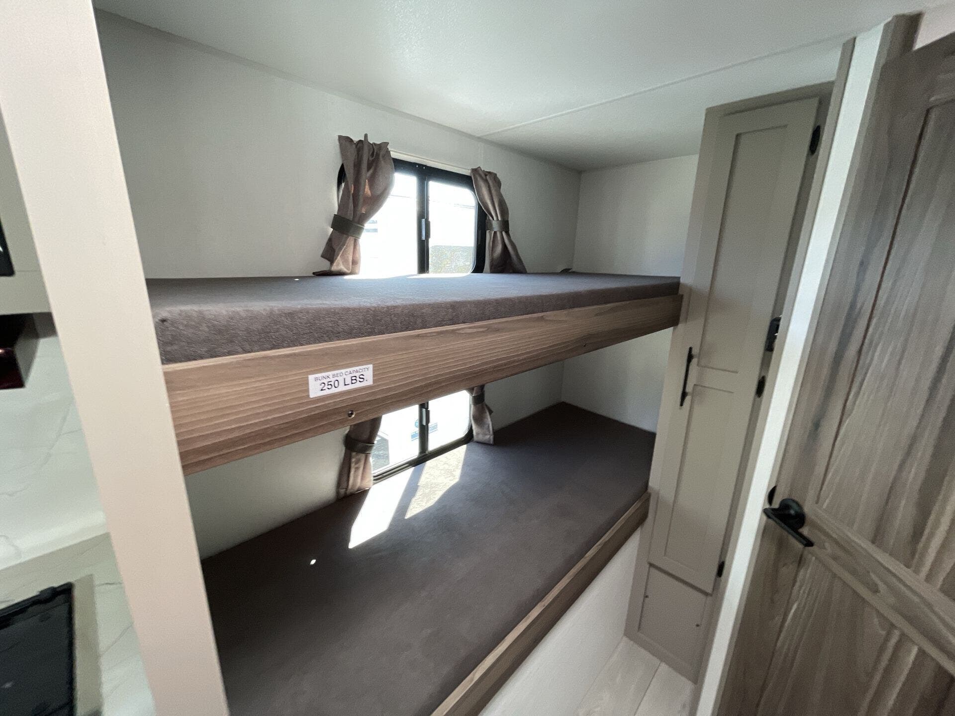 Inside, you’ll find a bright and inviting interior designed to maximize space and comfort. The living area includes a cozy dinette that converts into extra sleeping space, while the full kitchen features stainless-steel appliances, a large refrigerator, and solid-surface countertops — everything you need to cook your favorite meals on the road. The rear double-over-double bunks give the kids their own retreat, and the Murphy bed up front easily transforms the space from a living area to a private bedroom in seconds.
