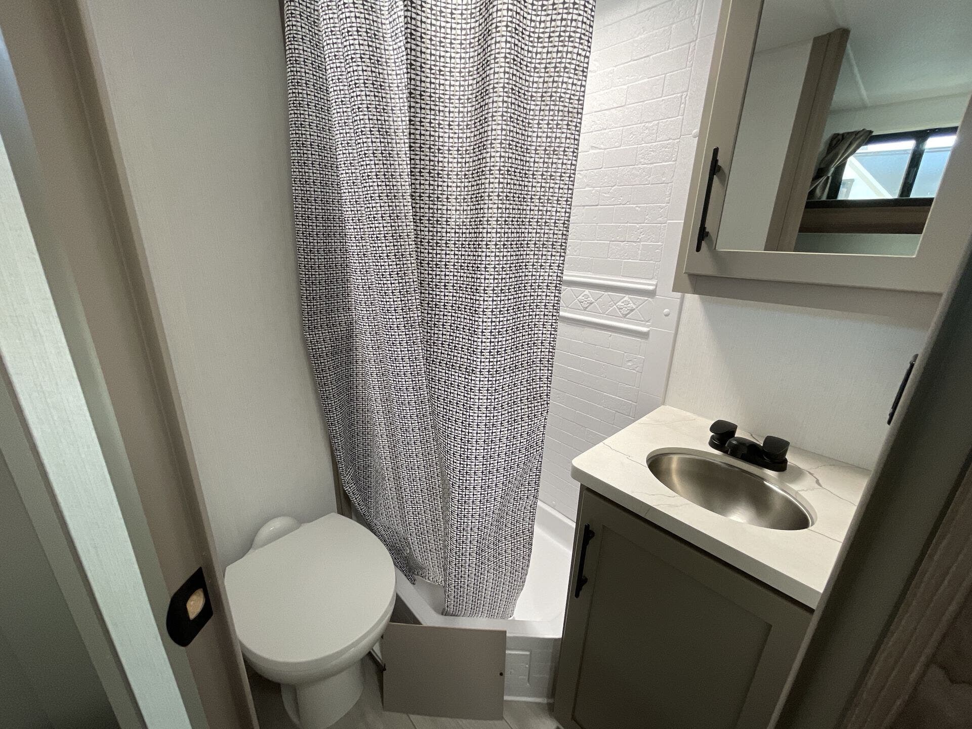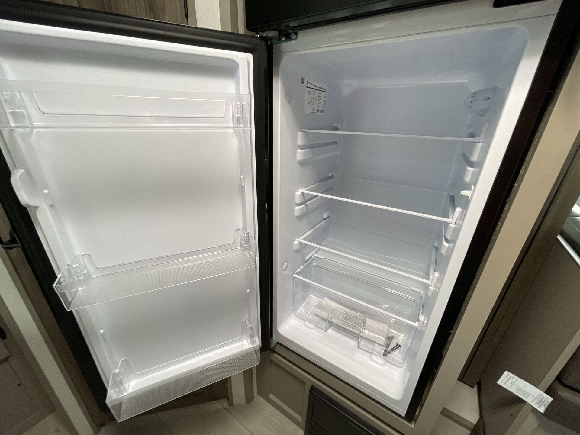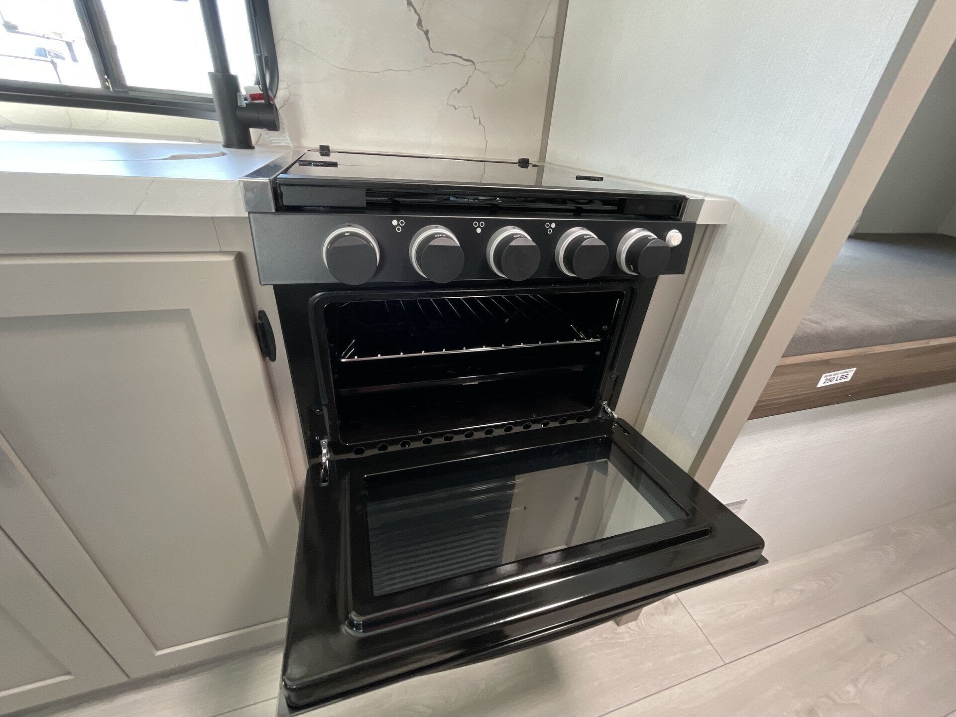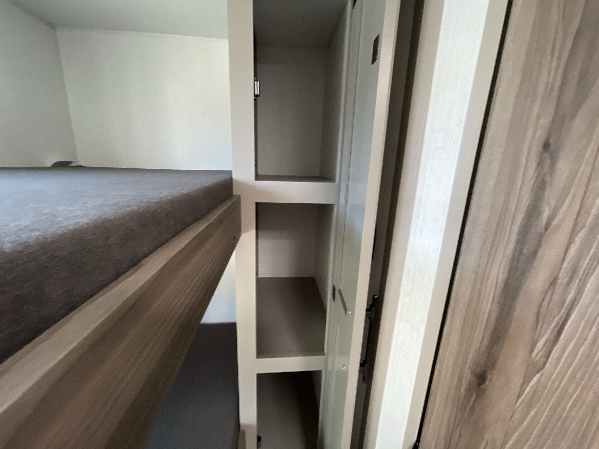 Inside, you’ll find a bright and inviting interior designed to maximize space and comfort. The living area includes a cozy dinette that converts into extra sleeping space, while the full kitchen features stainless-steel appliances, a large refrigerator, and solid-surface countertops — everything you need to cook your favorite meals on the road. The rear double-over-double bunks give the kids their own retreat, and the Murphy bed up front easily transforms the space from a living area to a private bedroom in seconds.