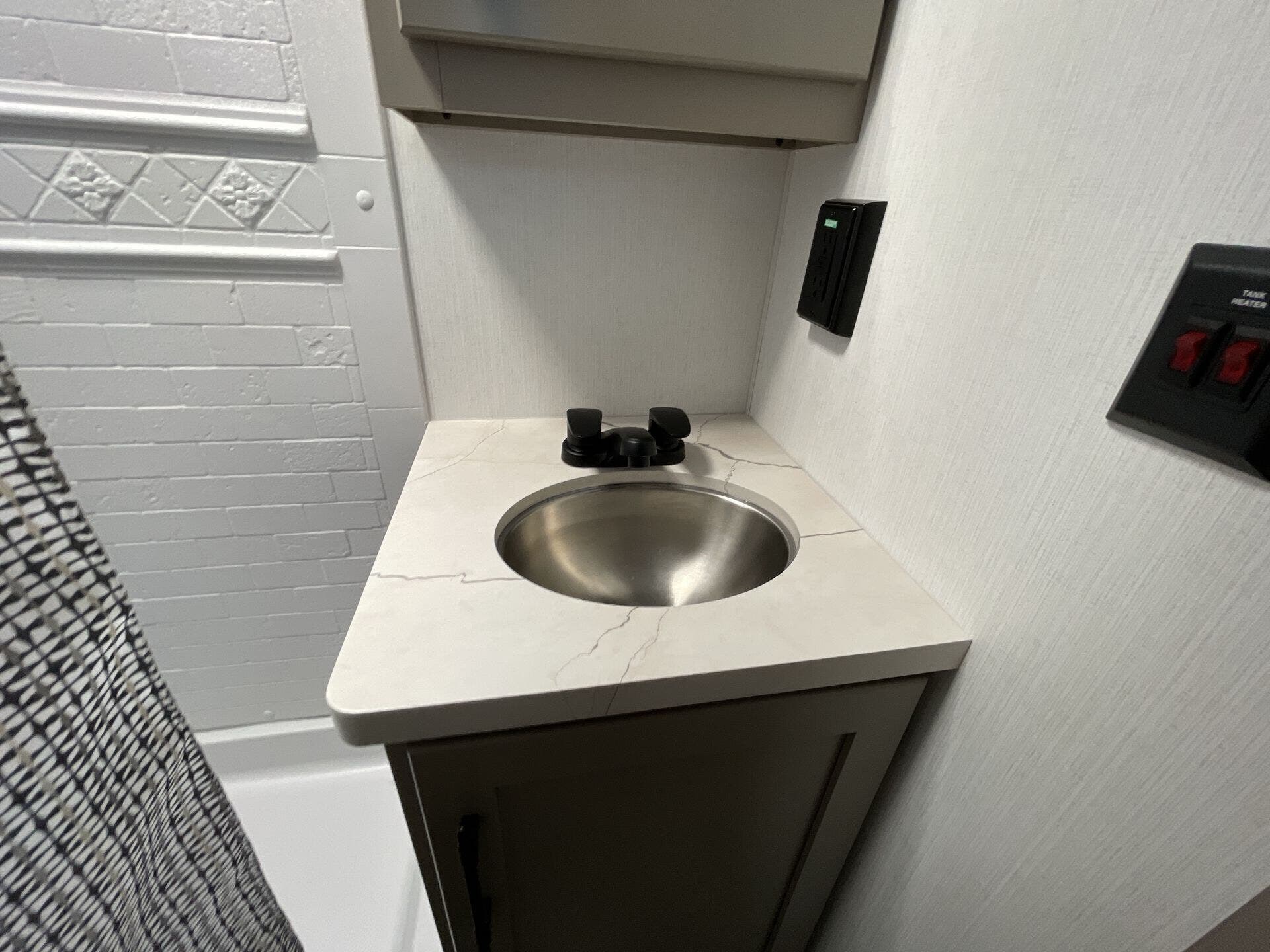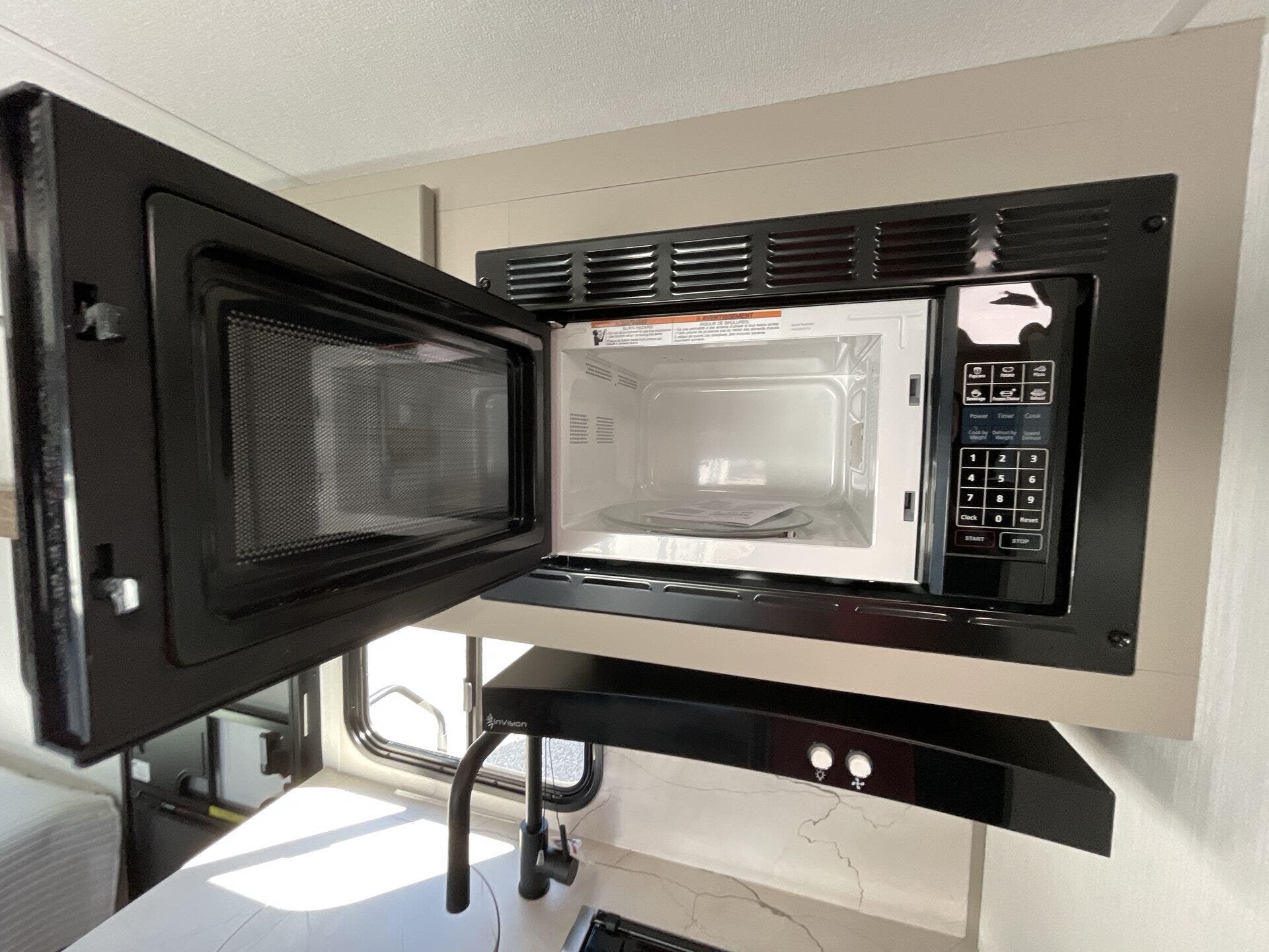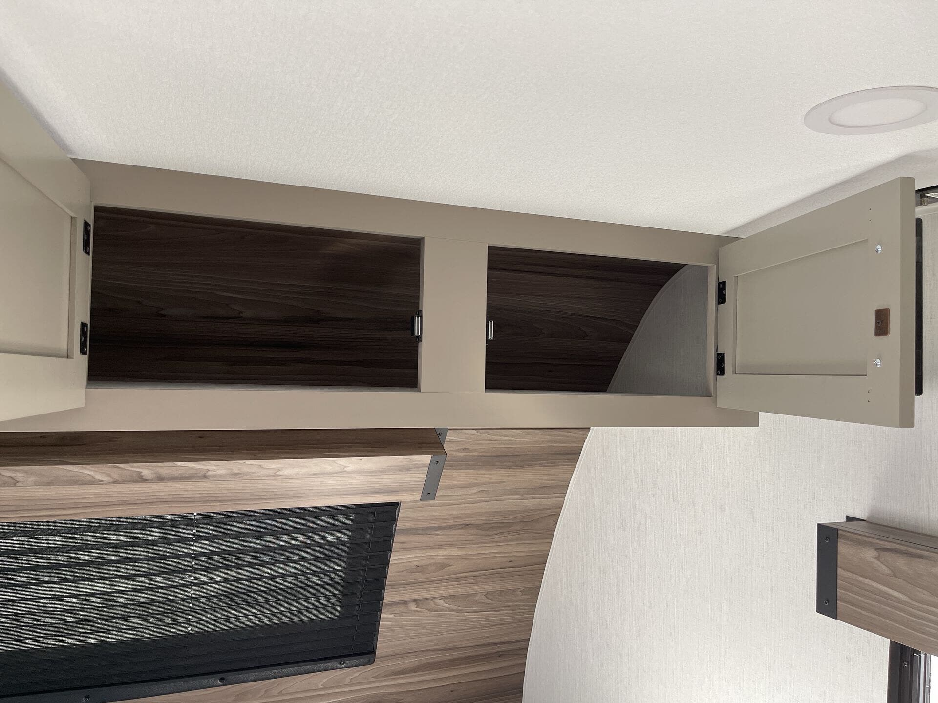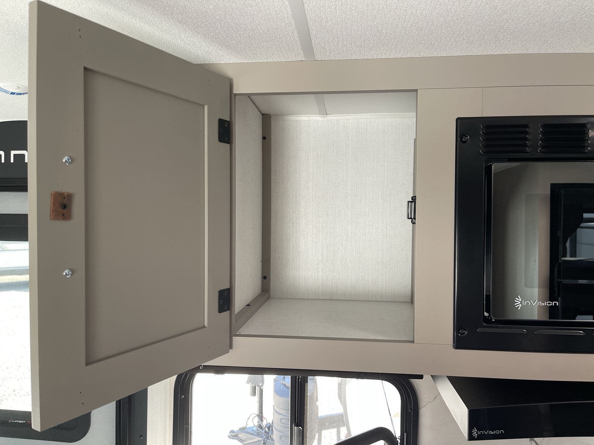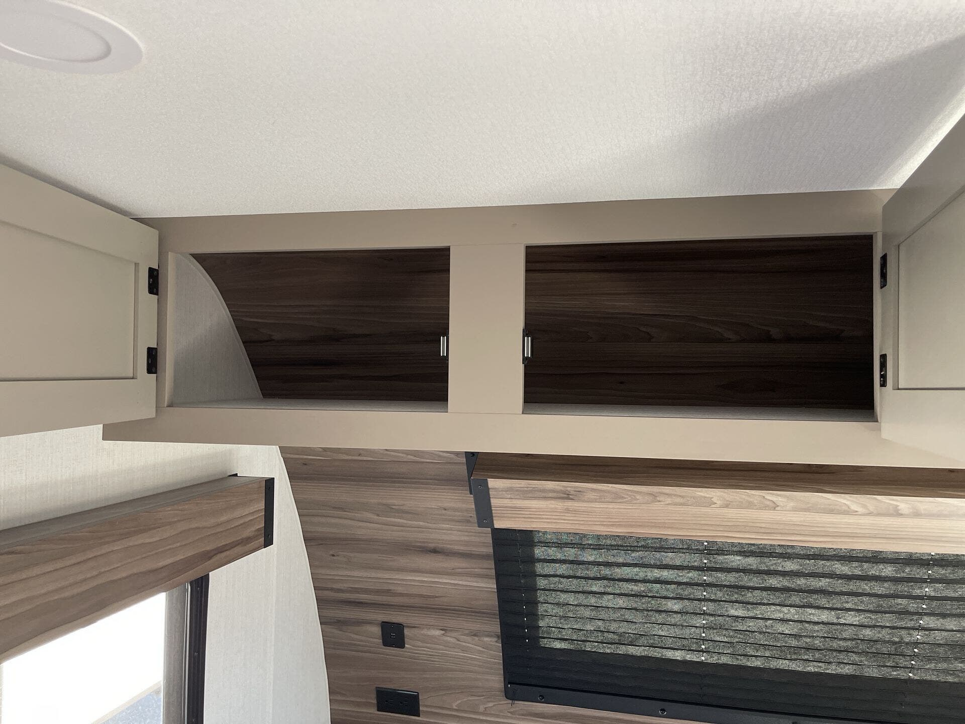 Inside, you’ll find a bright and inviting interior designed to maximize space and comfort. The living area includes a cozy dinette that converts into extra sleeping space, while the full kitchen features stainless-steel appliances, a large refrigerator, and solid-surface countertops — everything you need to cook your favorite meals on the road. The rear double-over-double bunks give the kids their own retreat, and the Murphy bed up front easily transforms the space from a living area to a private bedroom in seconds.