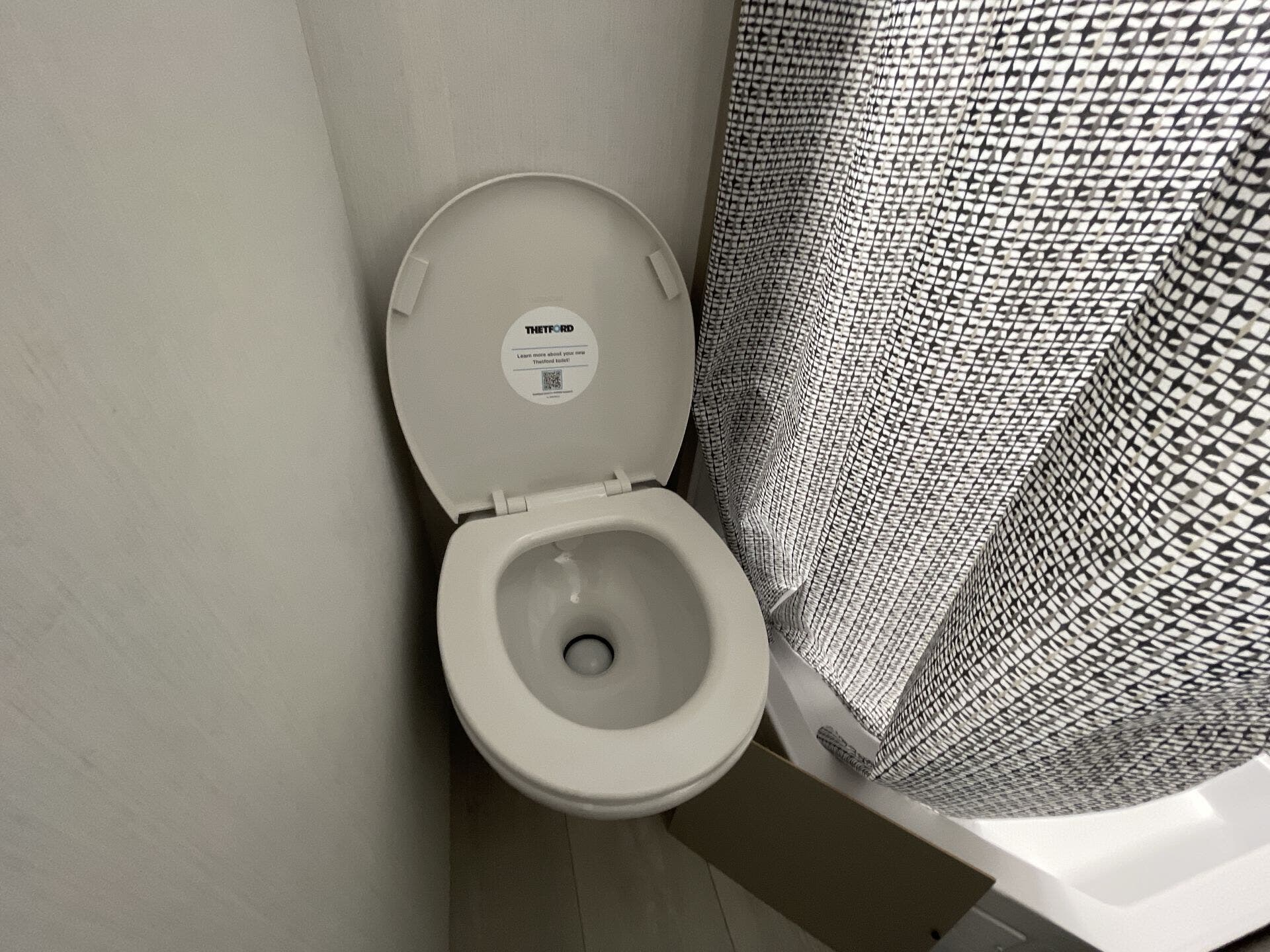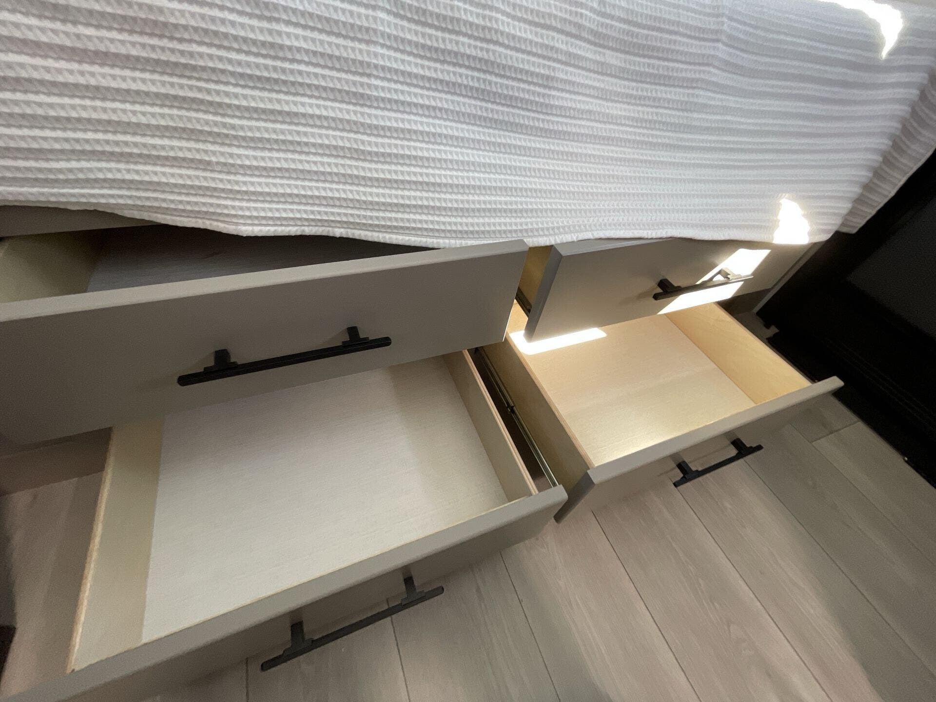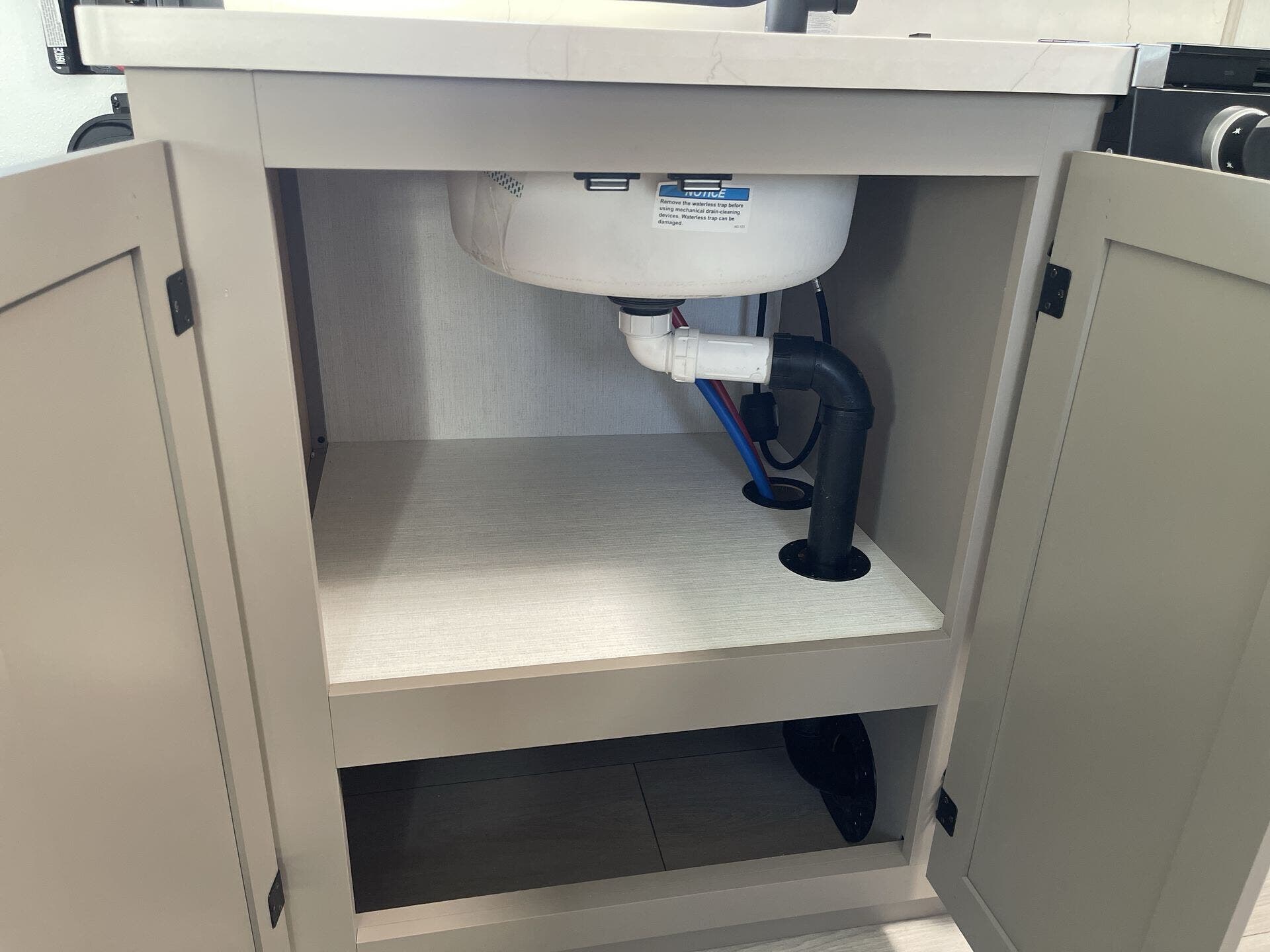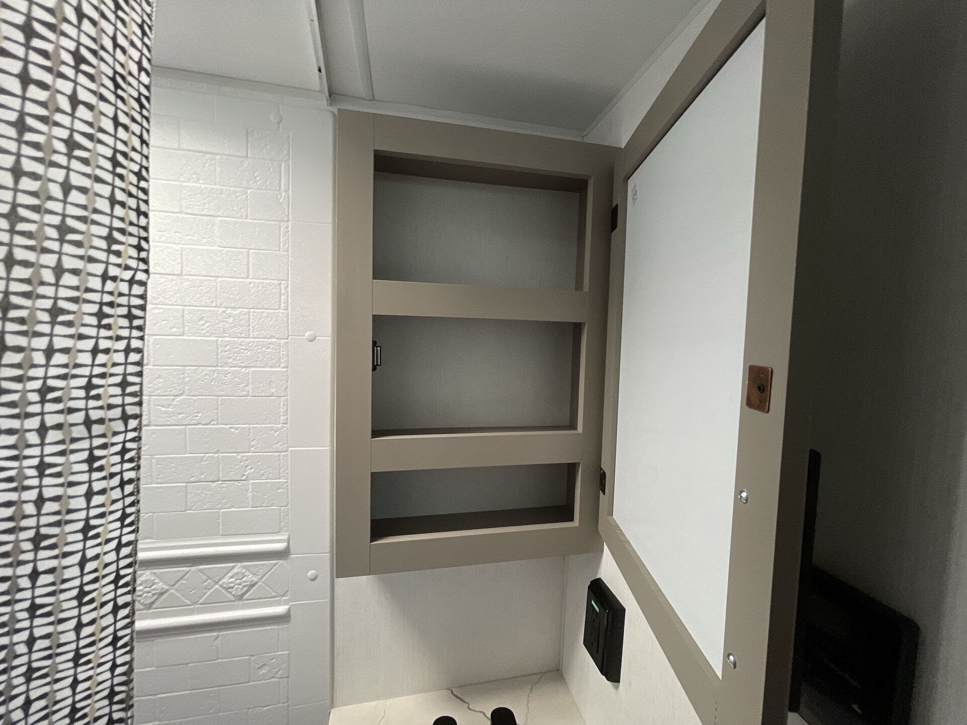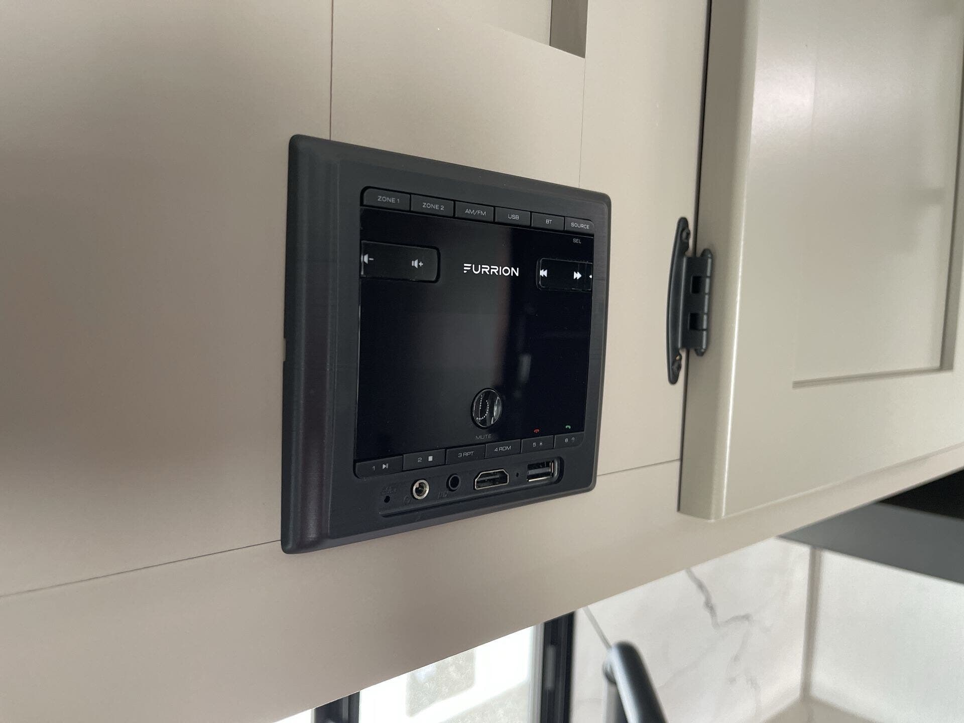 Inside, you’ll find a bright and inviting interior designed to maximize space and comfort. The living area includes a cozy dinette that converts into extra sleeping space, while the full kitchen features stainless-steel appliances, a large refrigerator, and solid-surface countertops — everything you need to cook your favorite meals on the road. The rear double-over-double bunks give the kids their own retreat, and the Murphy bed up front easily transforms the space from a living area to a private bedroom in seconds.