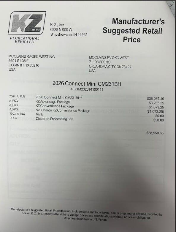 Request More Info on this 2026 K-Z Connect Mini 231BH Offered for sale by McClain's RV Oklahoma City
