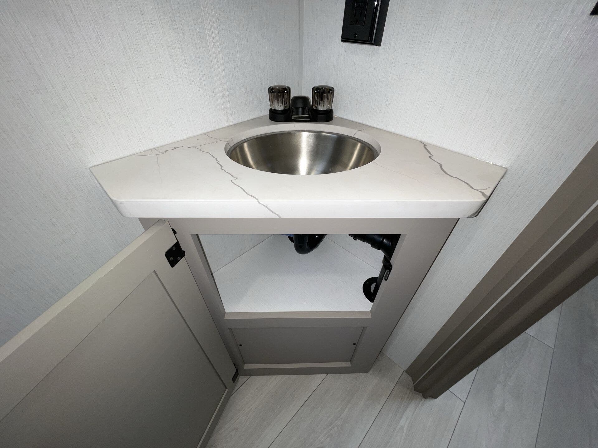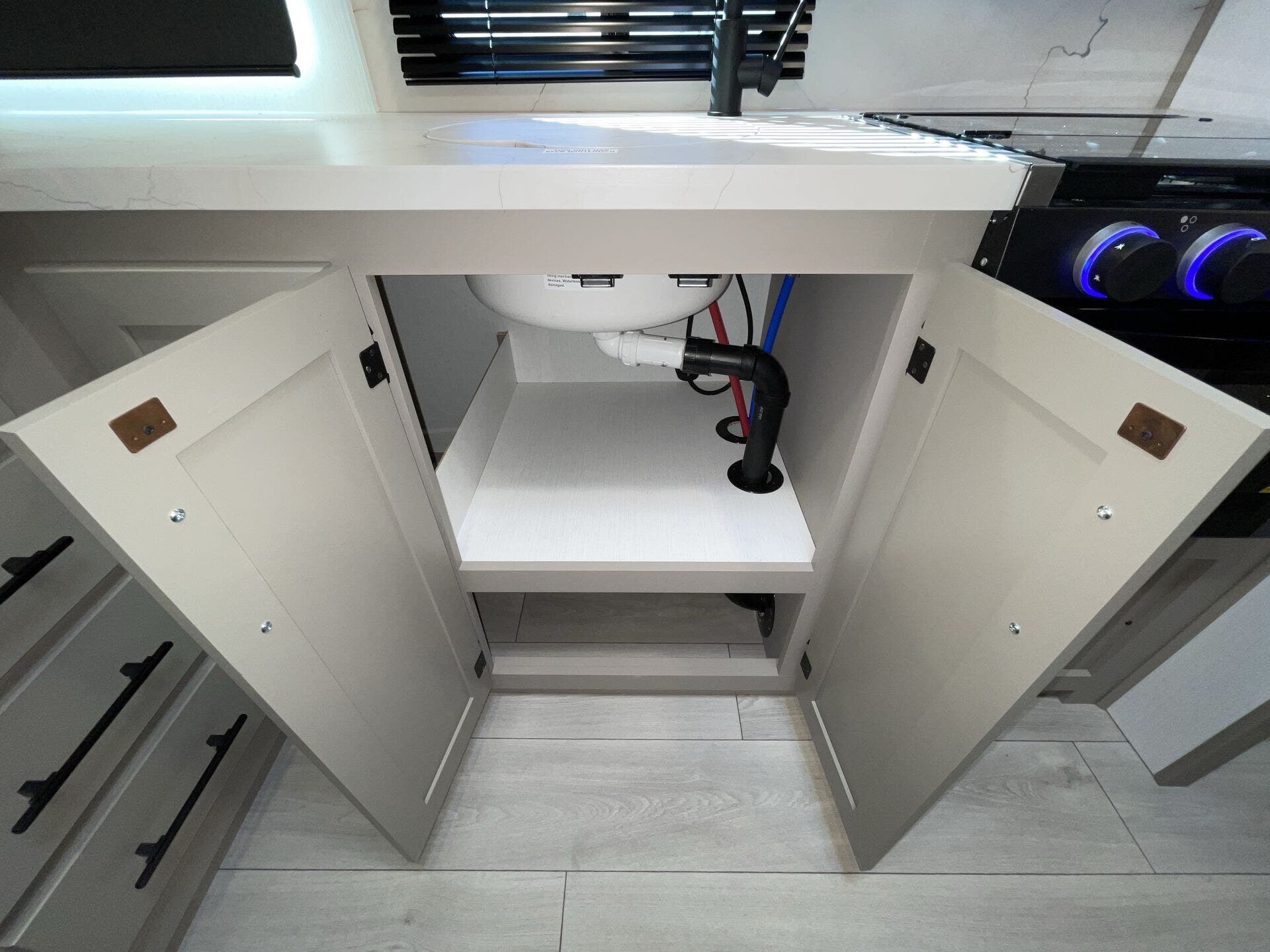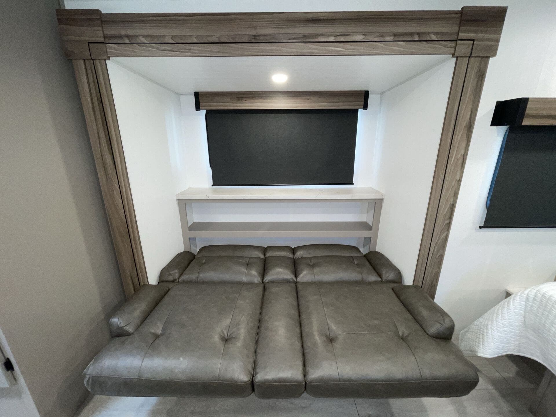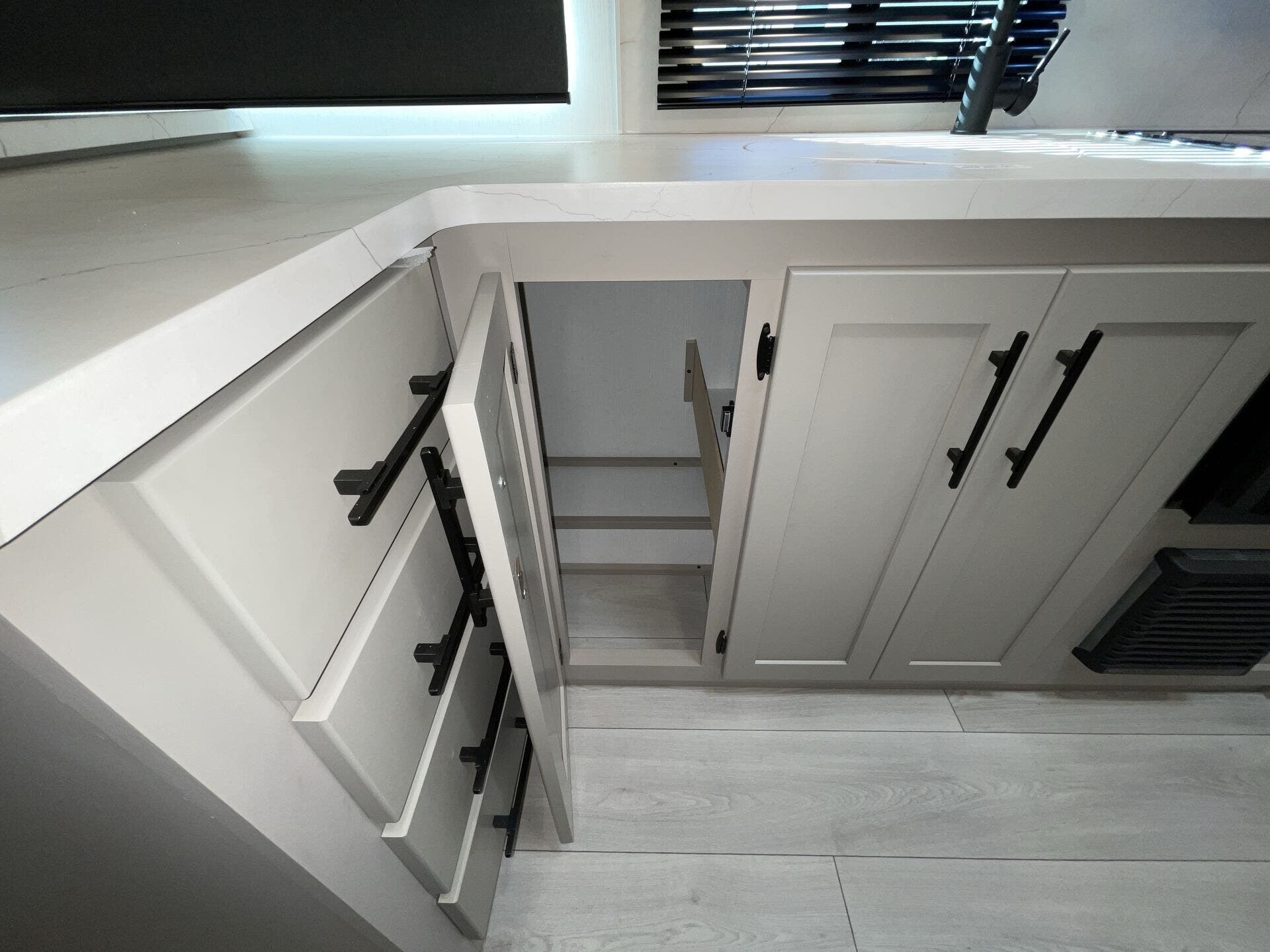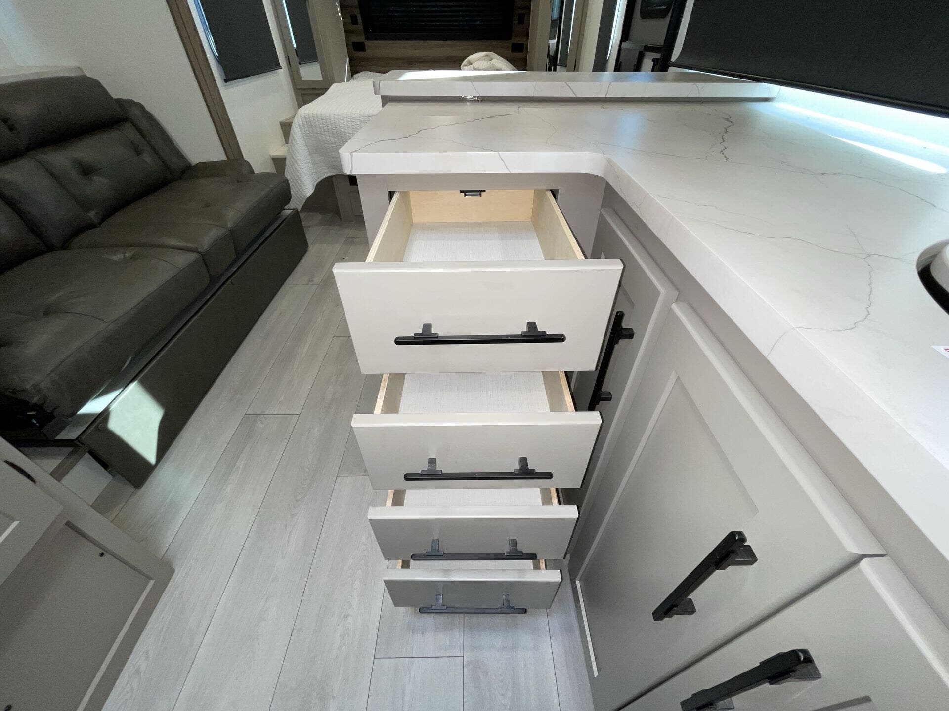 Kitchen Sink, Medicine Cabinet, Overhead Cabinetry, Pantry, Queen Bed, Removable Table, Roof Vents, Shower, Sofa Bed, Solid Surface Countertops, Toilet, Wardrobe(s)