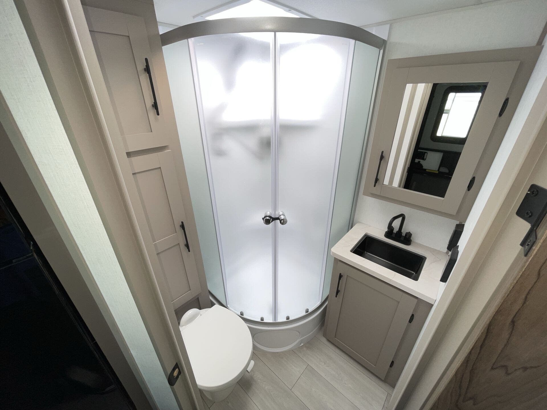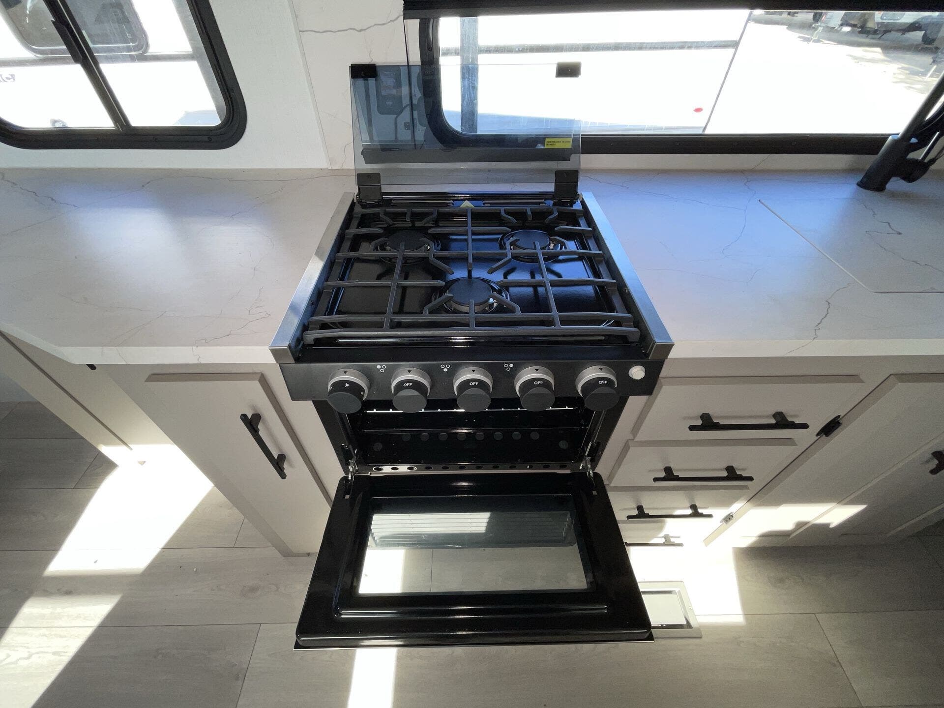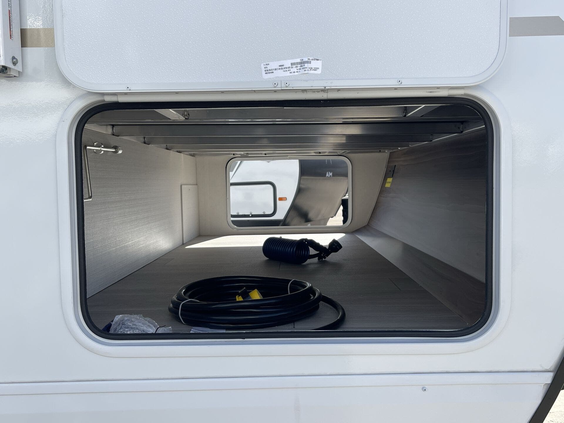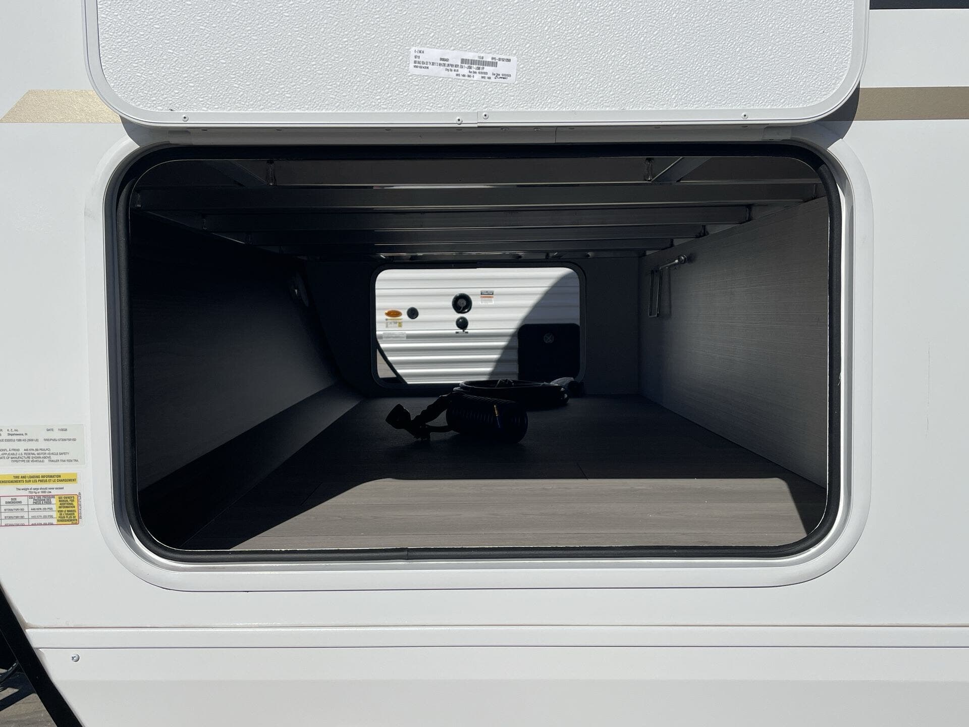 Tank sizes are practical for longer weekends or even longer trips, so you’re not constantly thinking about water or dumps. Outside, the power awning with LED lighting makes your campsite “hang-out ready” as soon as you step off the trailer, and pass-through storage gives you extra room for gear without cluttering the living areas.
