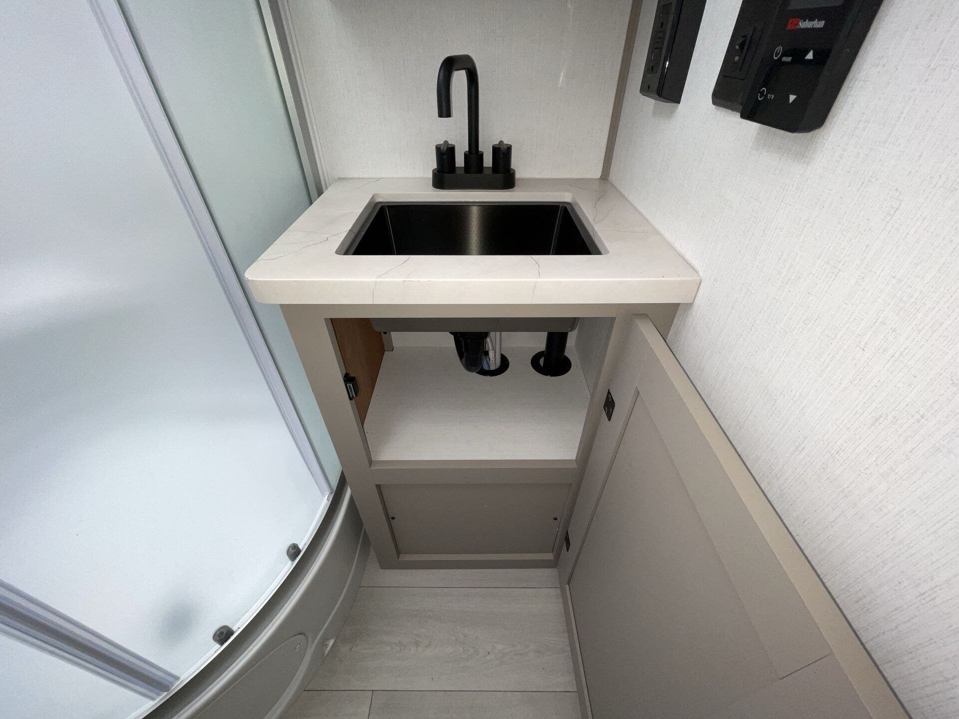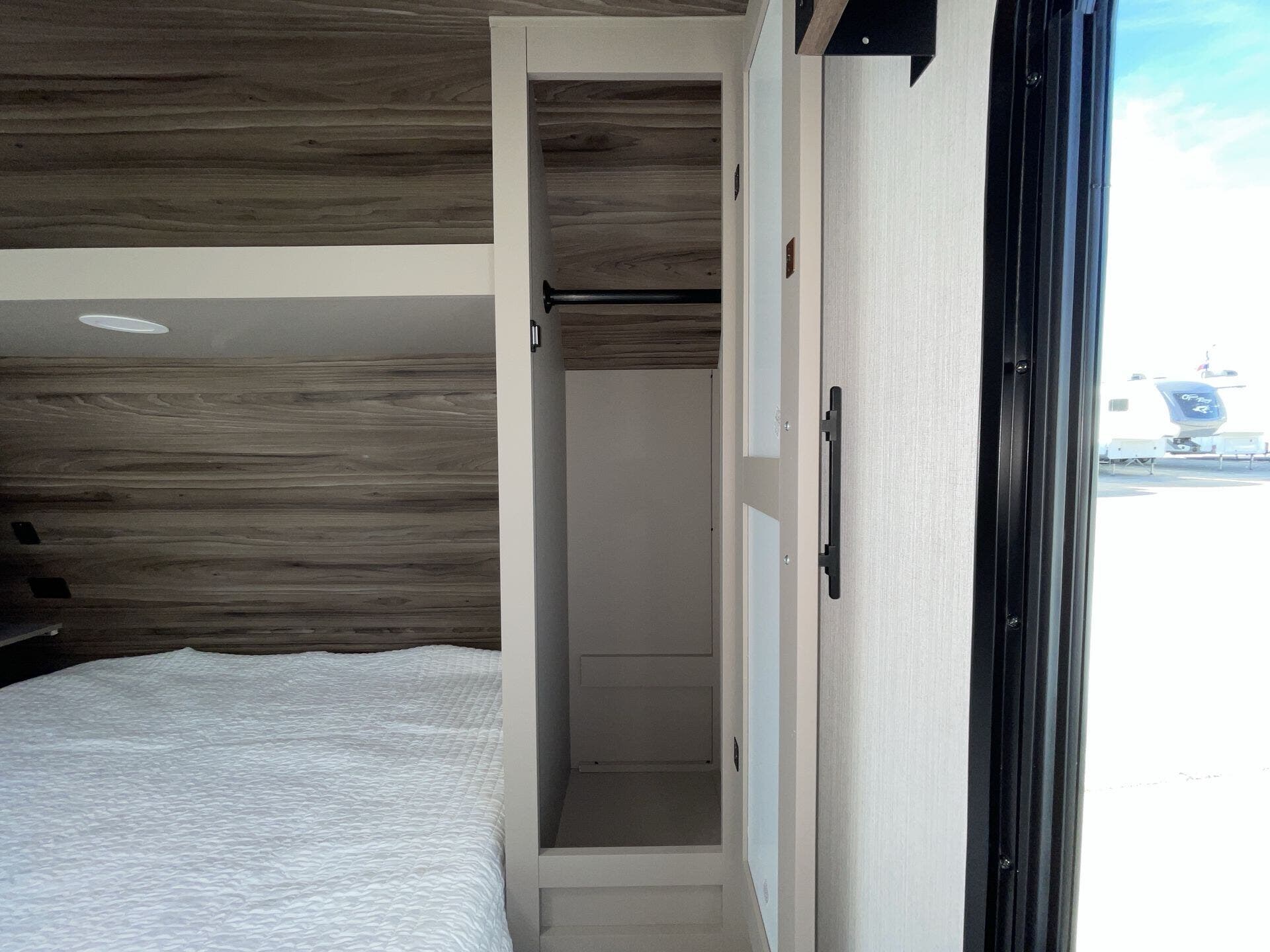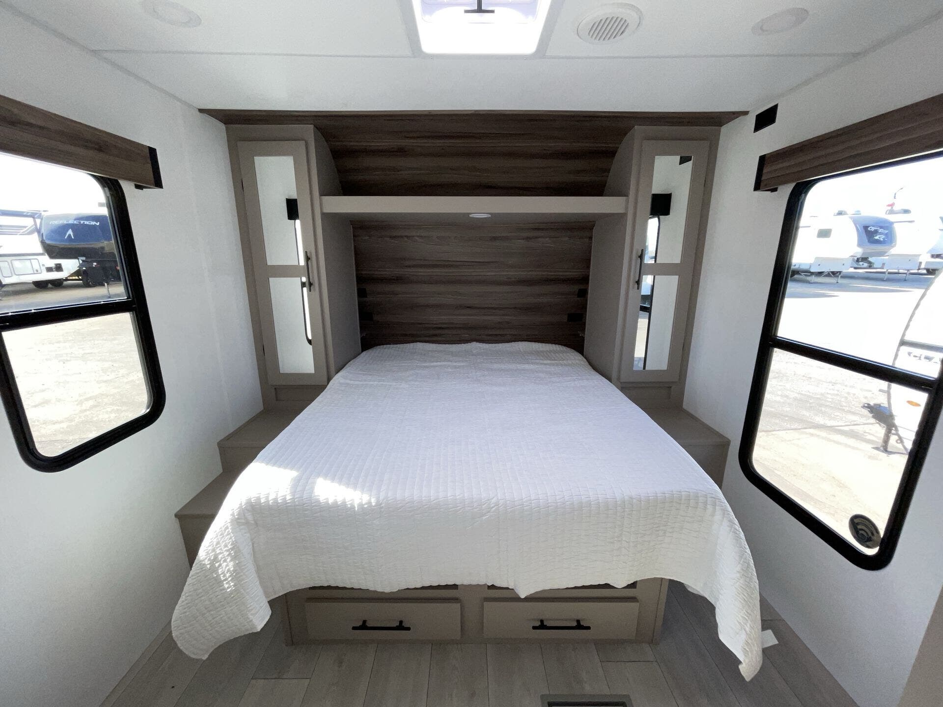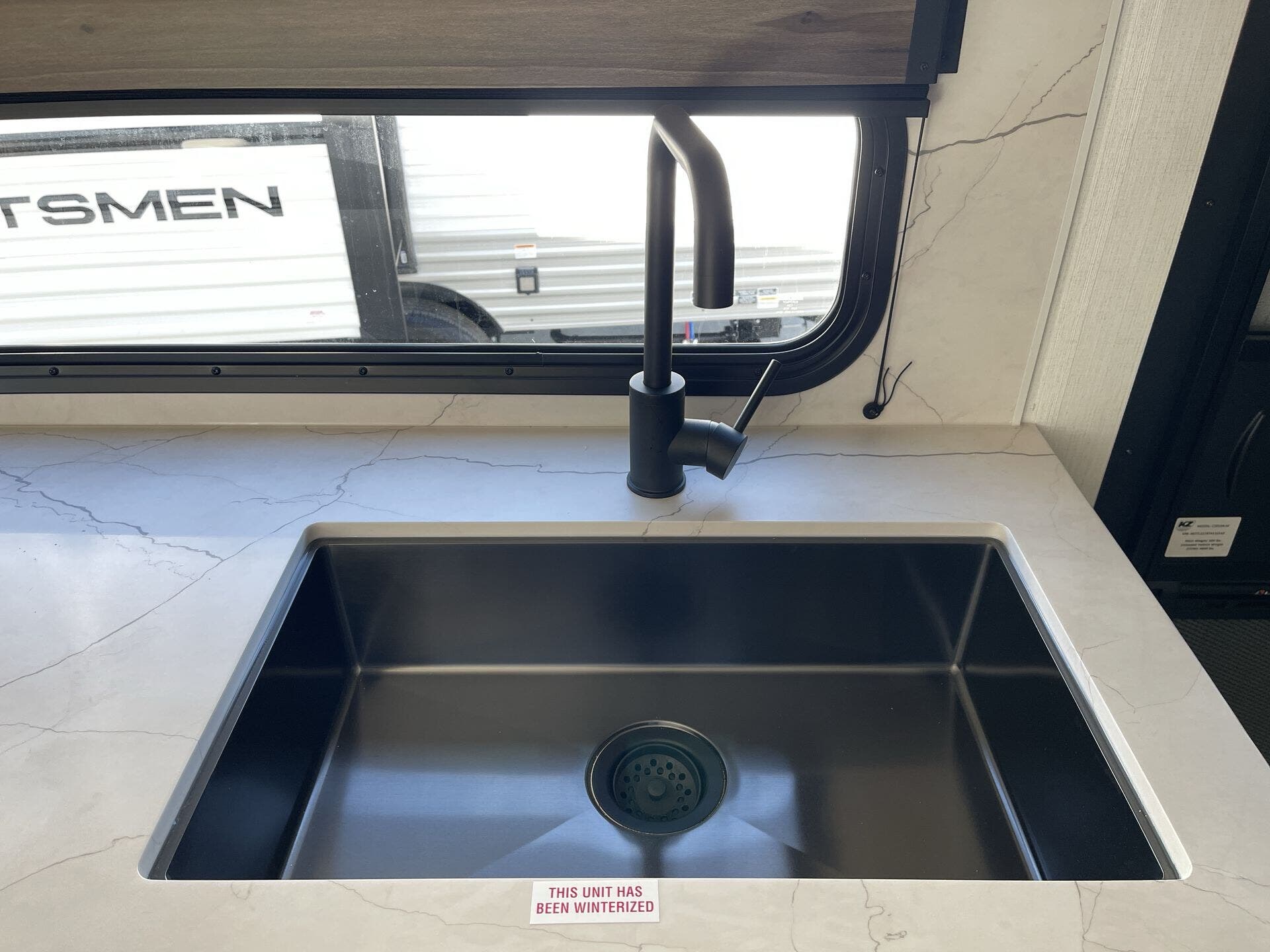 Tank sizes are practical for longer weekends or even longer trips, so you’re not constantly thinking about water or dumps. Outside, the power awning with LED lighting makes your campsite “hang-out ready” as soon as you step off the trailer, and pass-through storage gives you extra room for gear without cluttering the living areas.