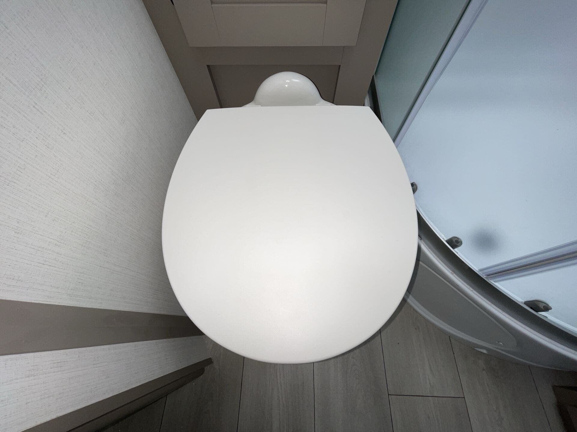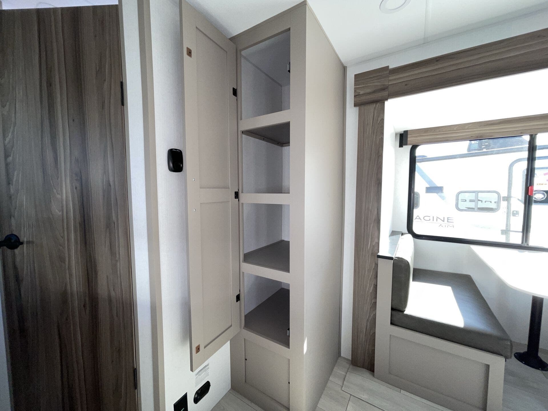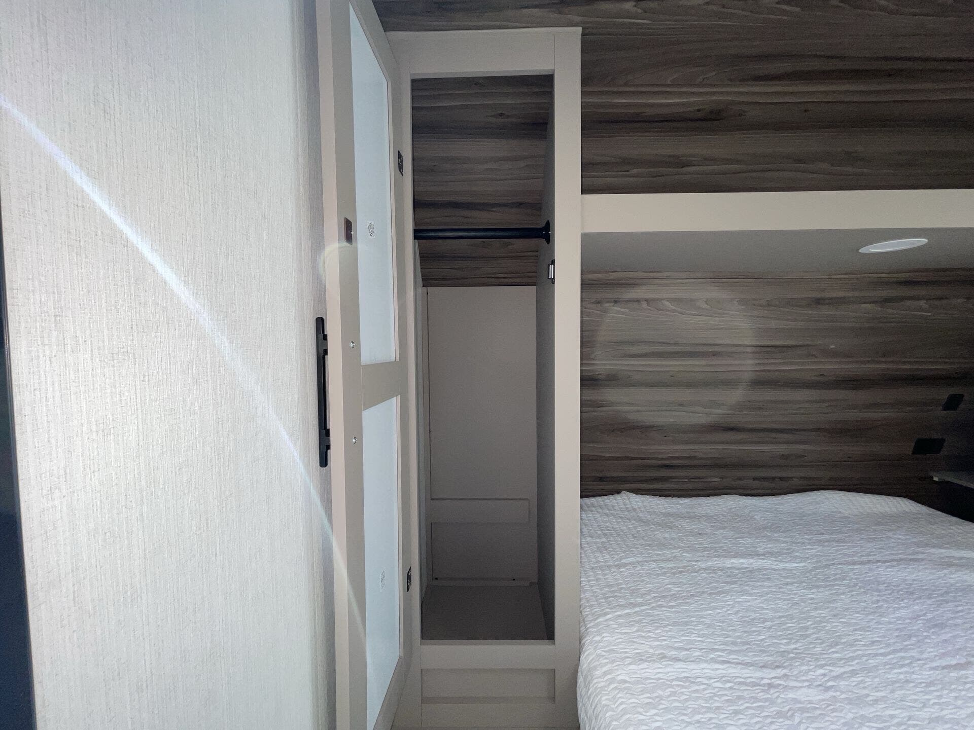 Booth Dinette, Dinette Bed, Fireplace, Kitchen Sink, Overhead Cabinetry, Pantry, Queen Bed, Roof Vents, Shower, Toilet, Wardrobe(s) -