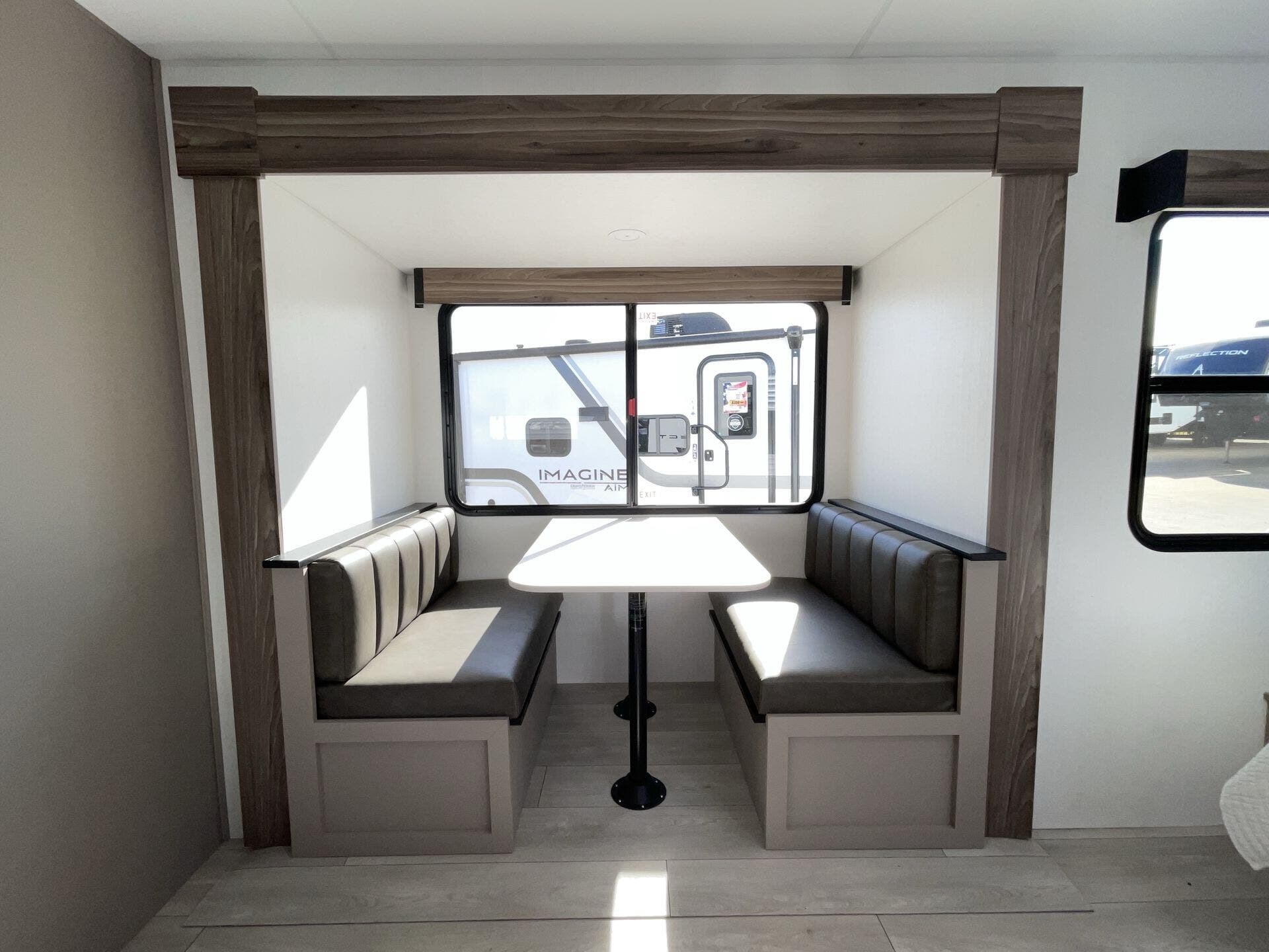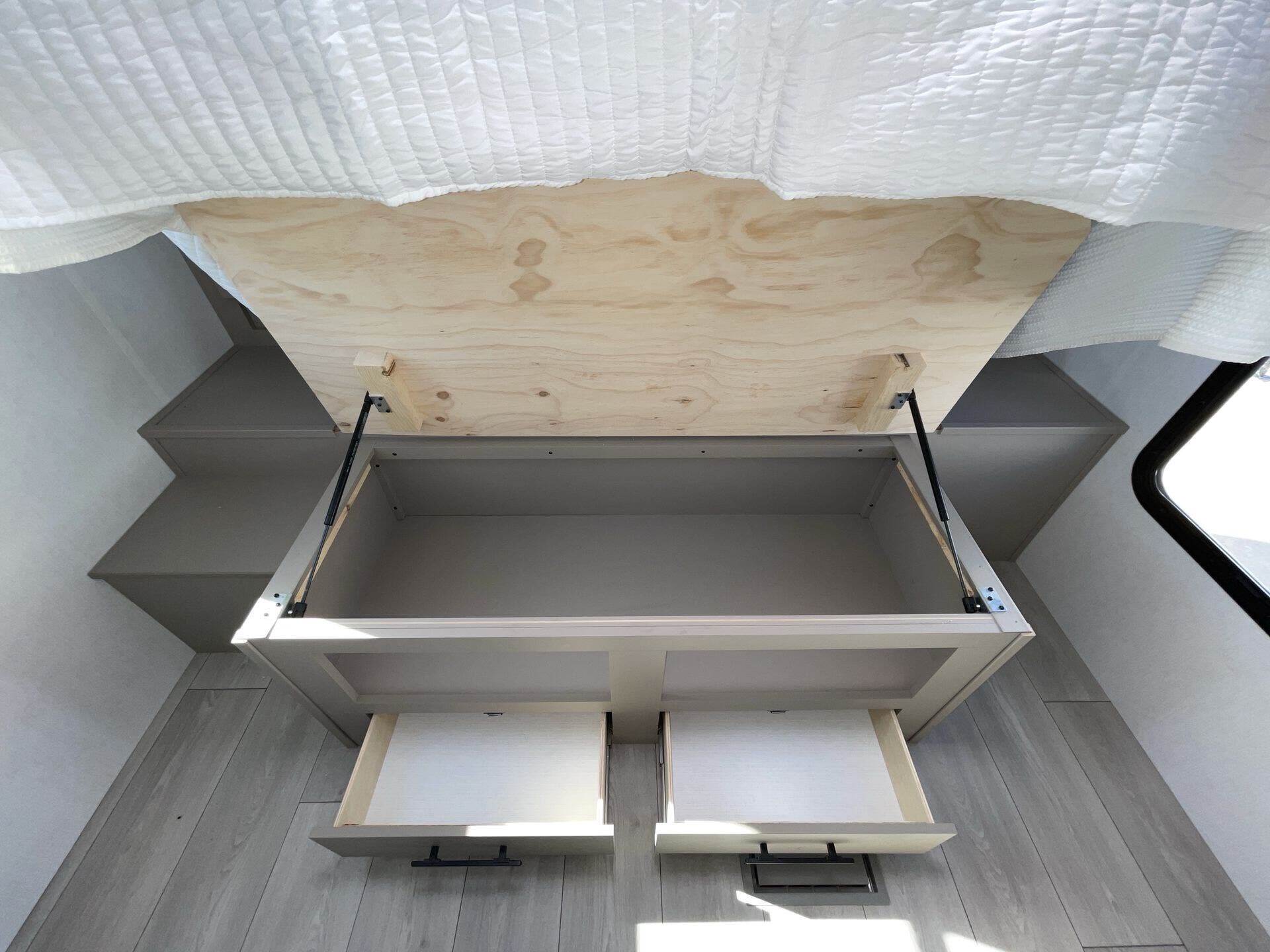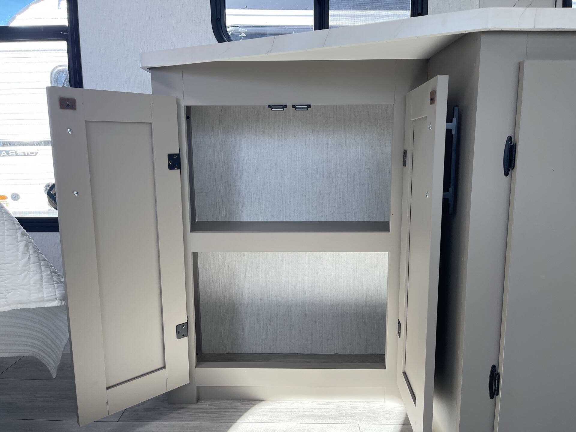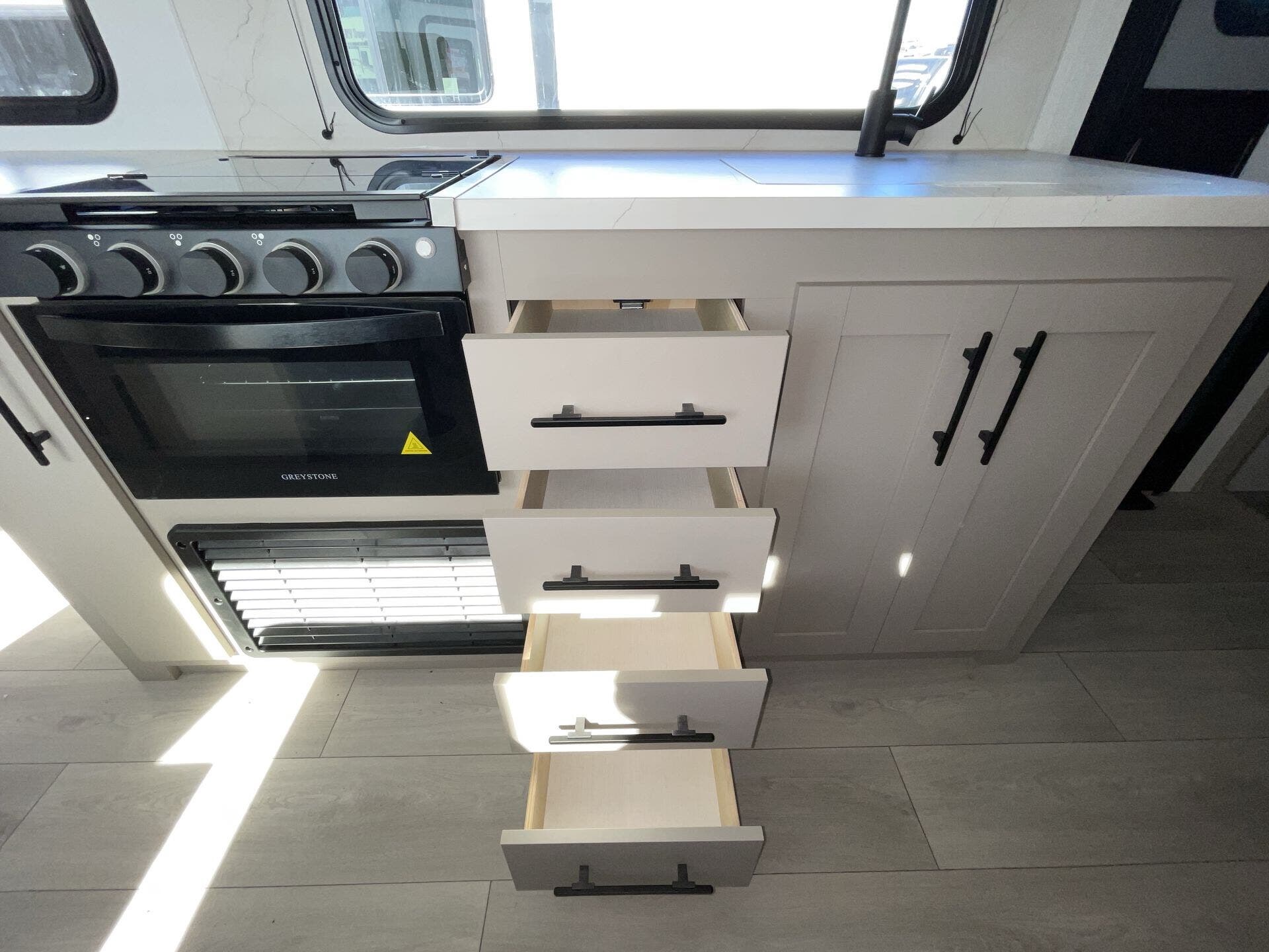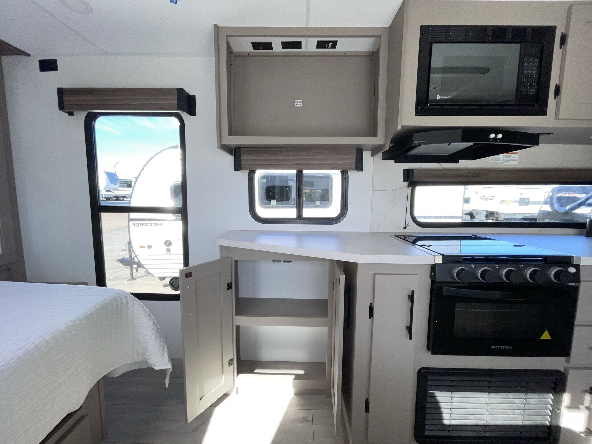 The living area in the middle is comfortable, with options for theater seating or sofa depending on how you like to relax at camp. The kitchen has enough counter space to make real meals, and the storage around it makes it easy to stay organized.