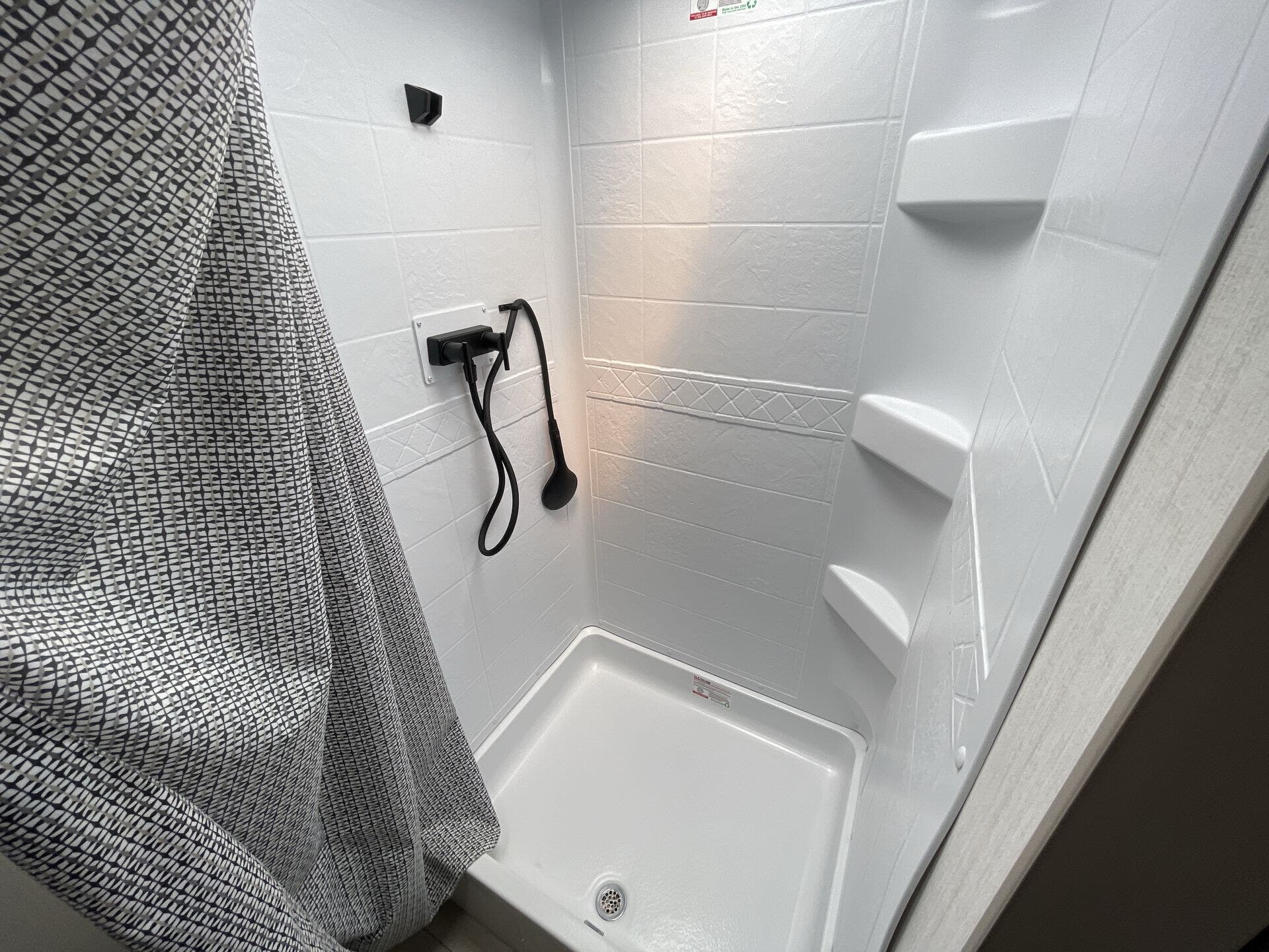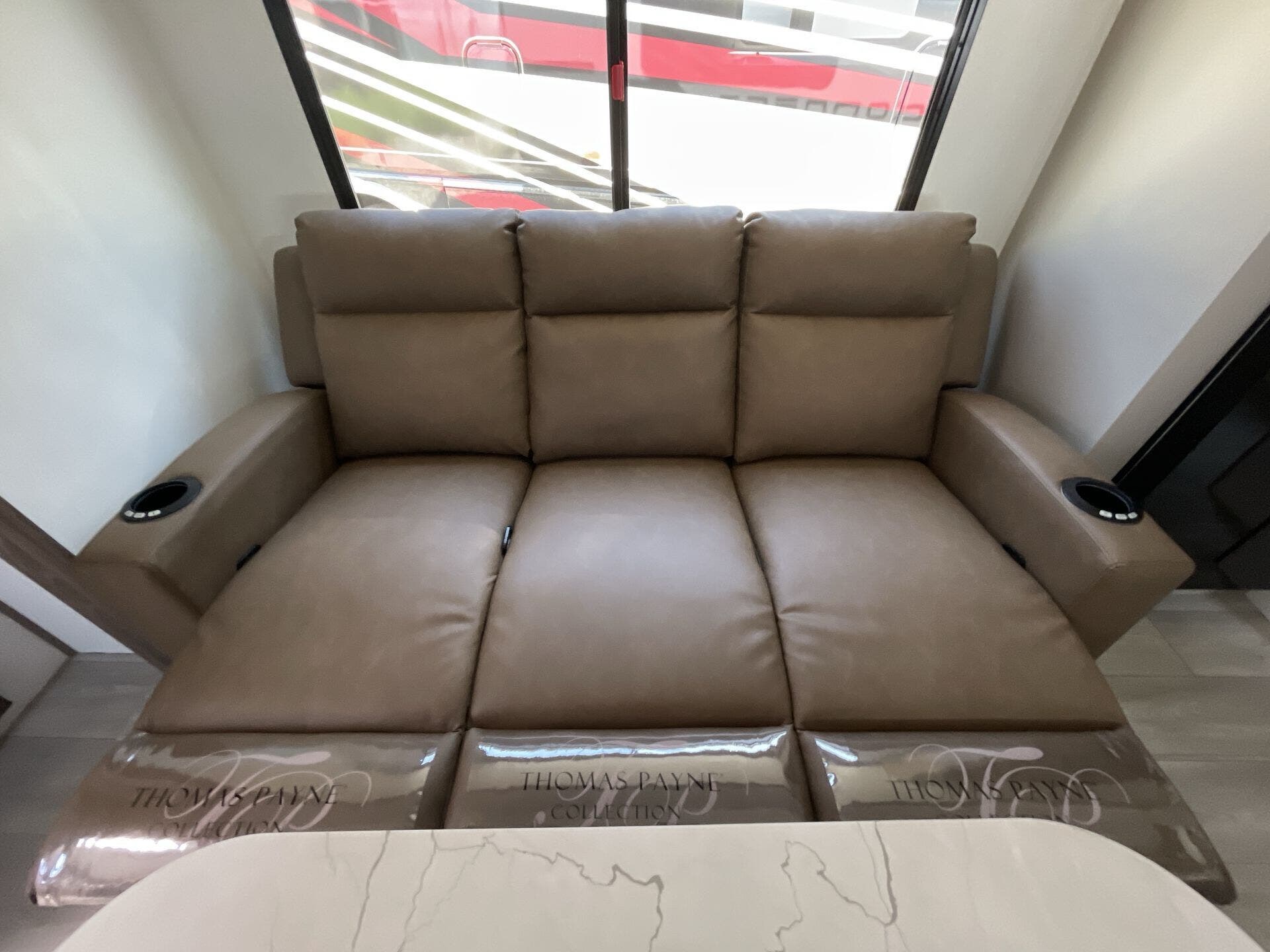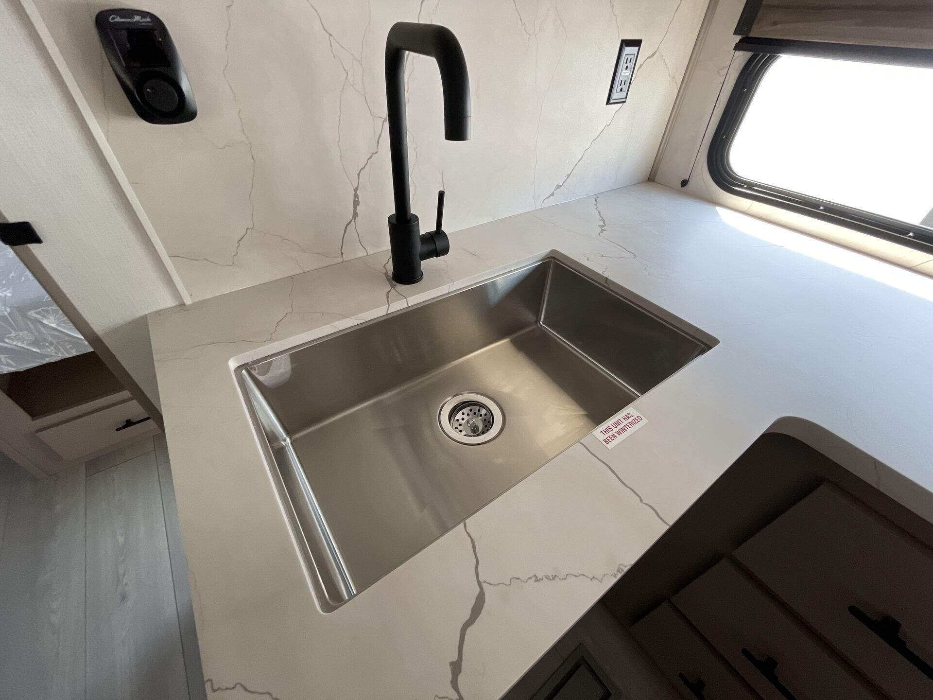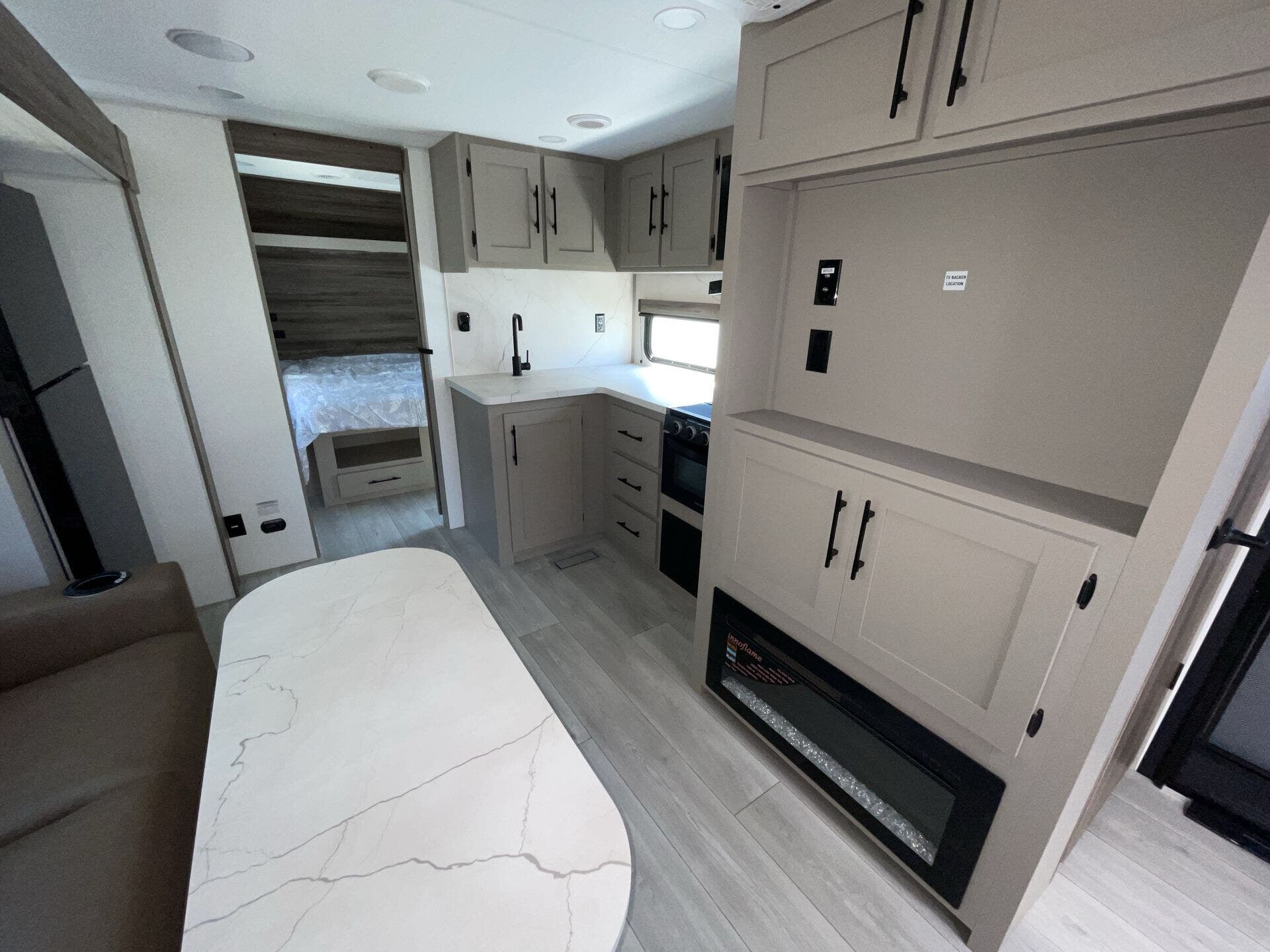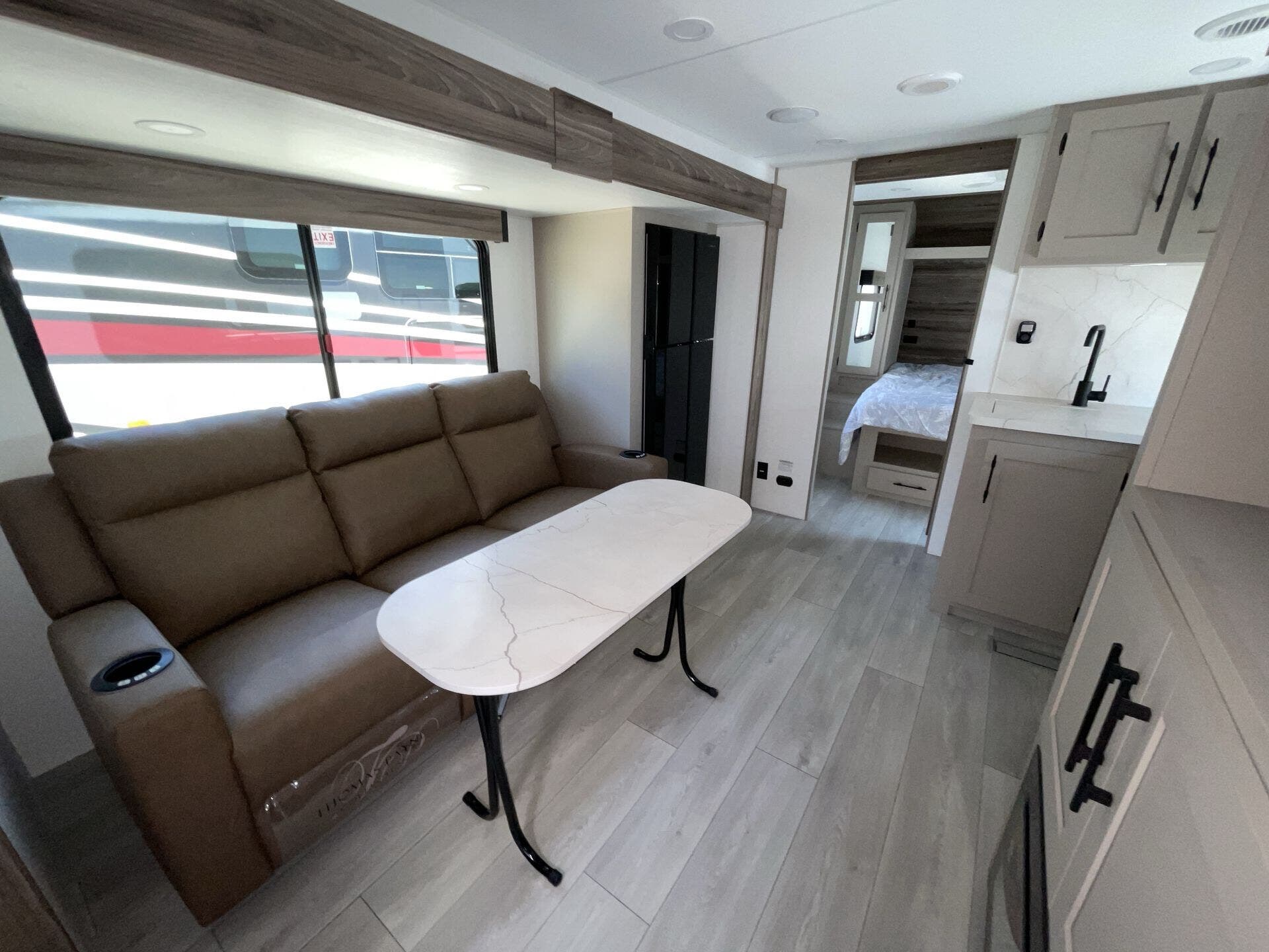 Step inside, and you’ll find a thoughtfully designed open-concept floorplan with a spacious rear bathroom that features a large shower, linen storage, and plenty of room to get ready comfortably. The kitchen includes stainless steel appliances, a deep farmhouse sink, ample counter space, and a pantry, making meal prep simple and enjoyable. In the living area, a booth dinette and a comfortable sofa provide cozy seating and dining space, while the entertainment center ensures you can relax and unwind at the end of the day.