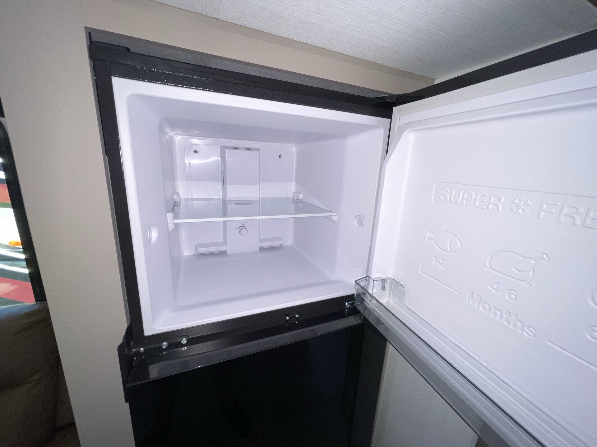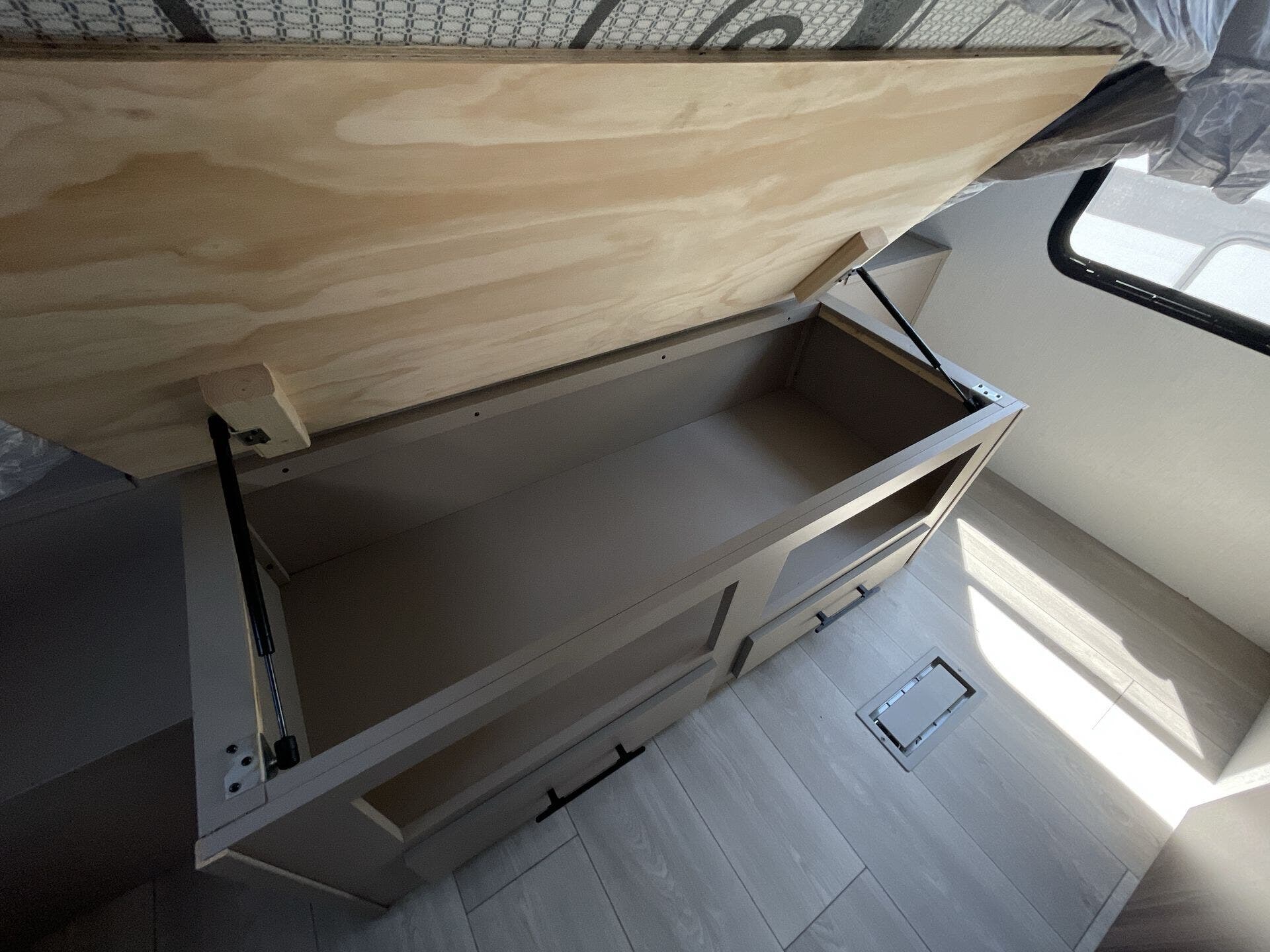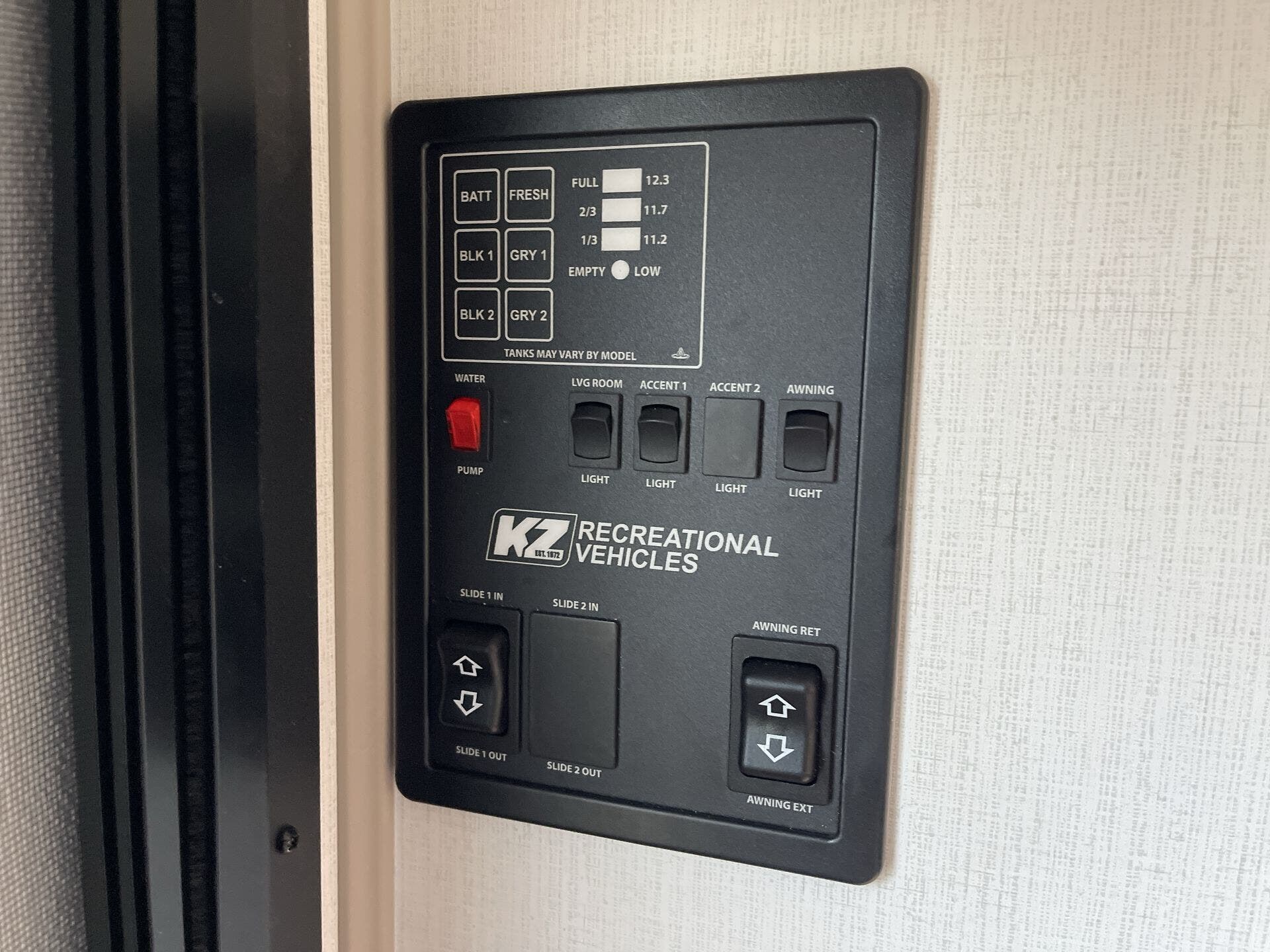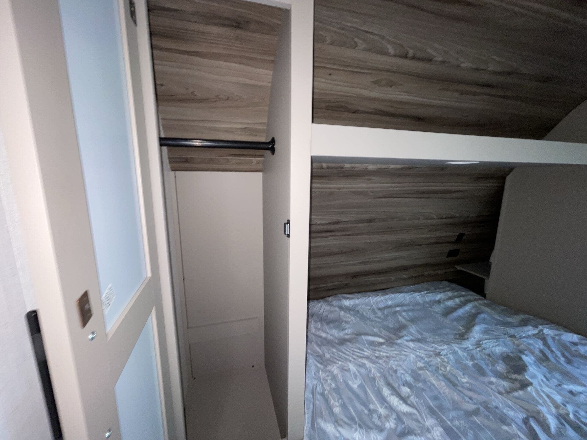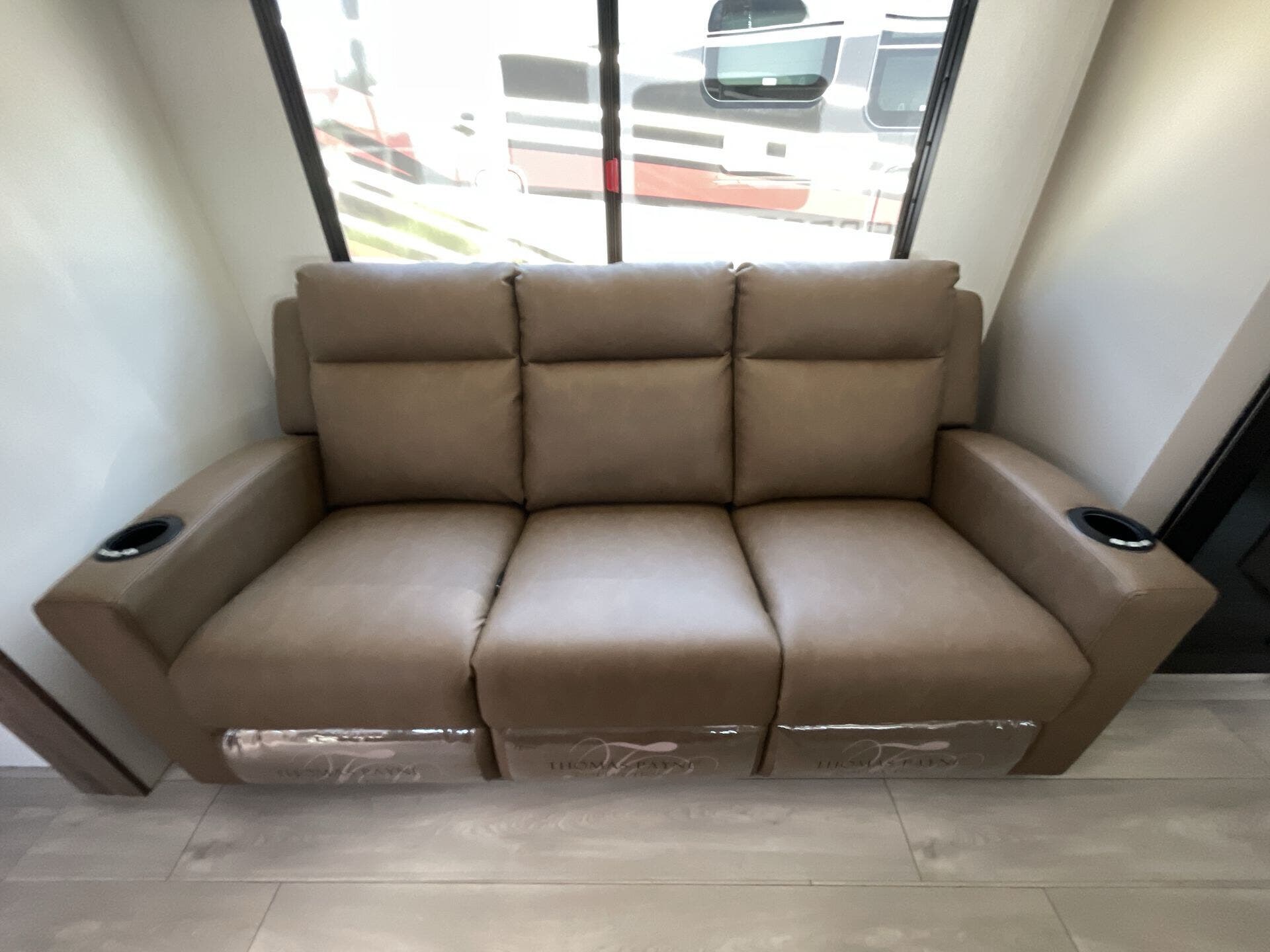 Step inside, and you’ll find a thoughtfully designed open-concept floorplan with a spacious rear bathroom that features a large shower, linen storage, and plenty of room to get ready comfortably. The kitchen includes stainless steel appliances, a deep farmhouse sink, ample counter space, and a pantry, making meal prep simple and enjoyable. In the living area, a booth dinette and a comfortable sofa provide cozy seating and dining space, while the entertainment center ensures you can relax and unwind at the end of the day.