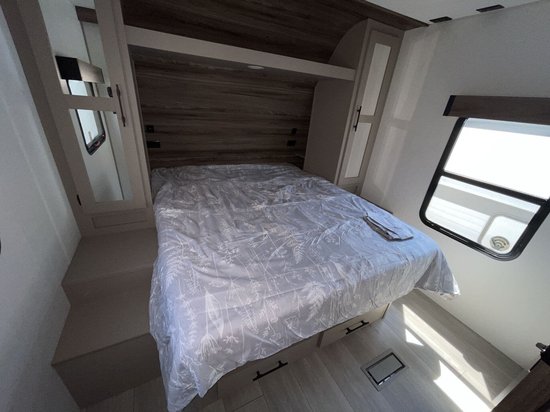 The private front bedroom offers a walk-around queen bed, dual wardrobes, and overhead storage, creating a relaxing retreat after your adventures. Outside, a power awning with LED lighting, pass-through storage, and an optional outdoor kitchen add even more convenience to your camping experience. Combining lightweight towability, modern amenities, and practical design, the 2026 K-Z Connect SE 221RB is the perfect travel trailer for couples ready to explore the open road in comfort and style.