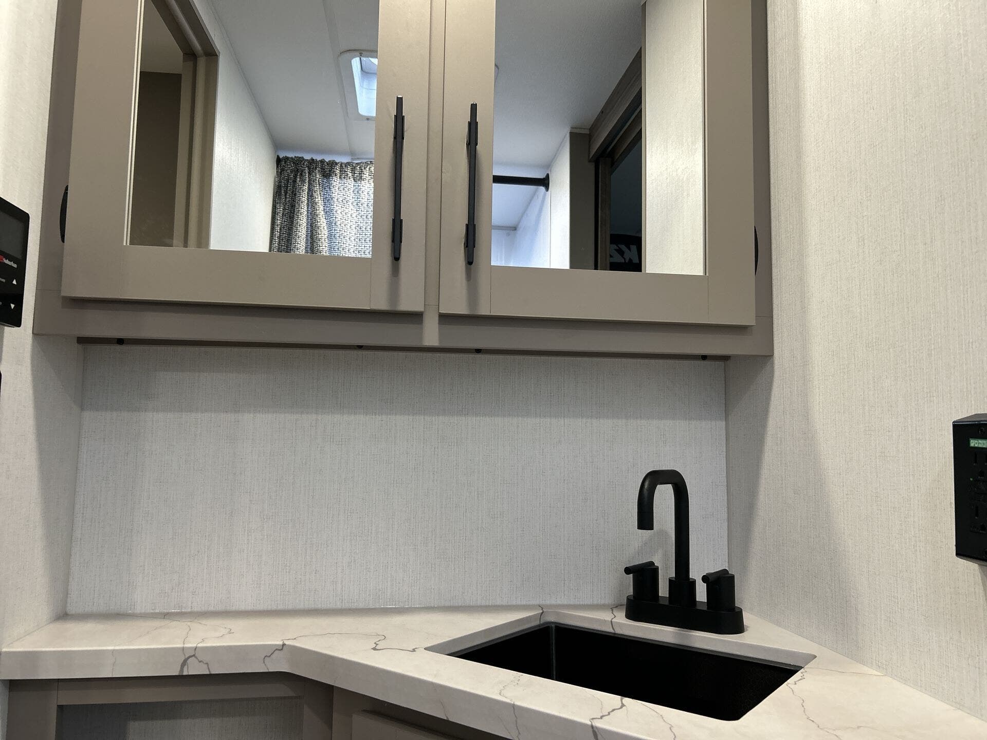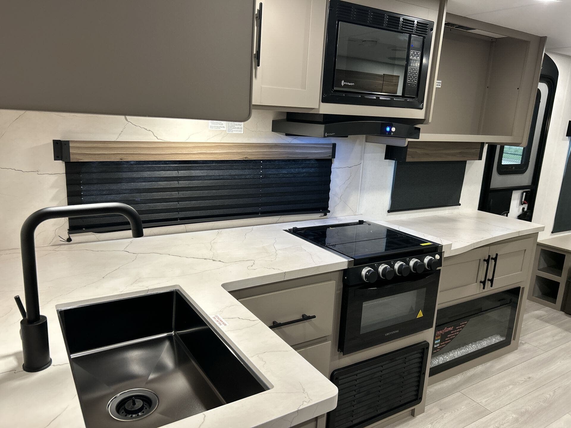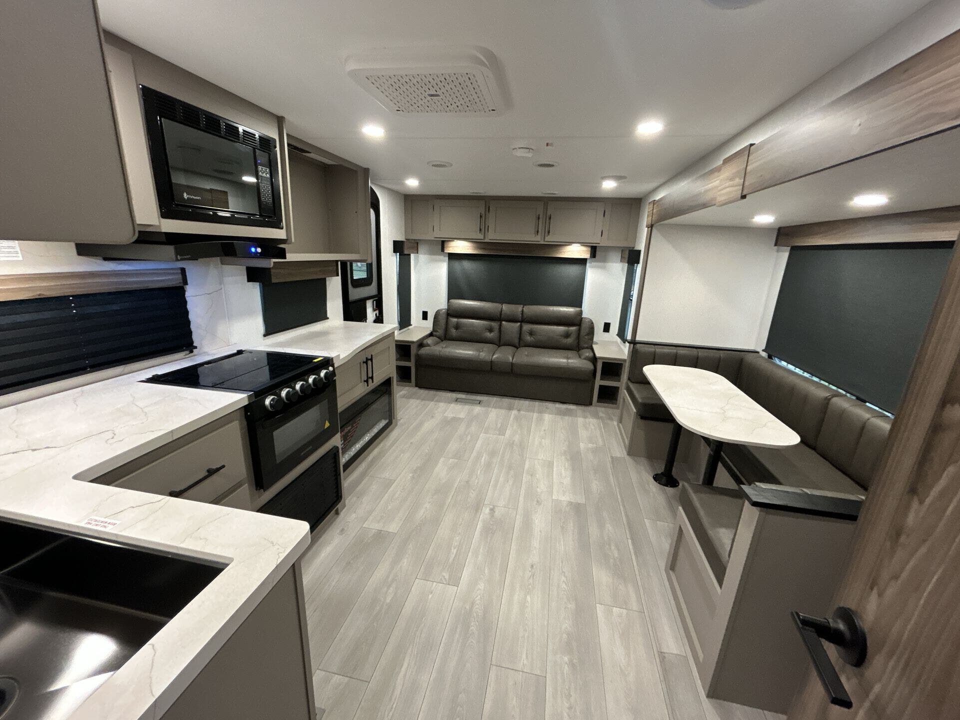 This travel trailer is packed with features that enhance everyday living on the road. It includes a microwave, oven, and refrigerator to simplify meal prep, plus a TV with an antenna for entertaining downtime. Safety is a priority with CO and LP detectors, a fire extinguisher, smoke detector, and a medicine cabinet for organizing essentials. The exterior amenities—power awning, outside kitchen, and ladder—make outdoor living convenient, while the enclosed underbelly helps protect utilities in varied weather conditions.