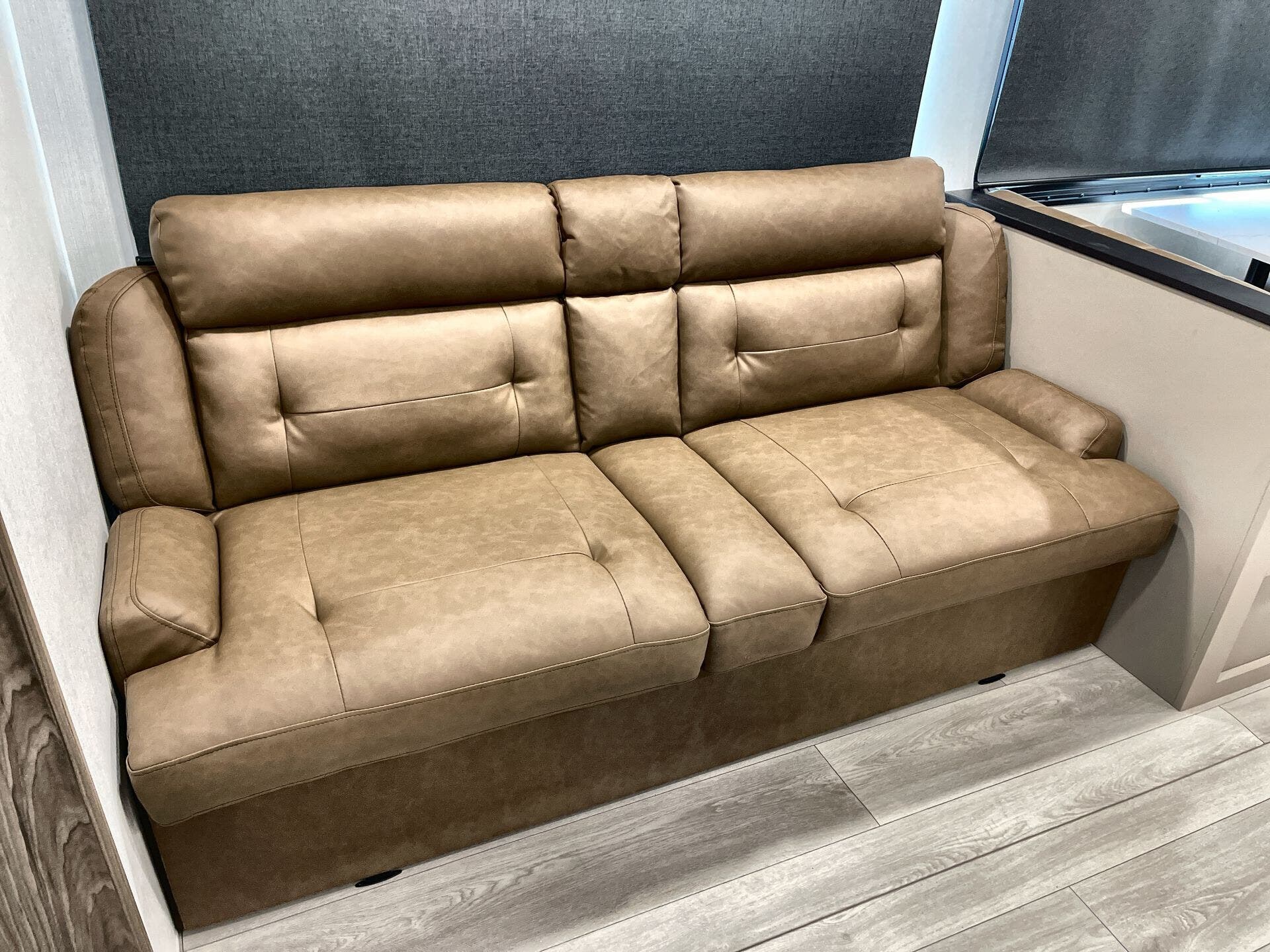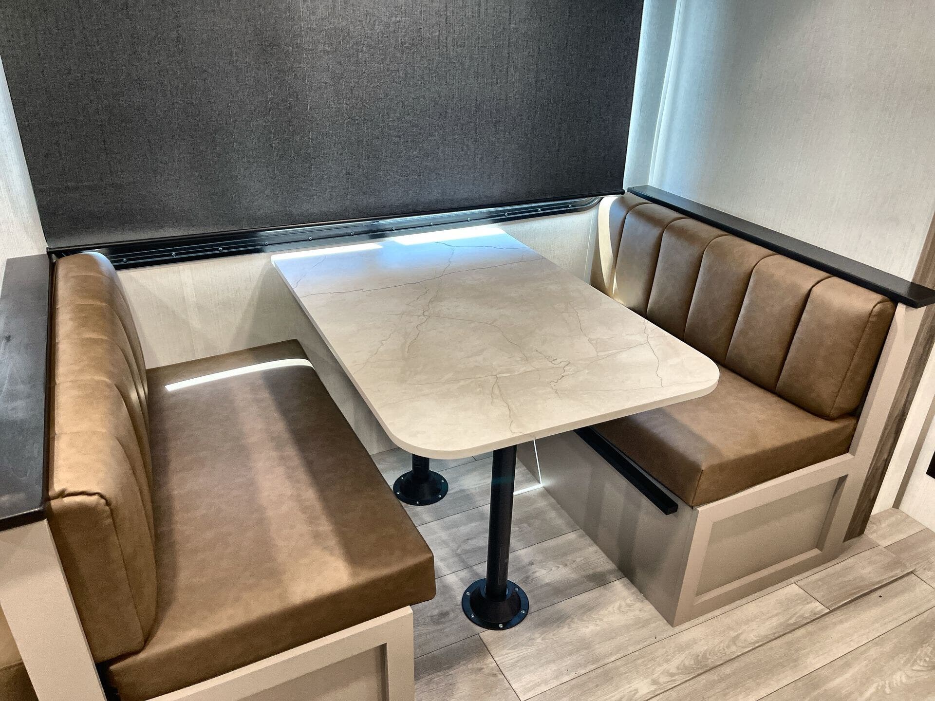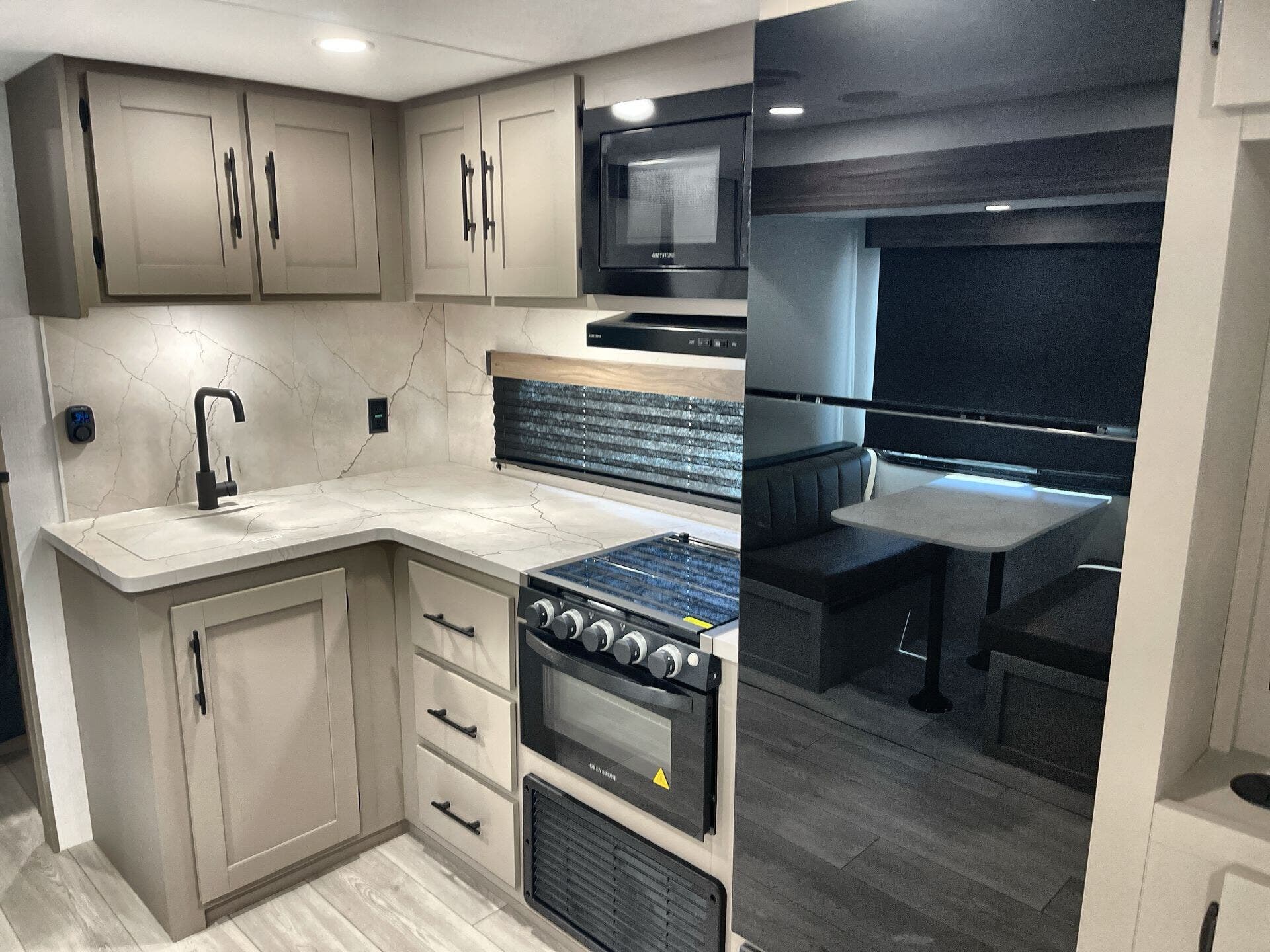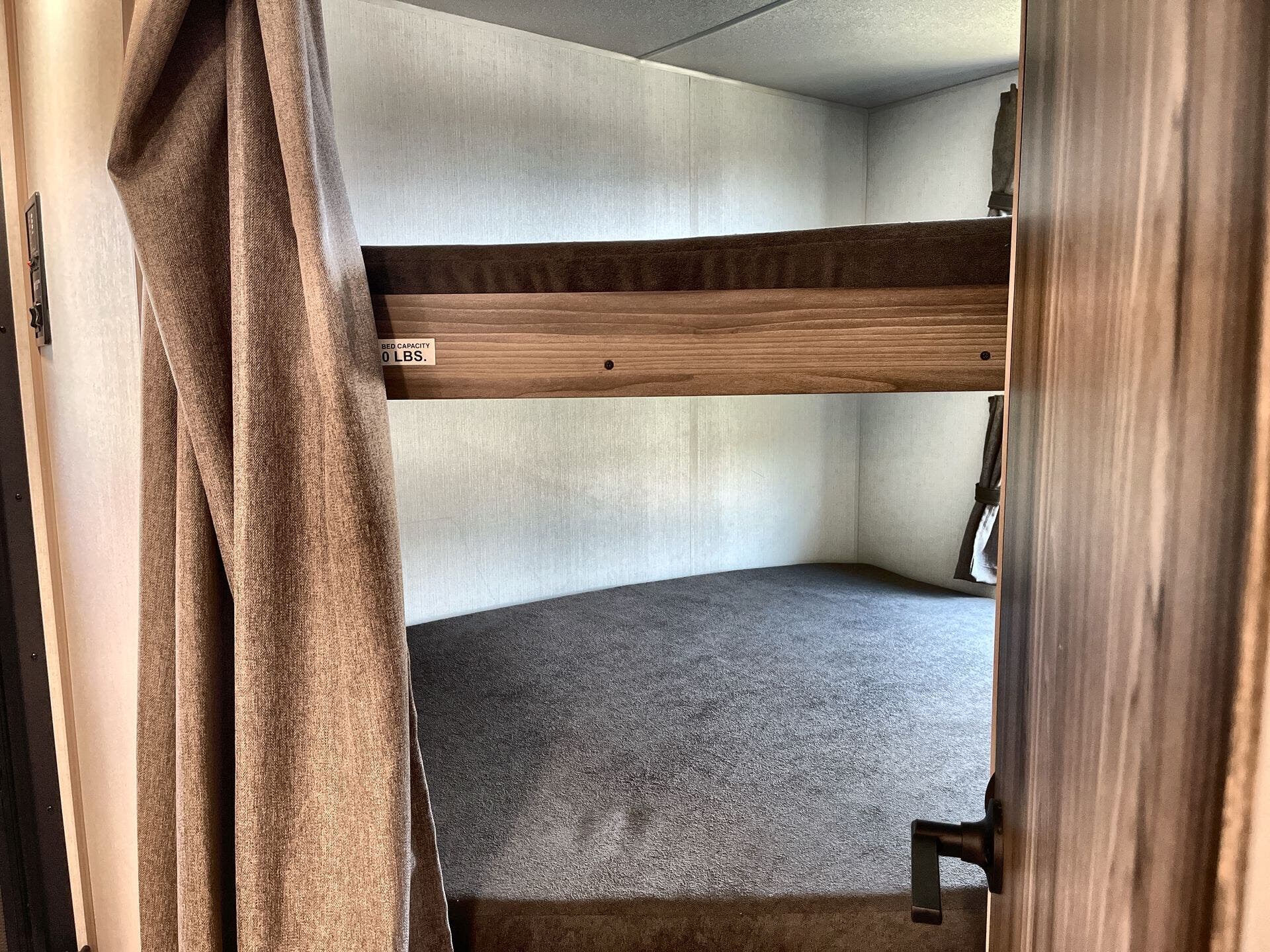 Inside, you’ll find a well-appointed interior with a large slide-out that opens up the living and dining space. The rear double-over-double bunks offer plenty of room for kids or guests, while the private front bedroom features a walk-around queen bed and sliding doors for added privacy. The kitchen is fully equipped with a three-burner cooktop, oven, microwave, and 10 cu. ft. refrigerator, plus ample storage and counter space. A booth dinette and jackknife sofa provide additional seating and sleeping flexibility, all in a bright, modern decor.