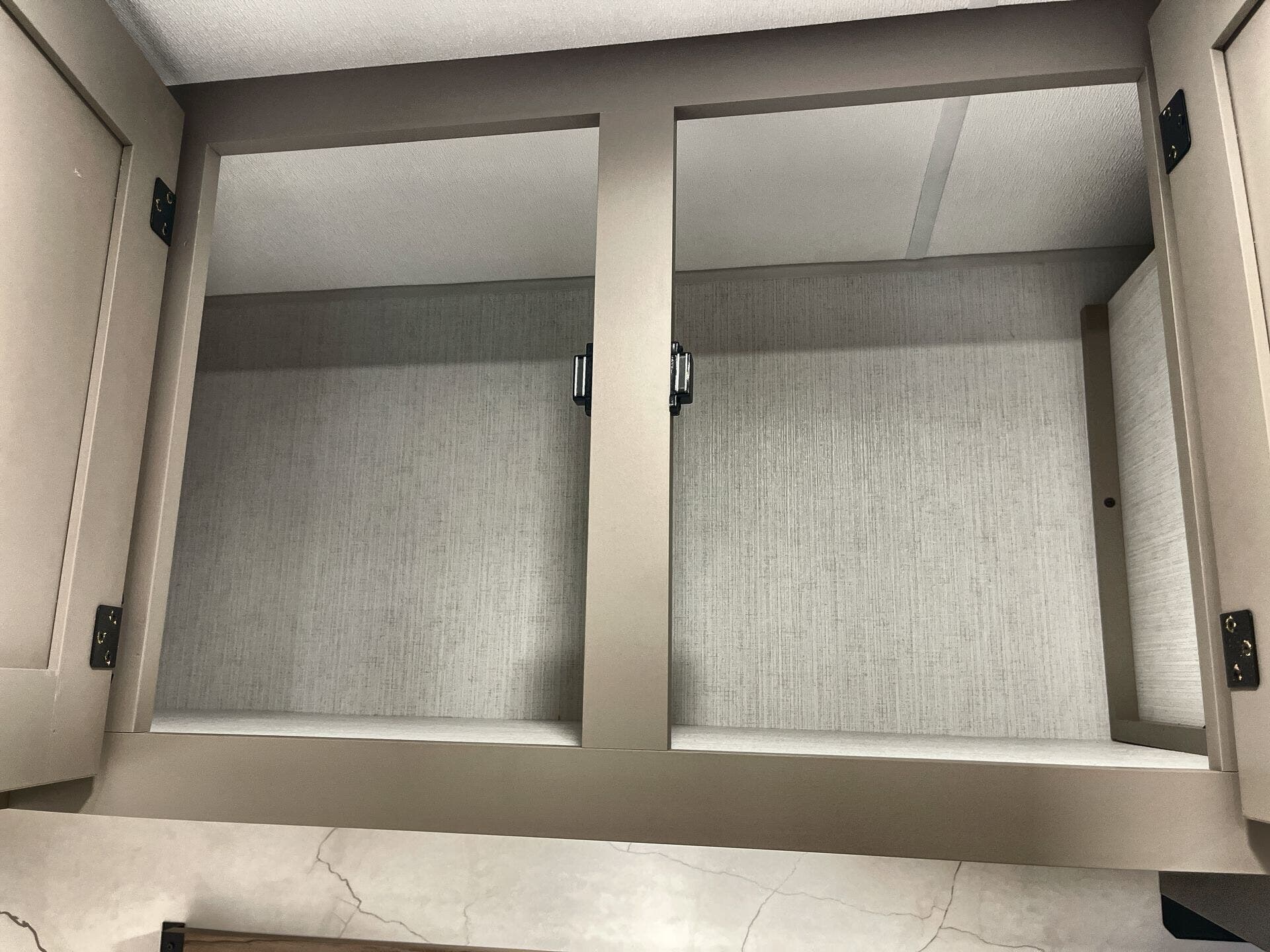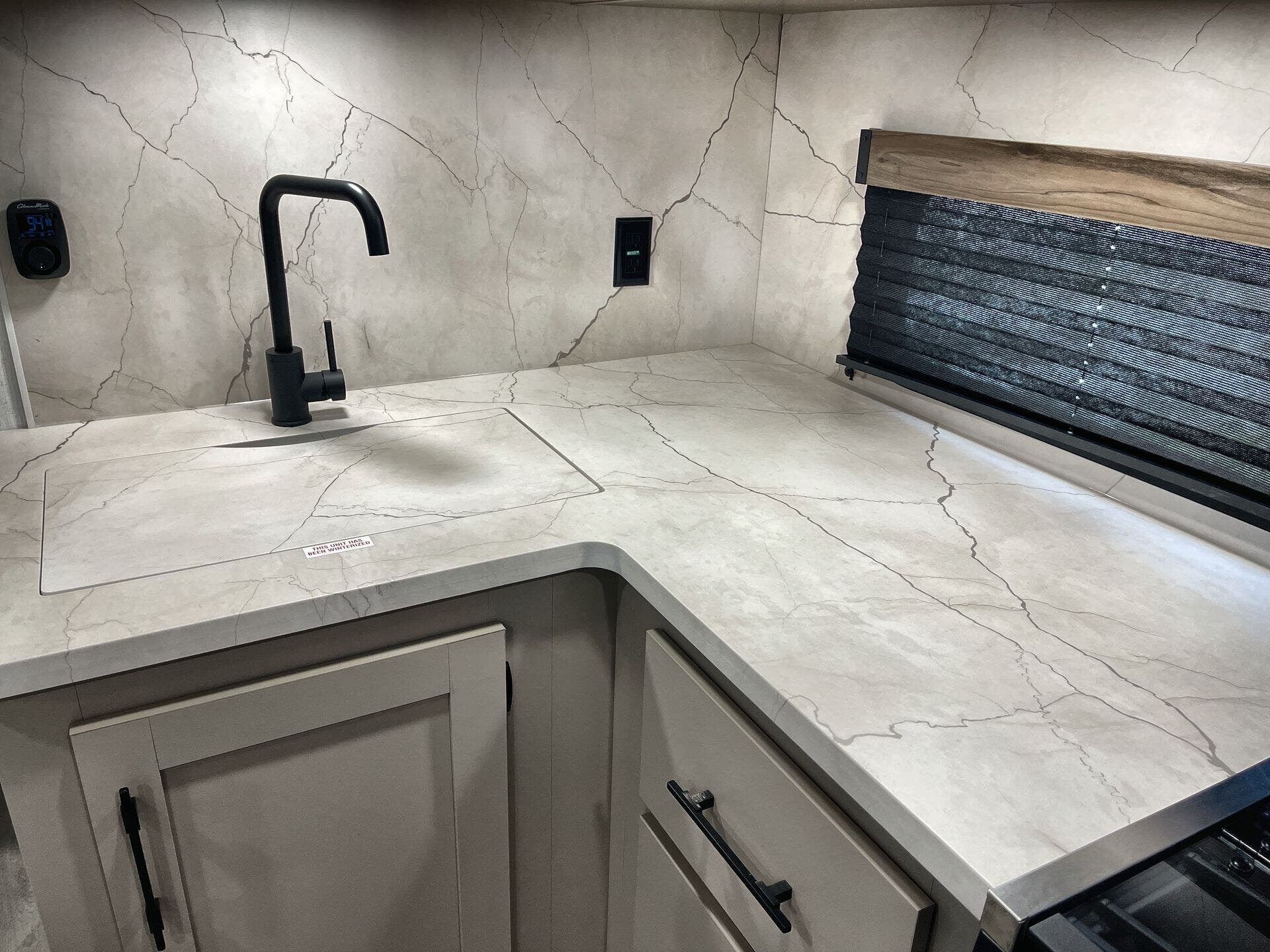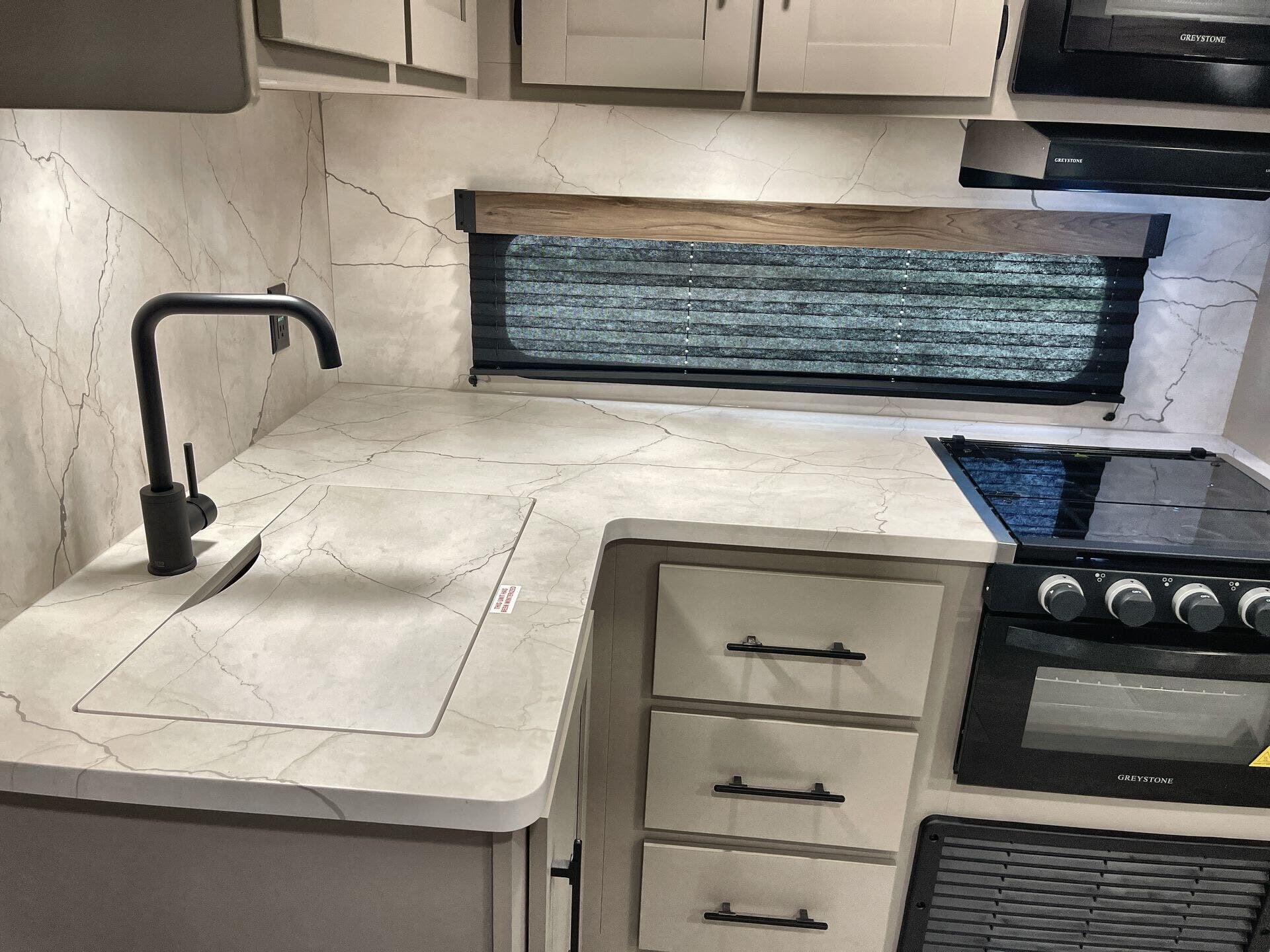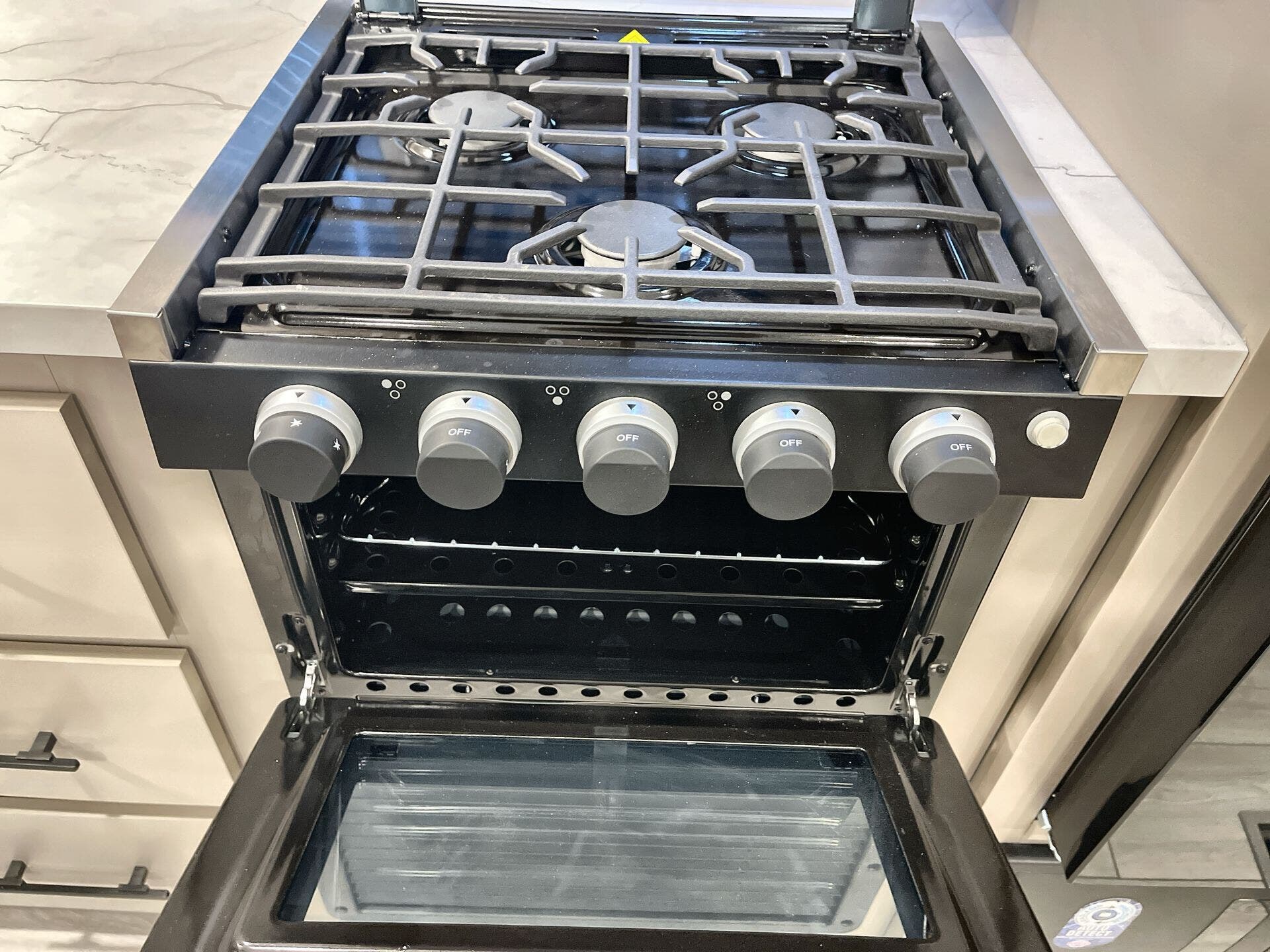 Inside, you’ll find a well-appointed interior with a large slide-out that opens up the living and dining space. The rear double-over-double bunks offer plenty of room for kids or guests, while the private front bedroom features a walk-around queen bed and sliding doors for added privacy. The kitchen is fully equipped with a three-burner cooktop, oven, microwave, and 10 cu. ft. refrigerator, plus ample storage and counter space. A booth dinette and jackknife sofa provide additional seating and sleeping flexibility, all in a bright, modern decor.