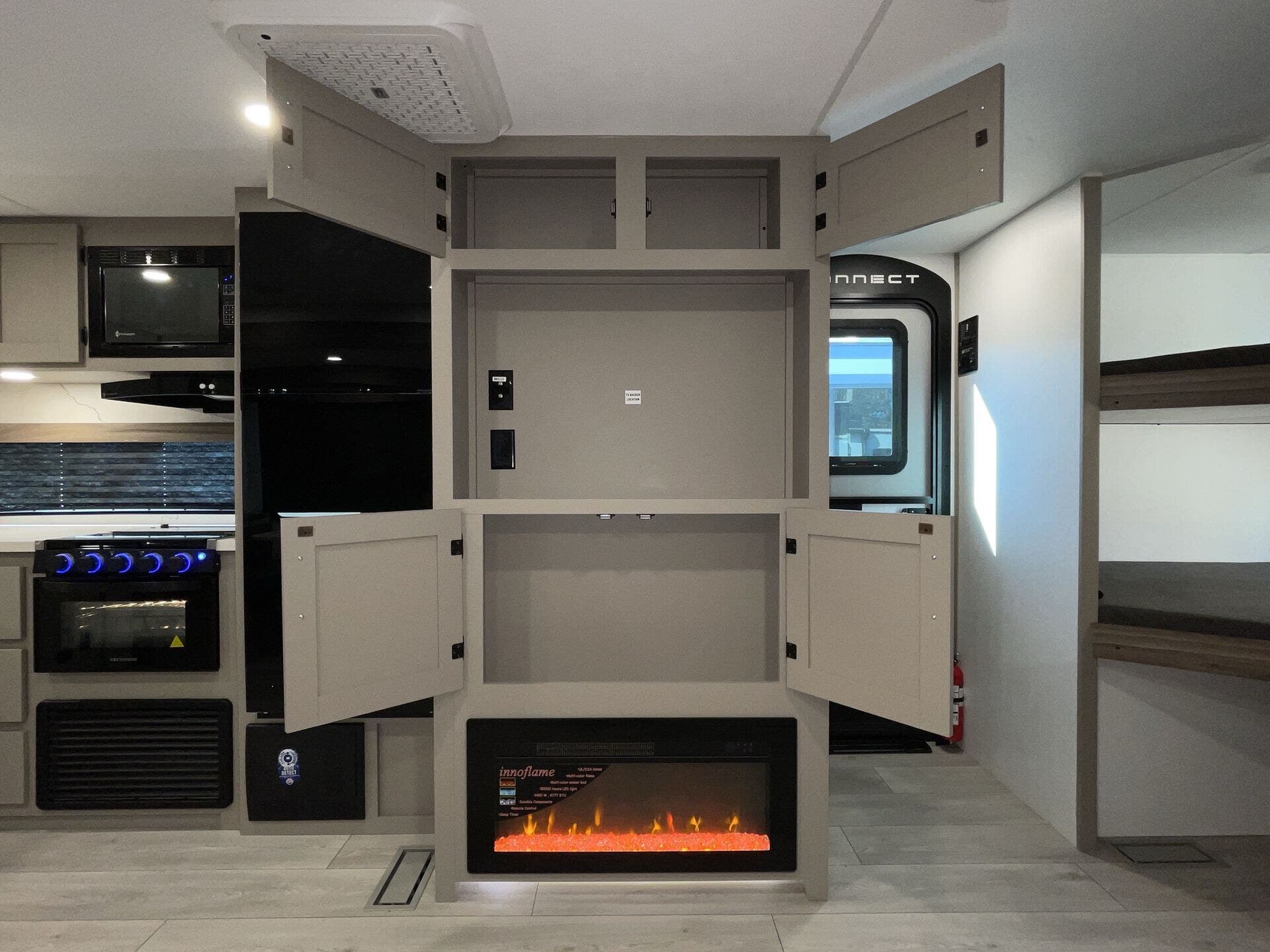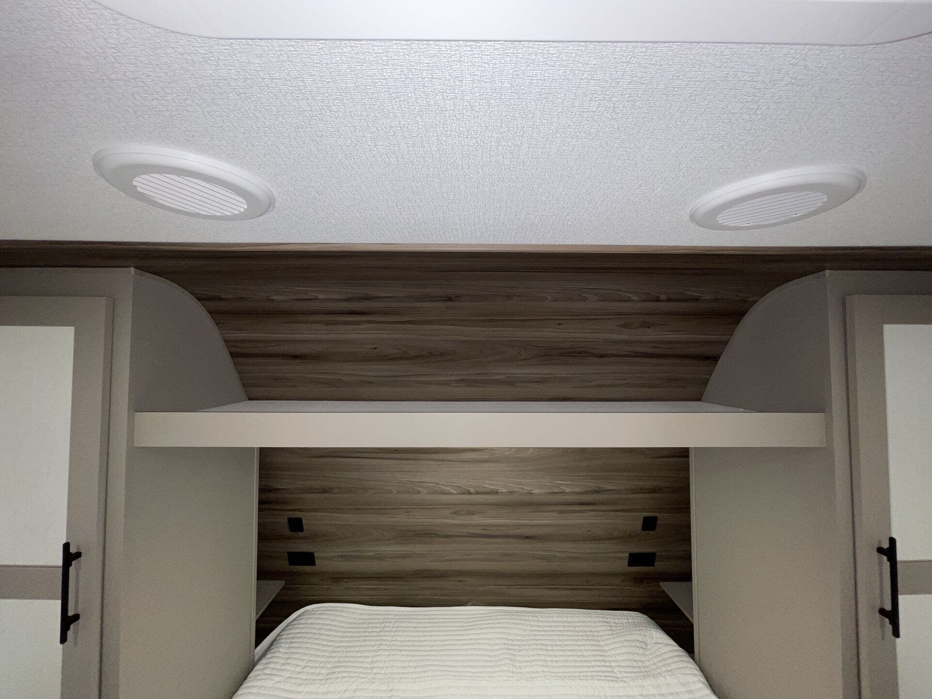 Bunk Beds, Dinette Bed, Fireplace, Kitchen Sink, Medicine Cabinet, Overhead Cabinetry, Pantry, Pet Friendly, Queen Bed, Roof Vents, Shower, Sofa Bed, Solid Surface Countertops, Toilet, Wardrobe(s) -