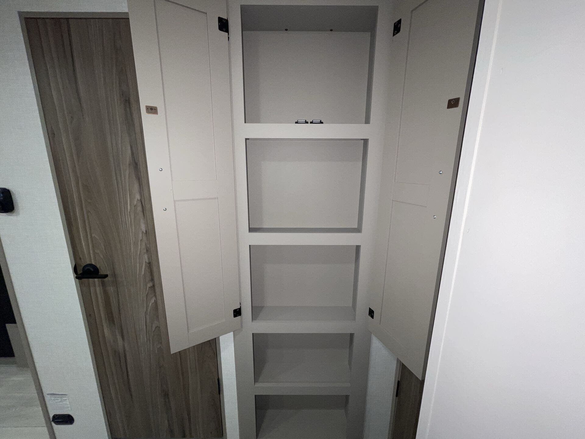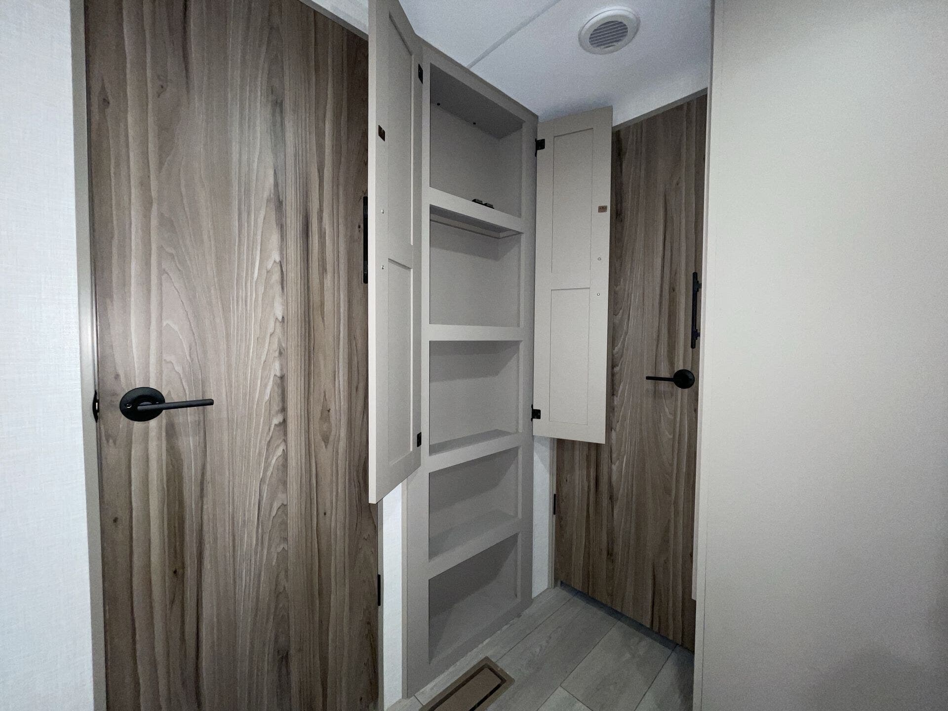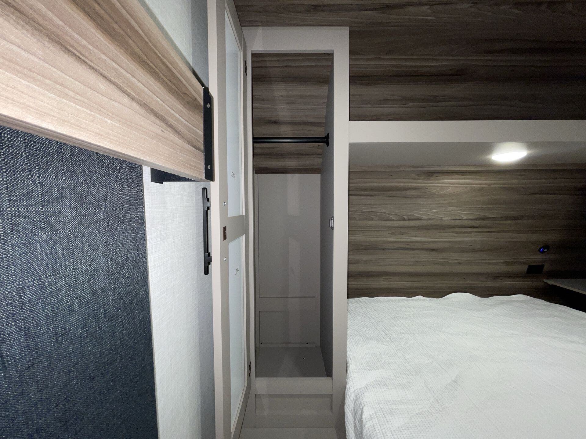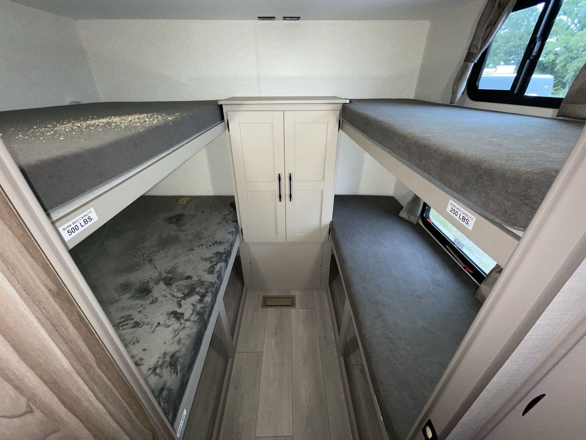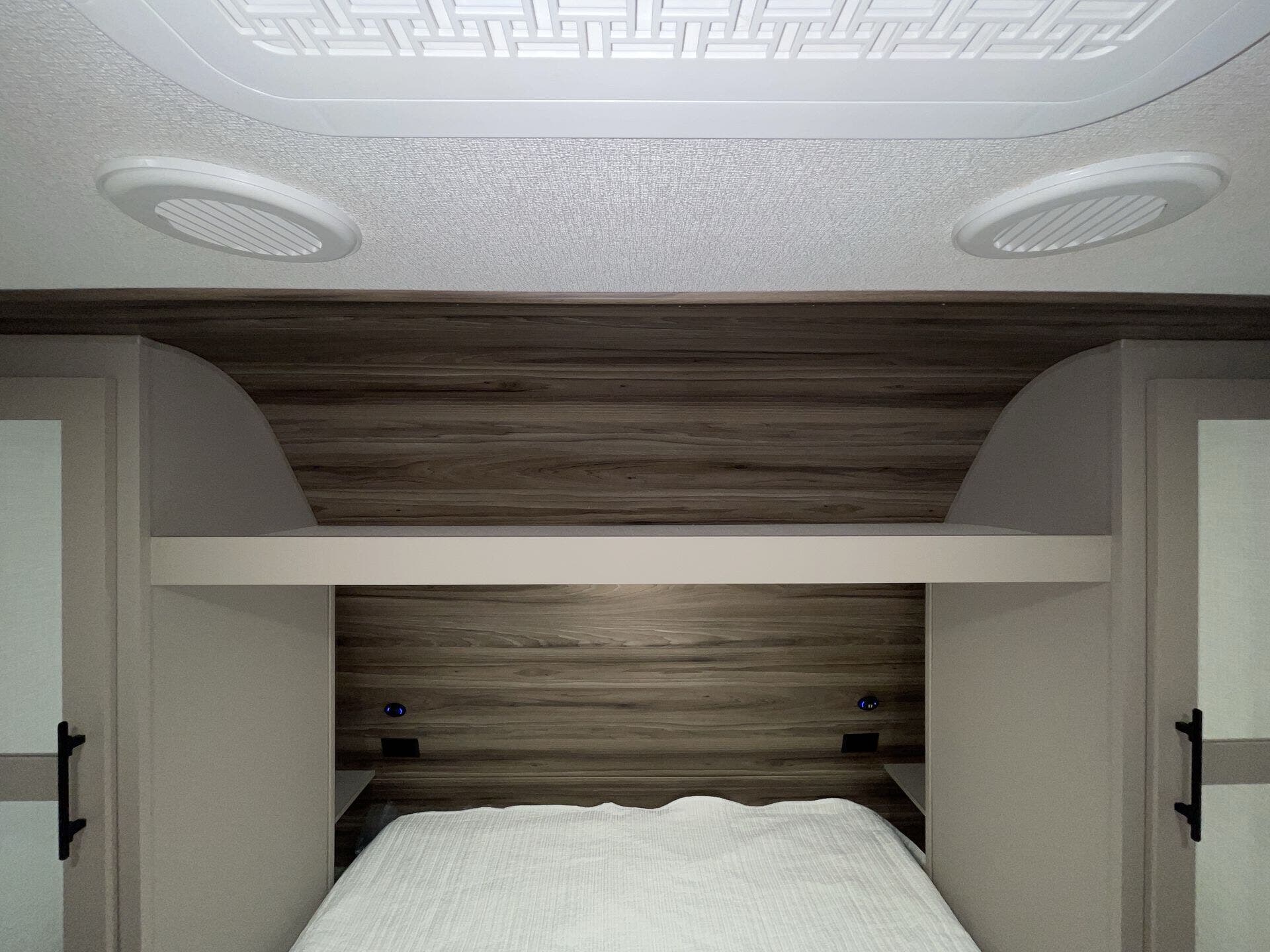 Booth Dinette, Bunk Beds, Dinette Bed, Kitchen Sink, Medicine Cabinet, Overhead Cabinetry, Pantry, Queen Bed, Roof Vents, Shower, Sofa Bed, Toilet, Wardrobe(s)