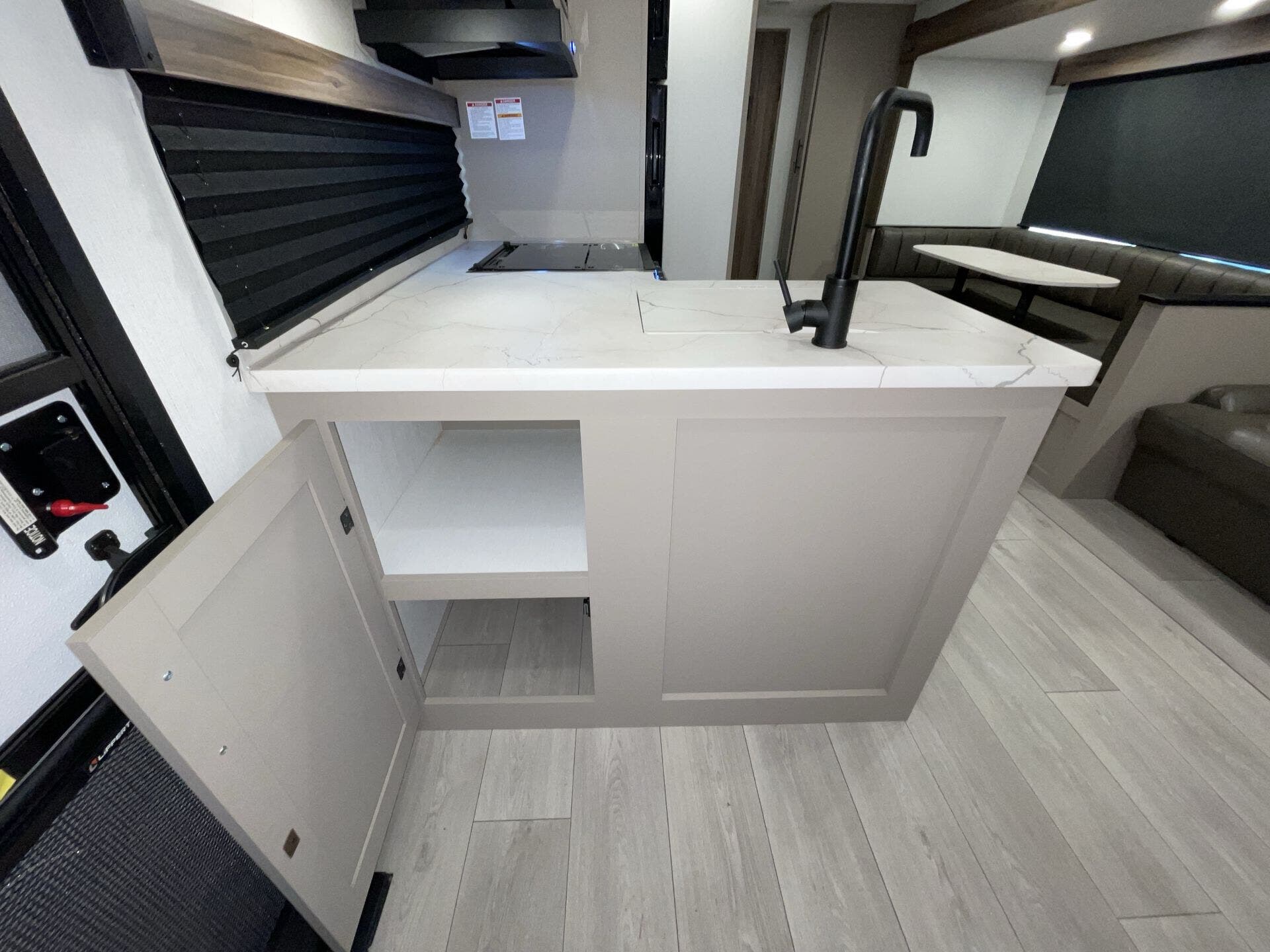 Awning, Detachable Power Cord, Enclosed Underbelly, Exterior Speakers, Ladder, Outside Kitchen, Pass Thru Storage, Power Awning, Roof Deck, Roof Vent, Screen Door, Skylight, Slideout, Stabilizer Jacks -