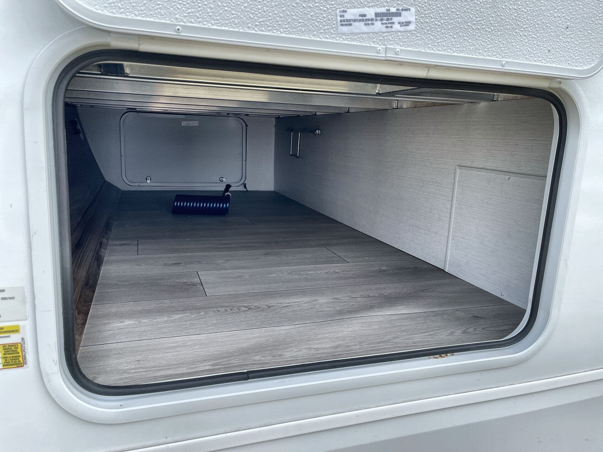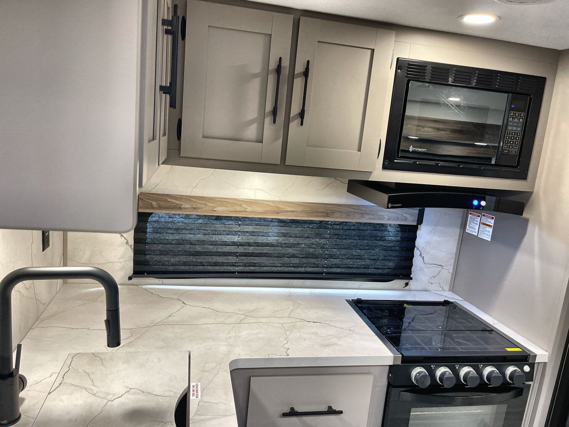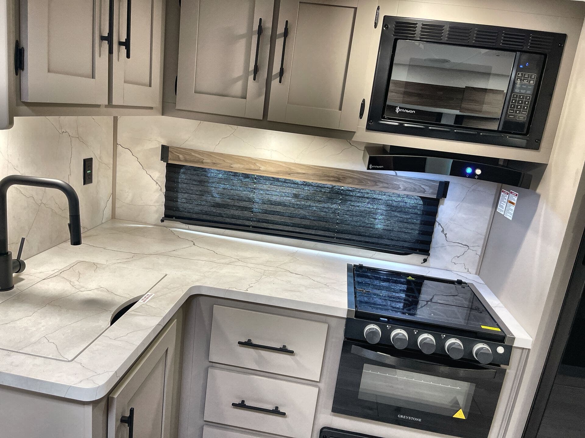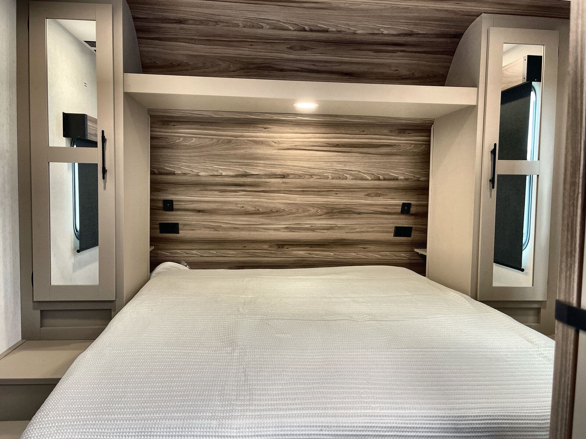 Outside, it includes a 20′ power awning with LED lighting, pass-through storage, and an optional outdoor kitchen for alfresco meals.