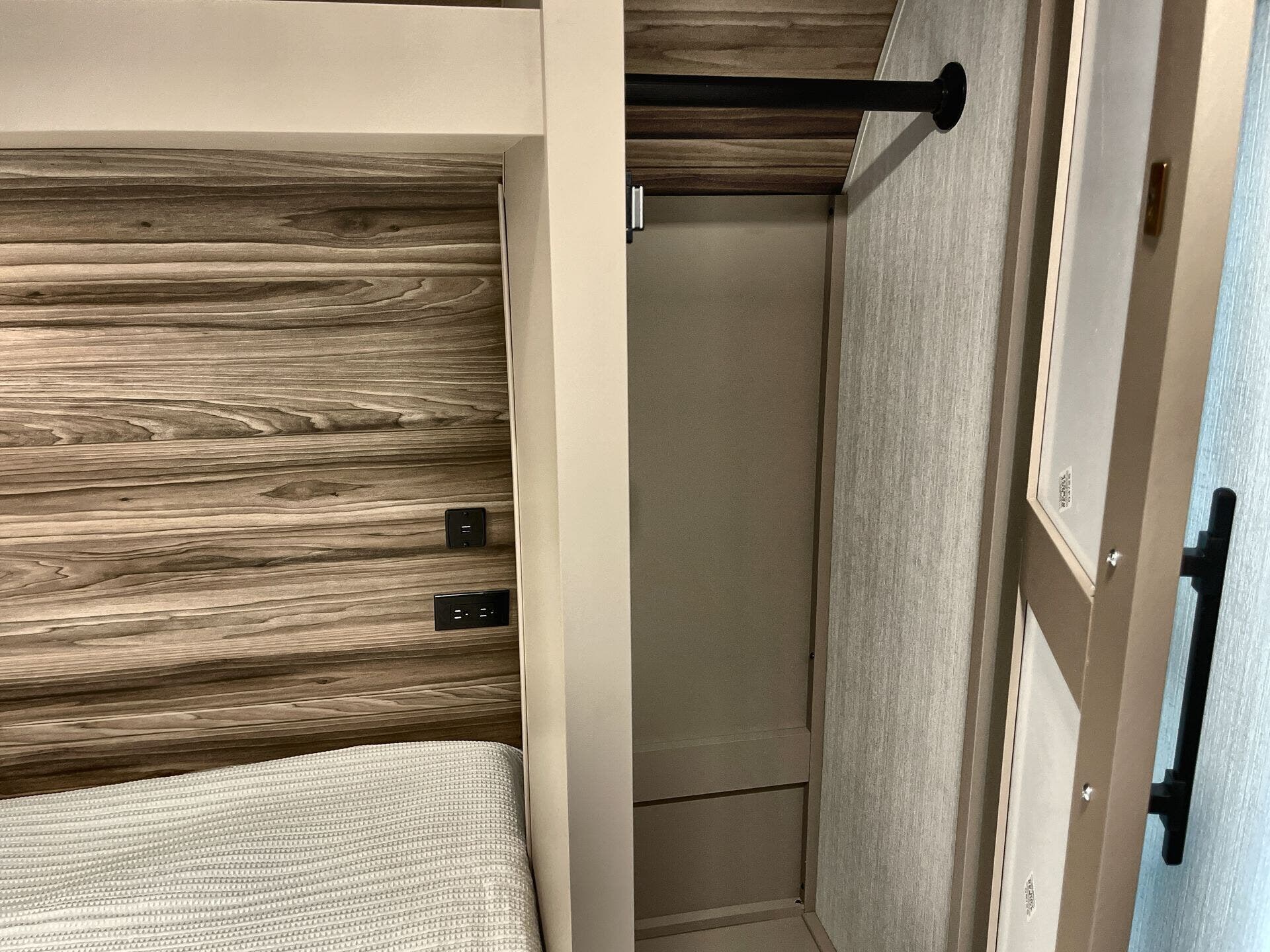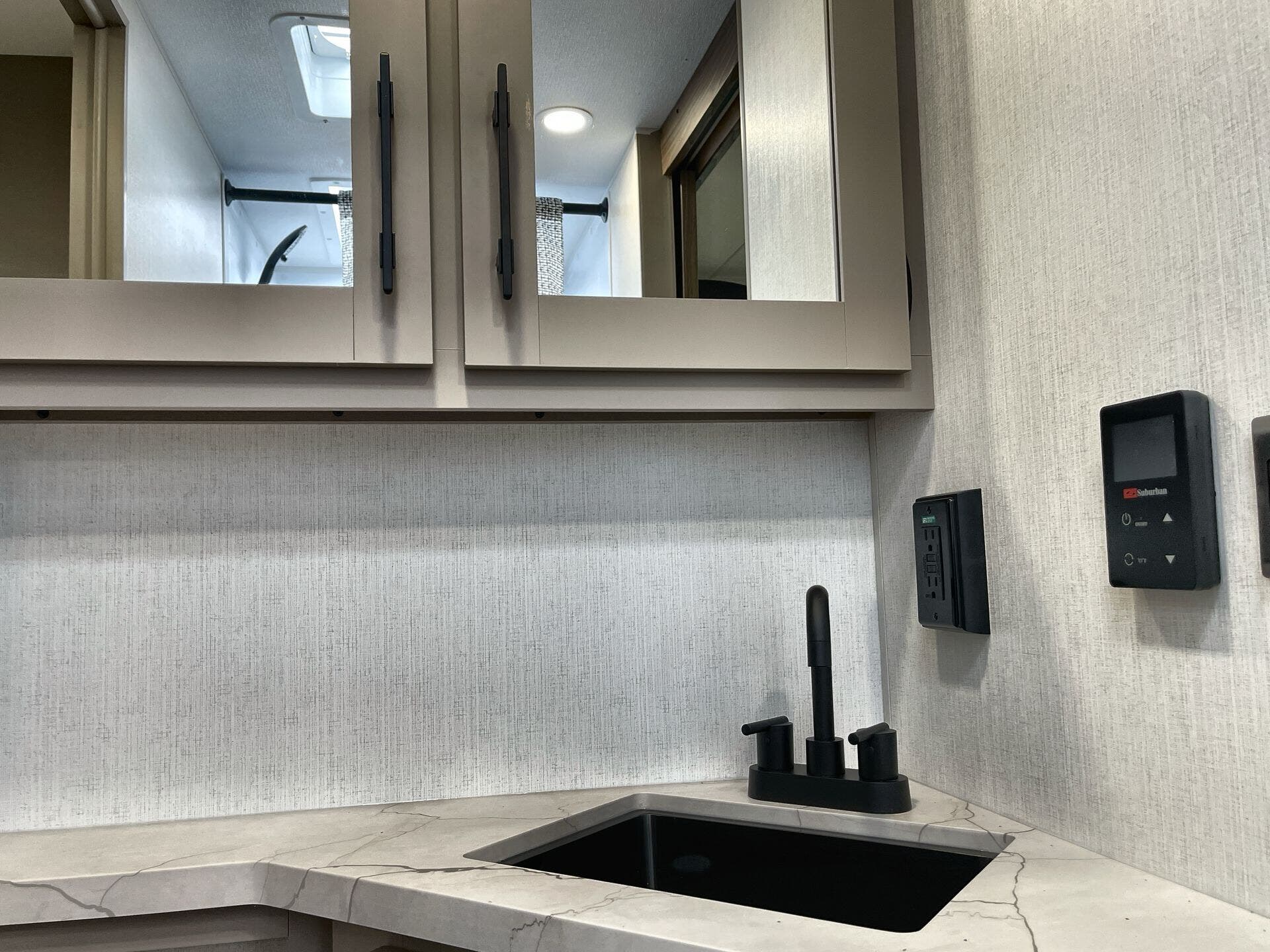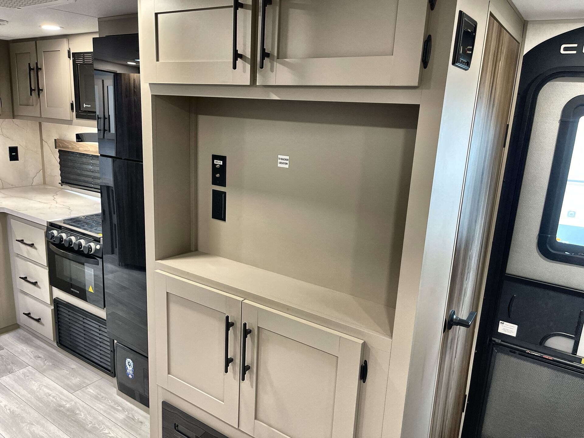 Outside, it includes a 20′ power awning with LED lighting, pass-through storage, and an optional outdoor kitchen for alfresco meals.