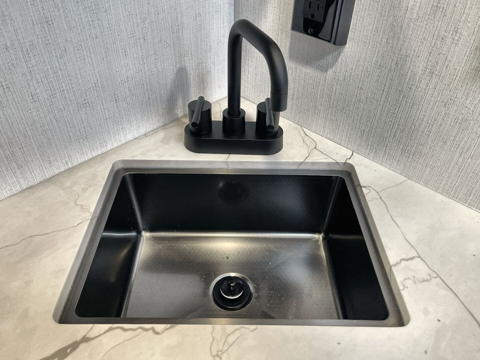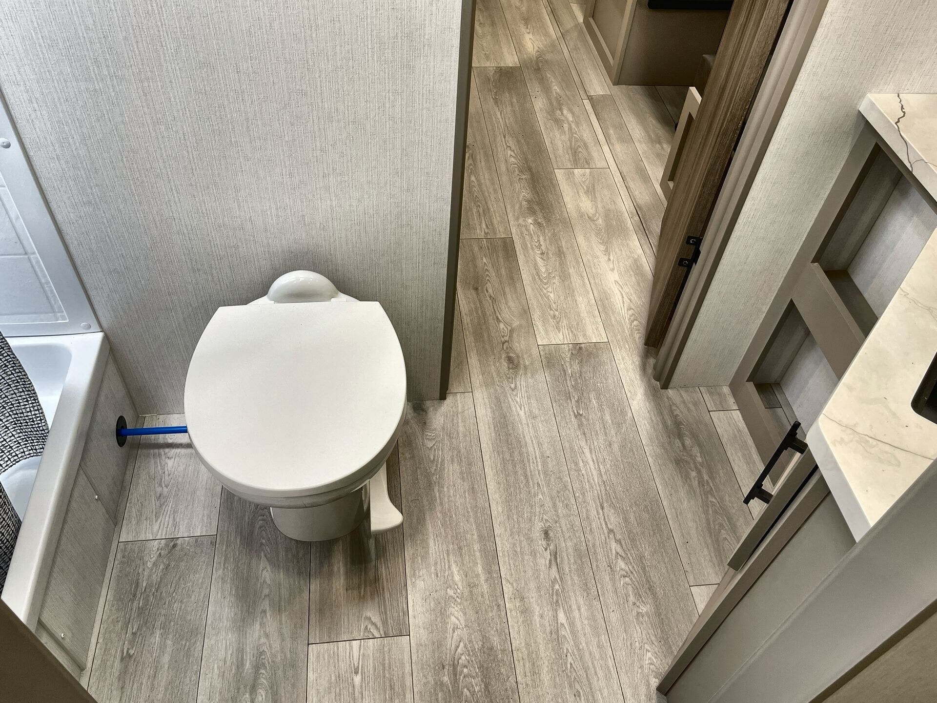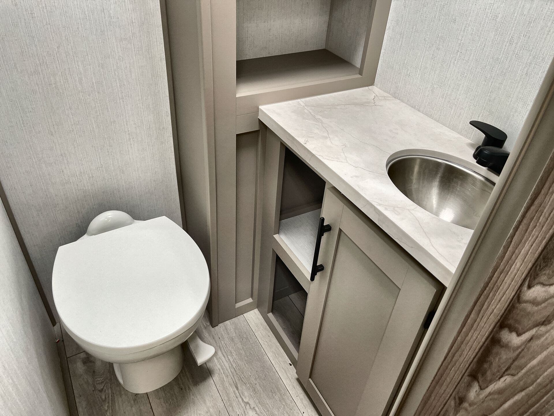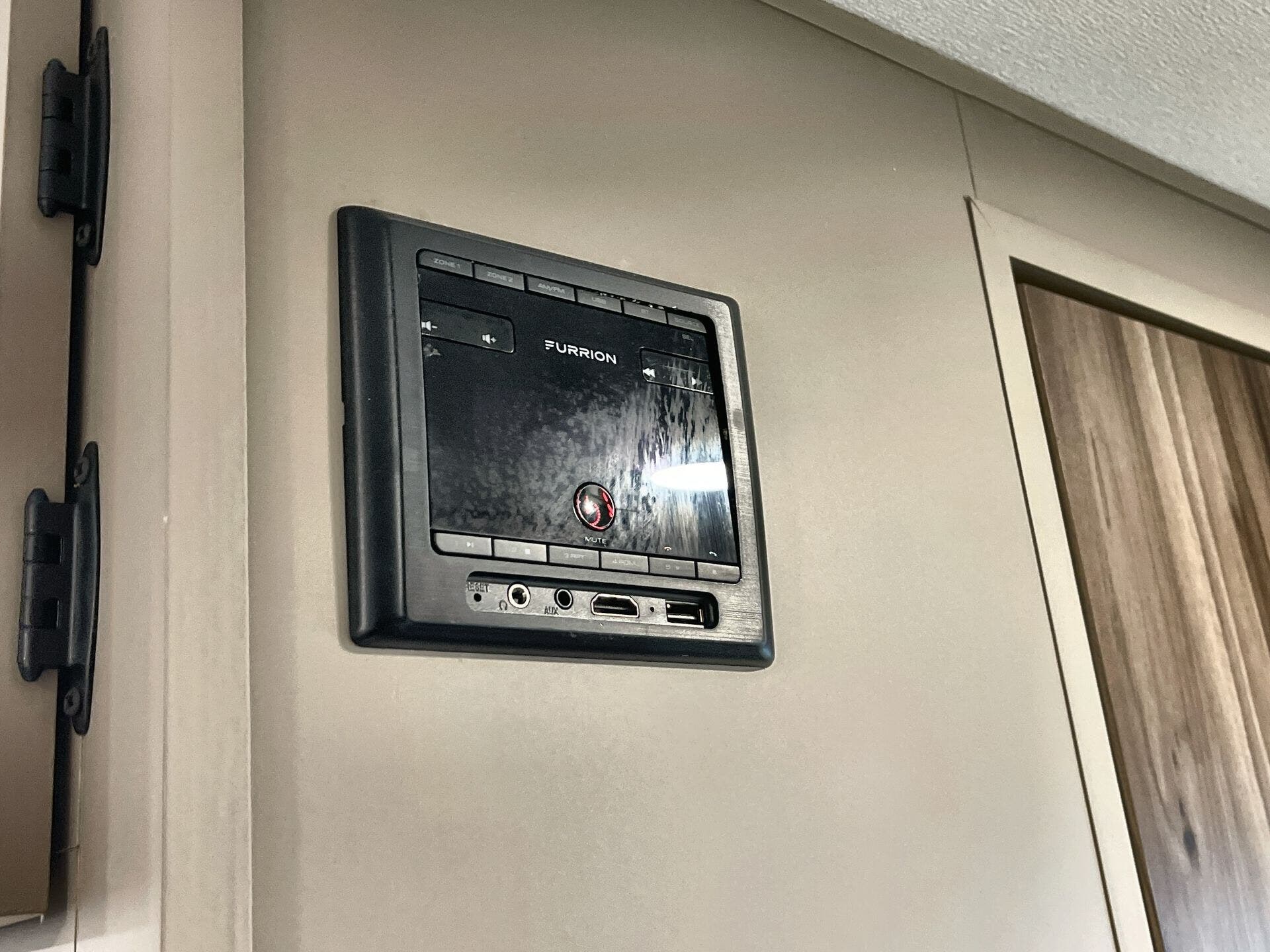 Outside, it includes a 20′ power awning with LED lighting, pass-through storage, and an optional outdoor kitchen for alfresco meals.