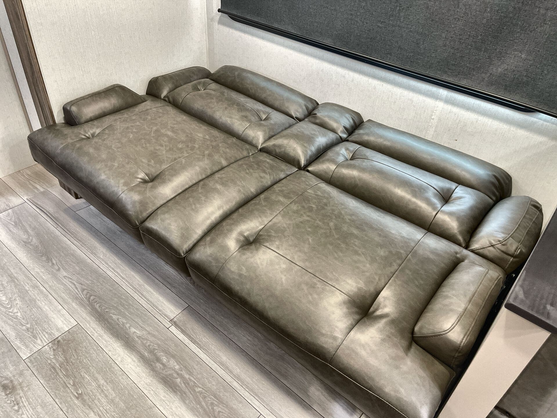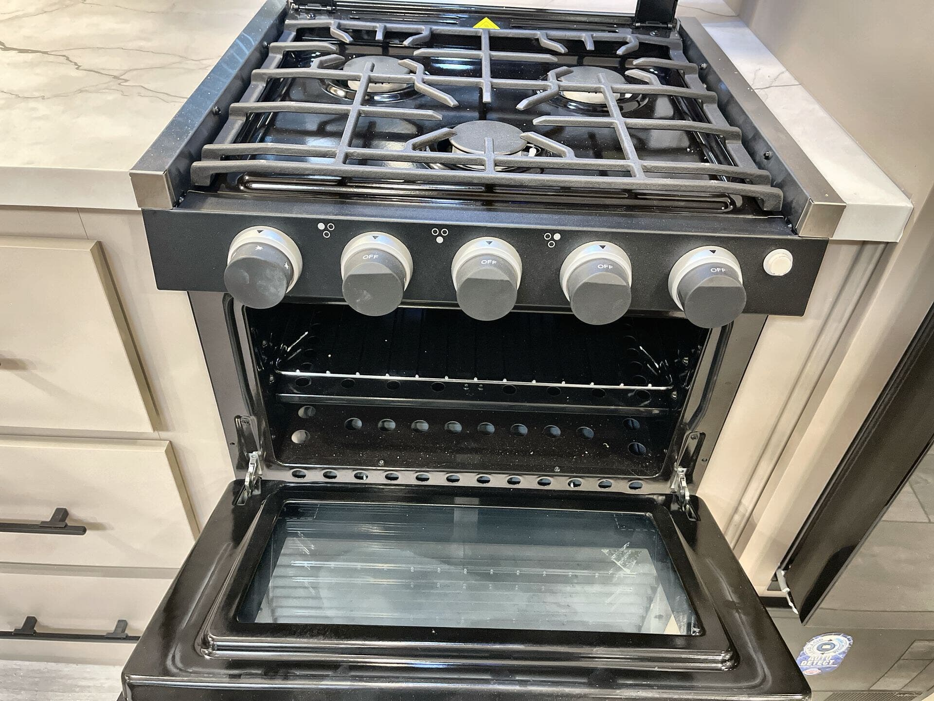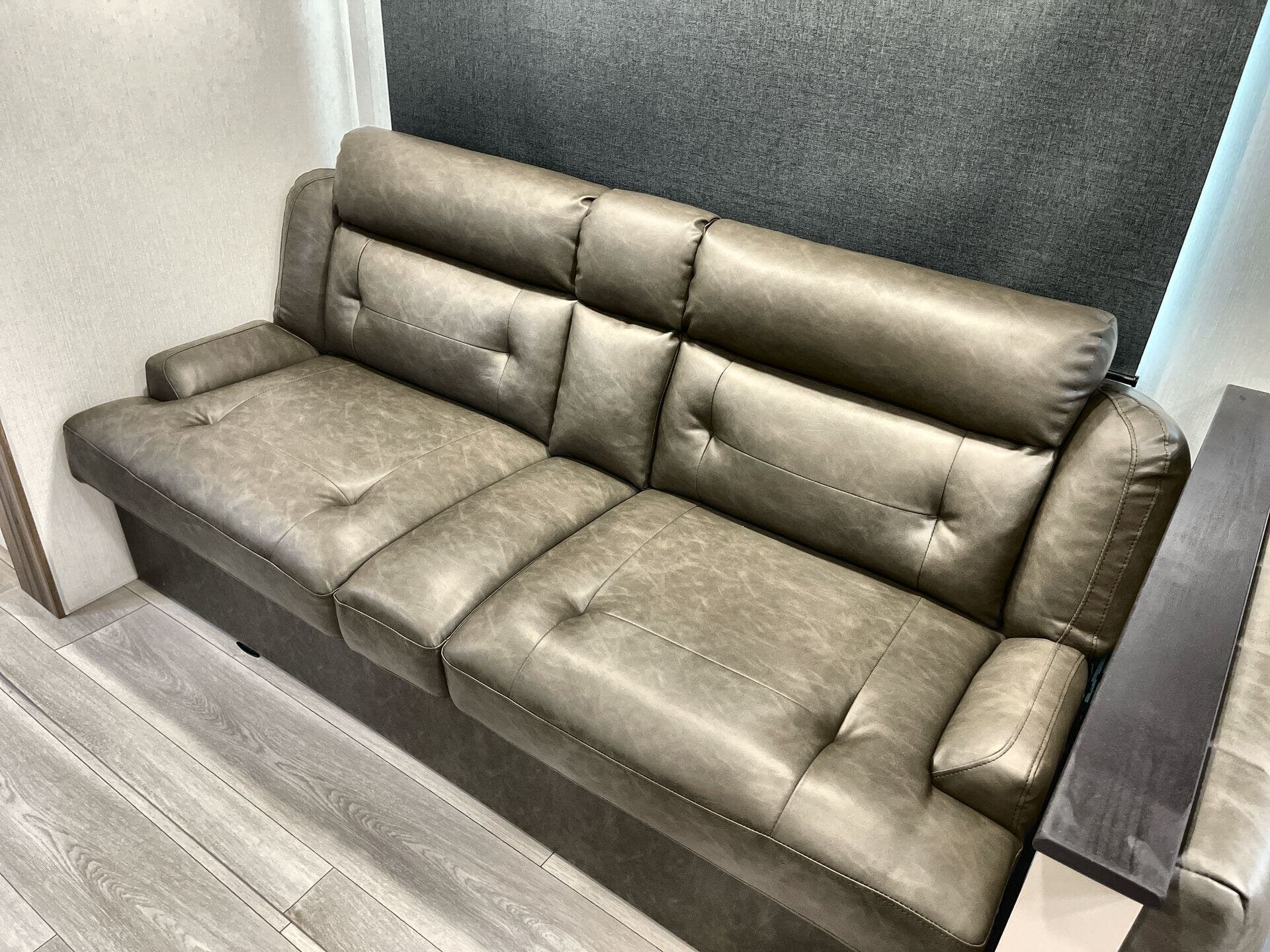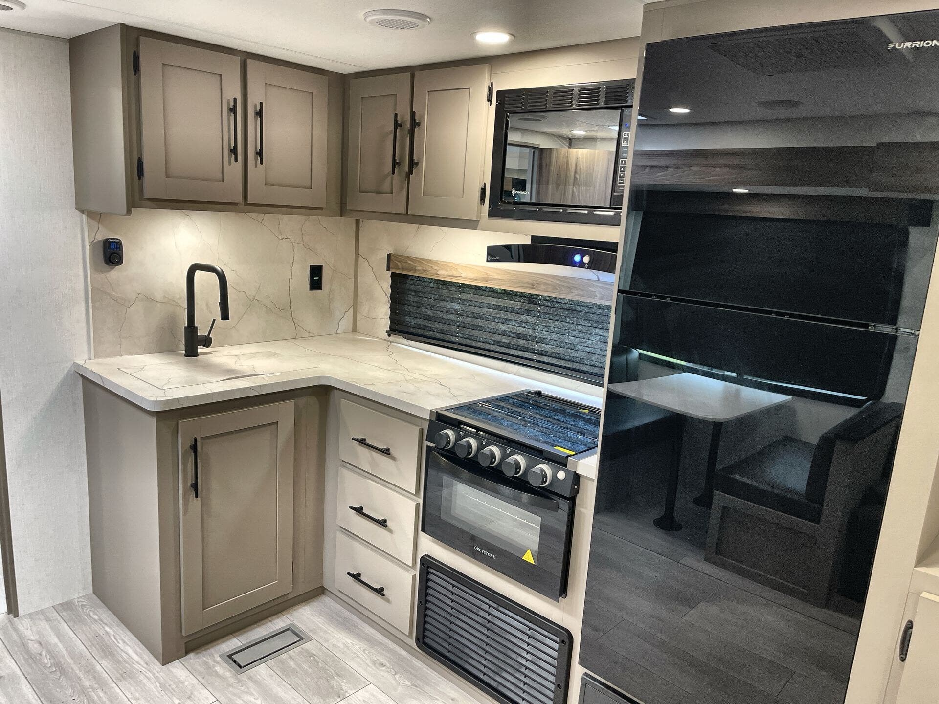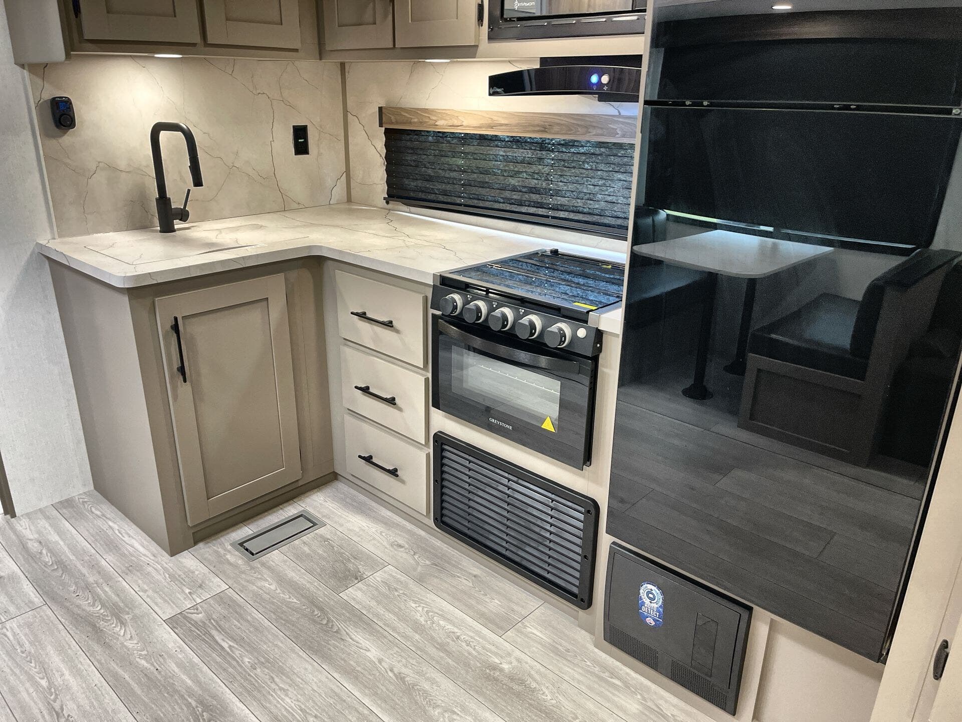 The main living and kitchen area is open and functional with a booth dinette, sofa slide, entertainment center, and a full kitchen equipped with a three-burner cooktop, oven, microwave, undermount stainless sink, and a 10 cu ft 12V refrigerator.