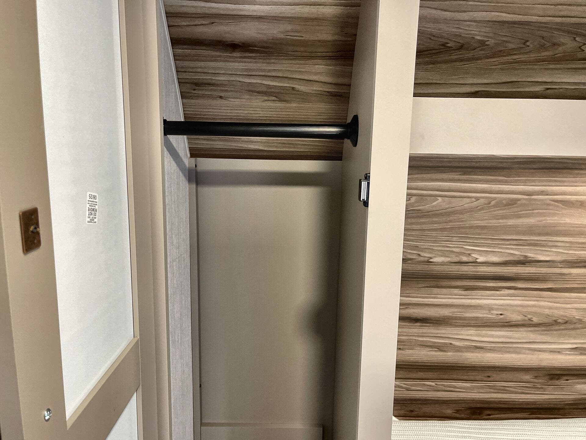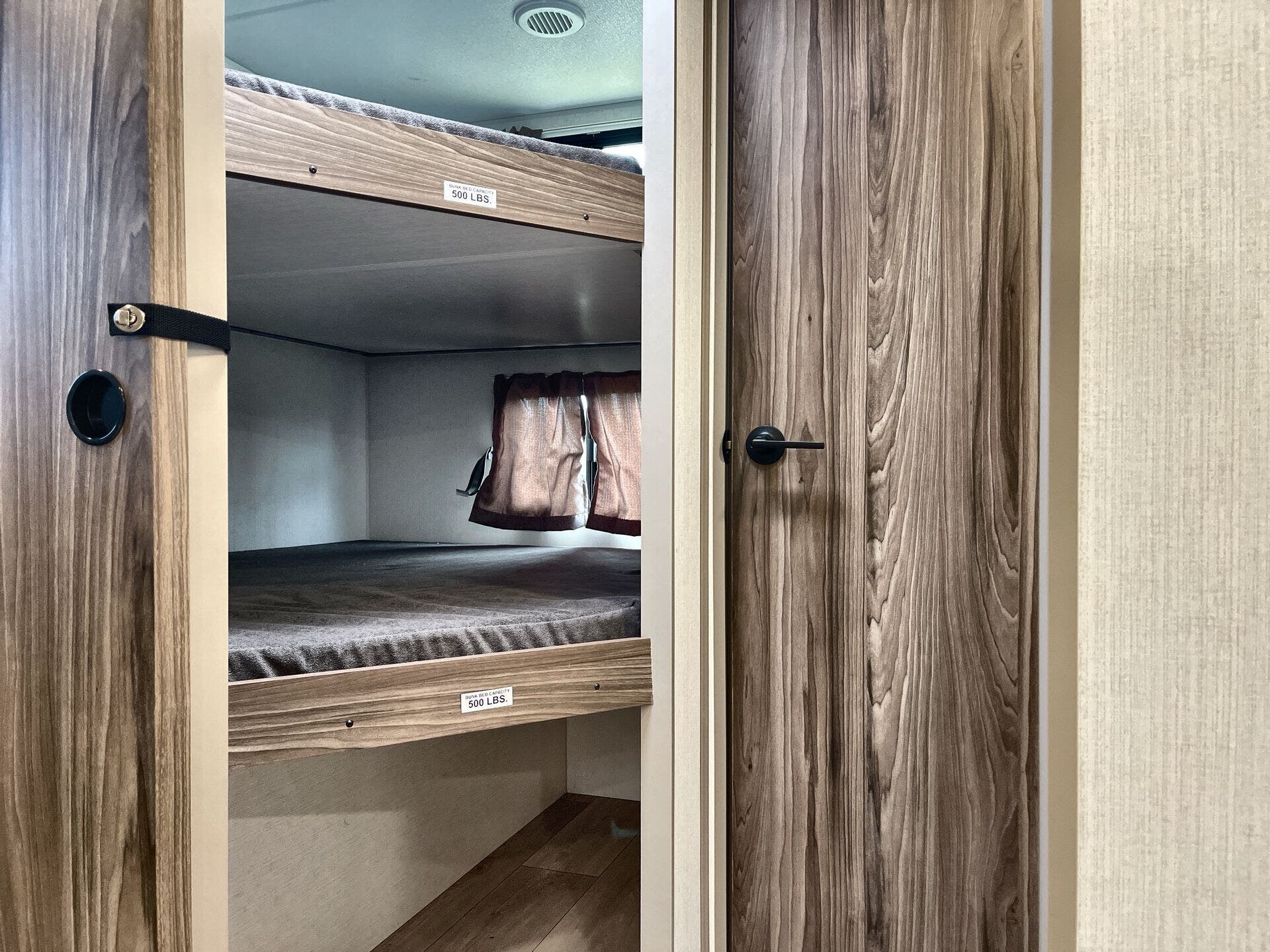 Inside, the layout centers around a comfortable front master bedroom with a queen bed, dual wardrobes, under-bed storage, and privacy. The bunkhouse in the rear features double-size bunks, ideal for kids or guests, plus space for their essentials.