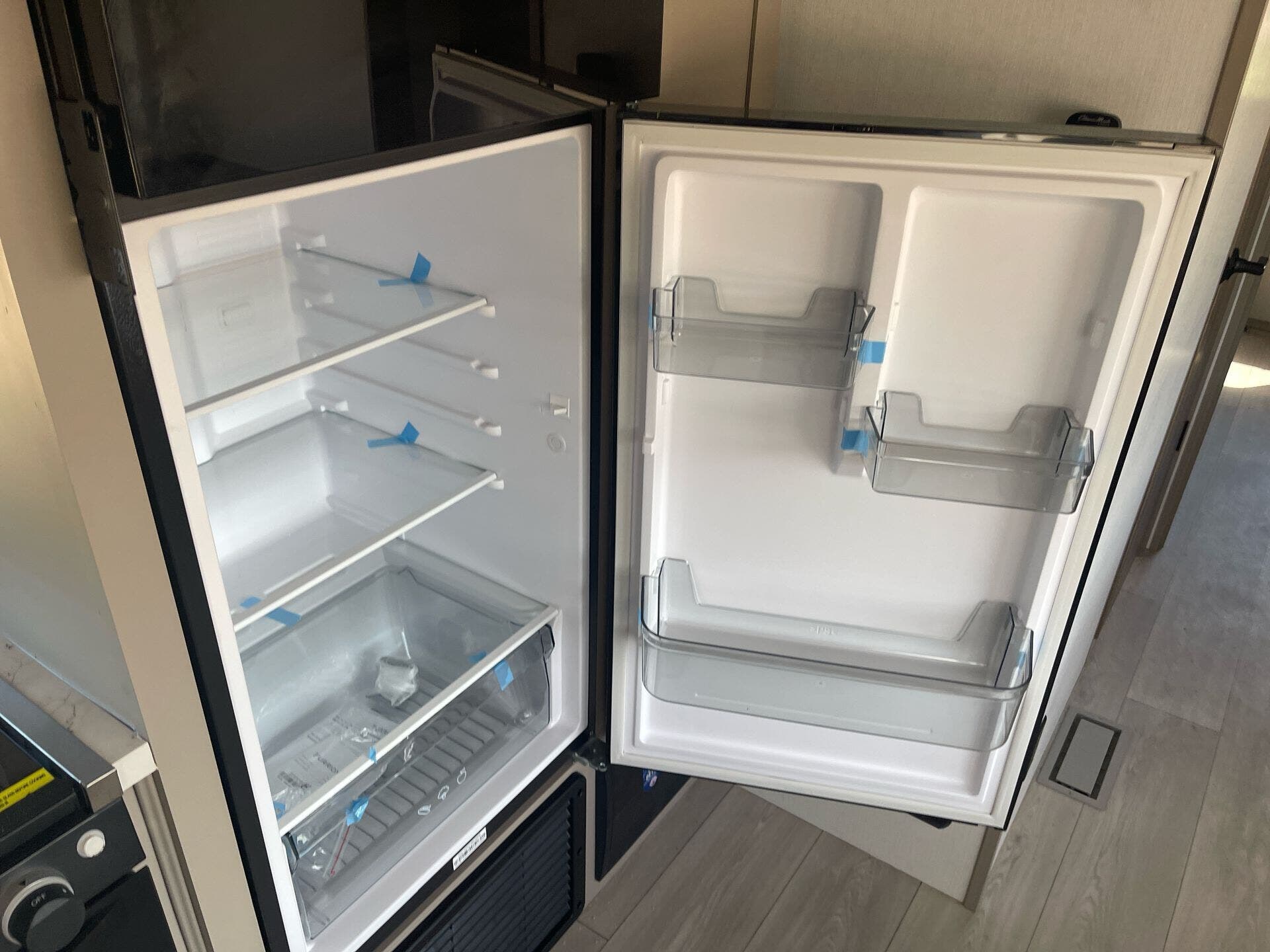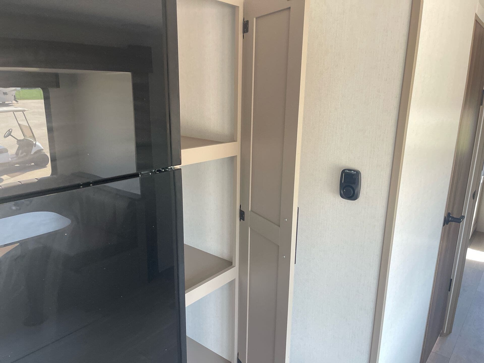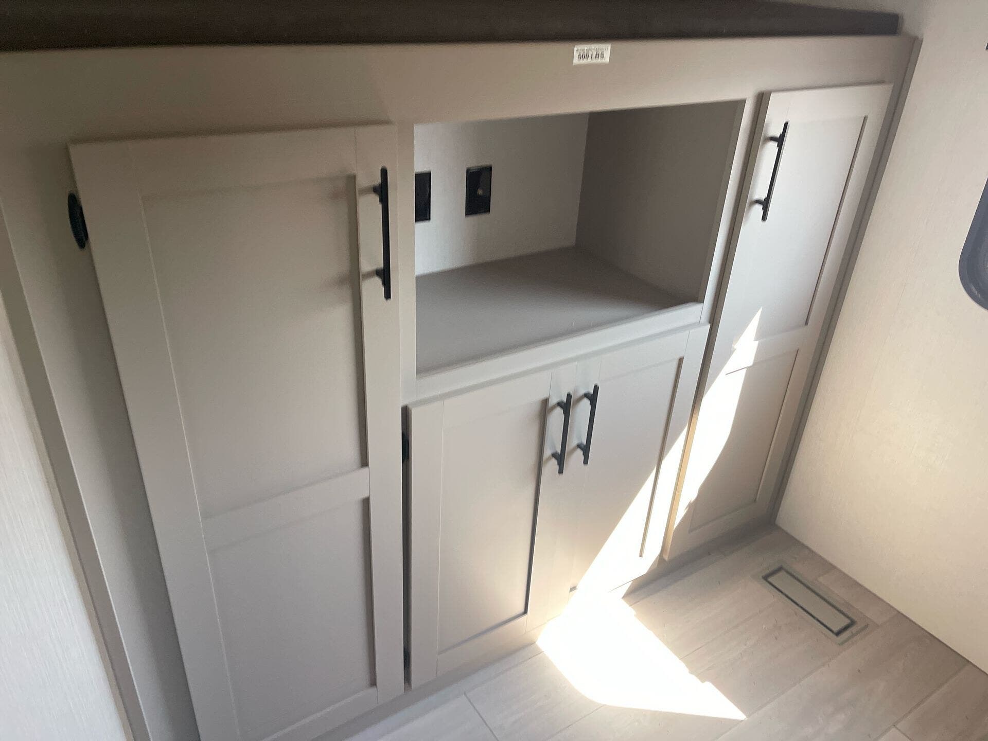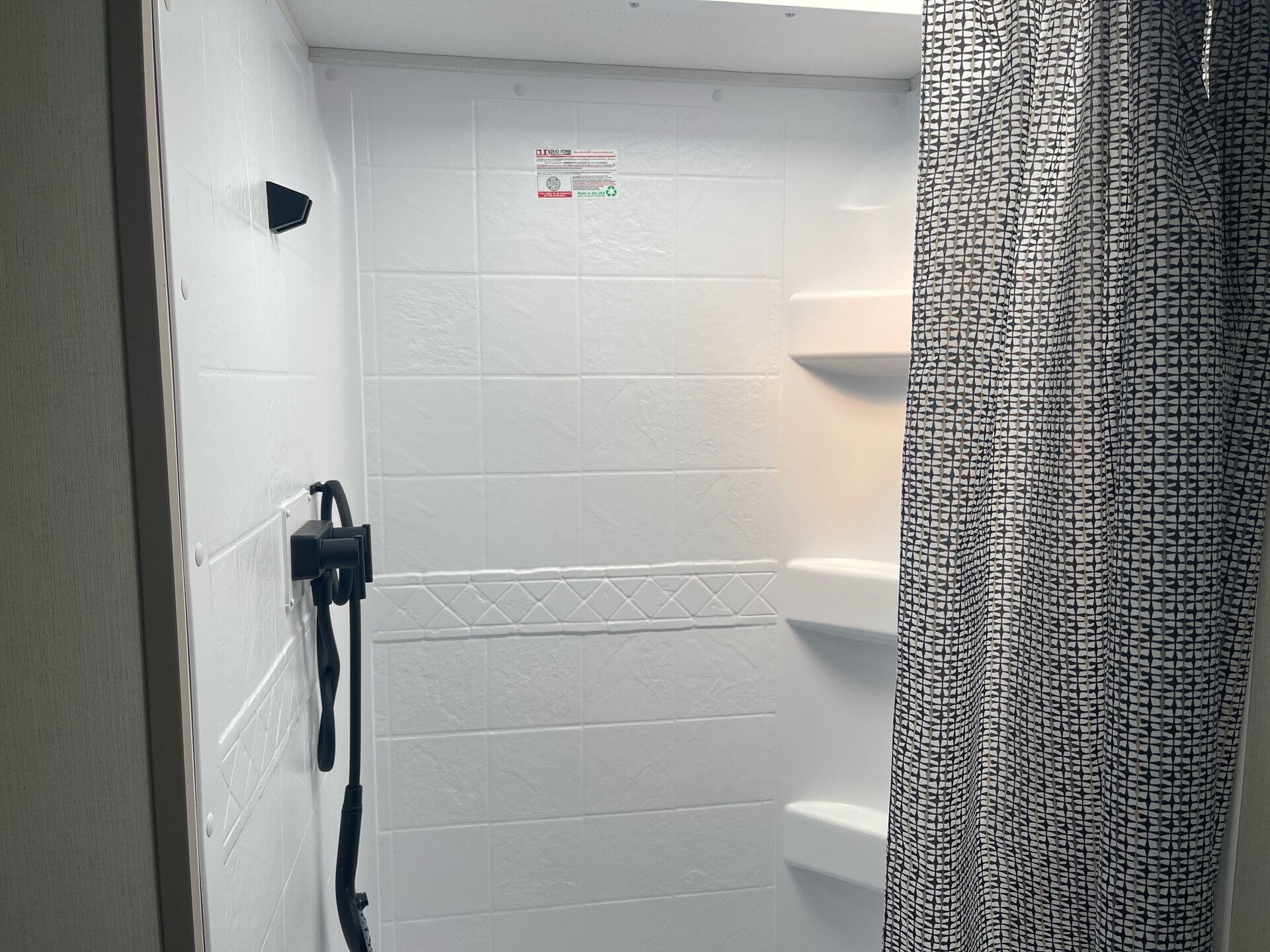The kitchen is fully equipped with a 10 cu ft refrigerator, three-burner cooktop, microwave, pantry, and prep space. A full bathroom with a 30" × 36" shower and linen storage is conveniently positioned between the living area and bedroom.