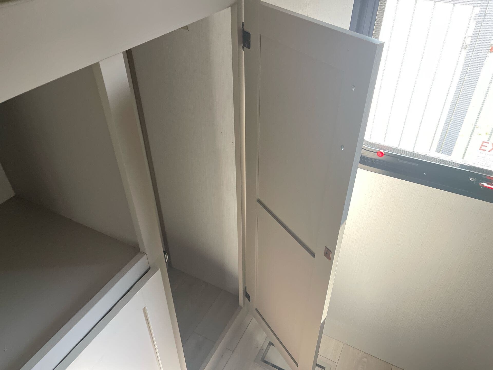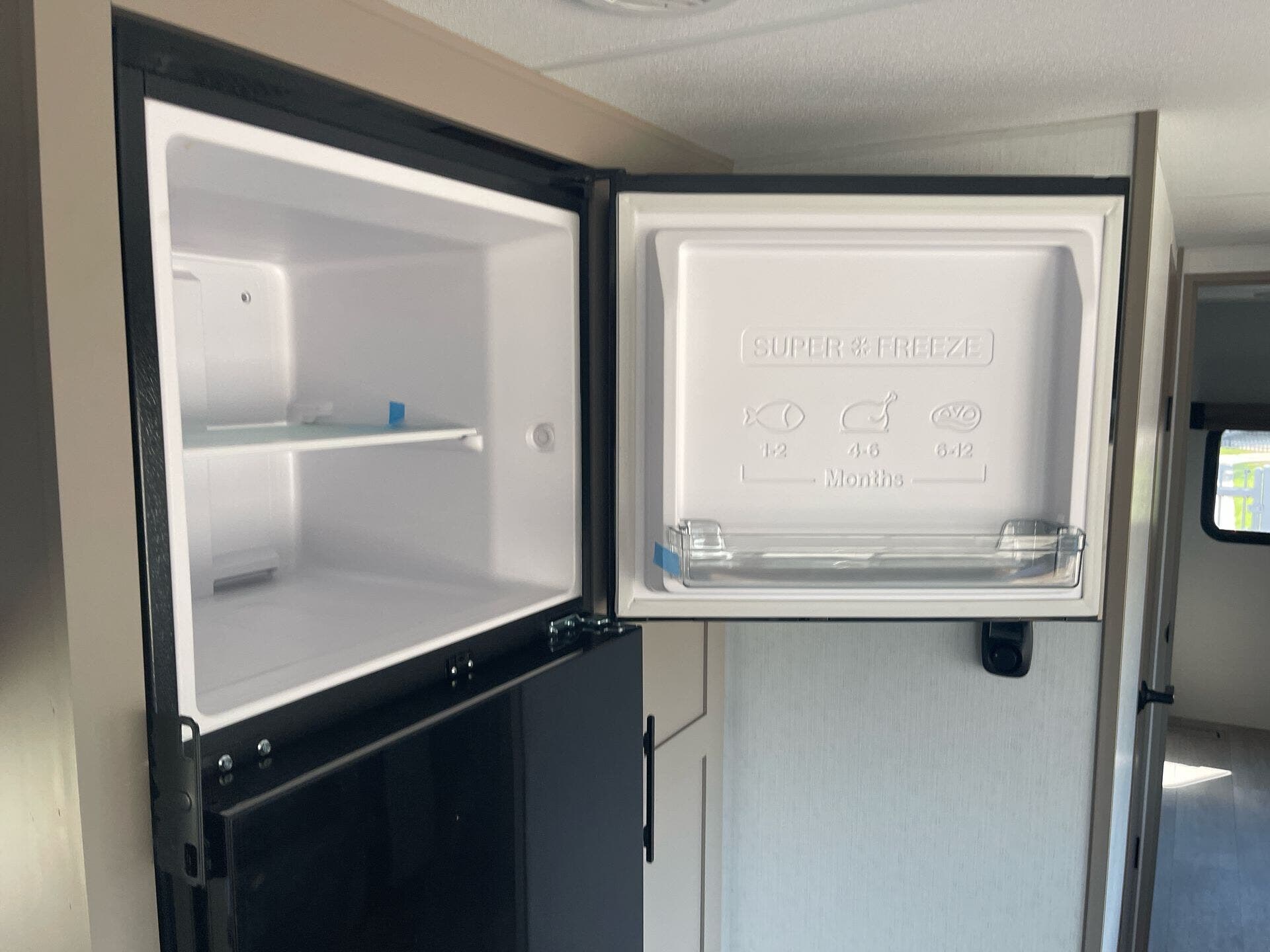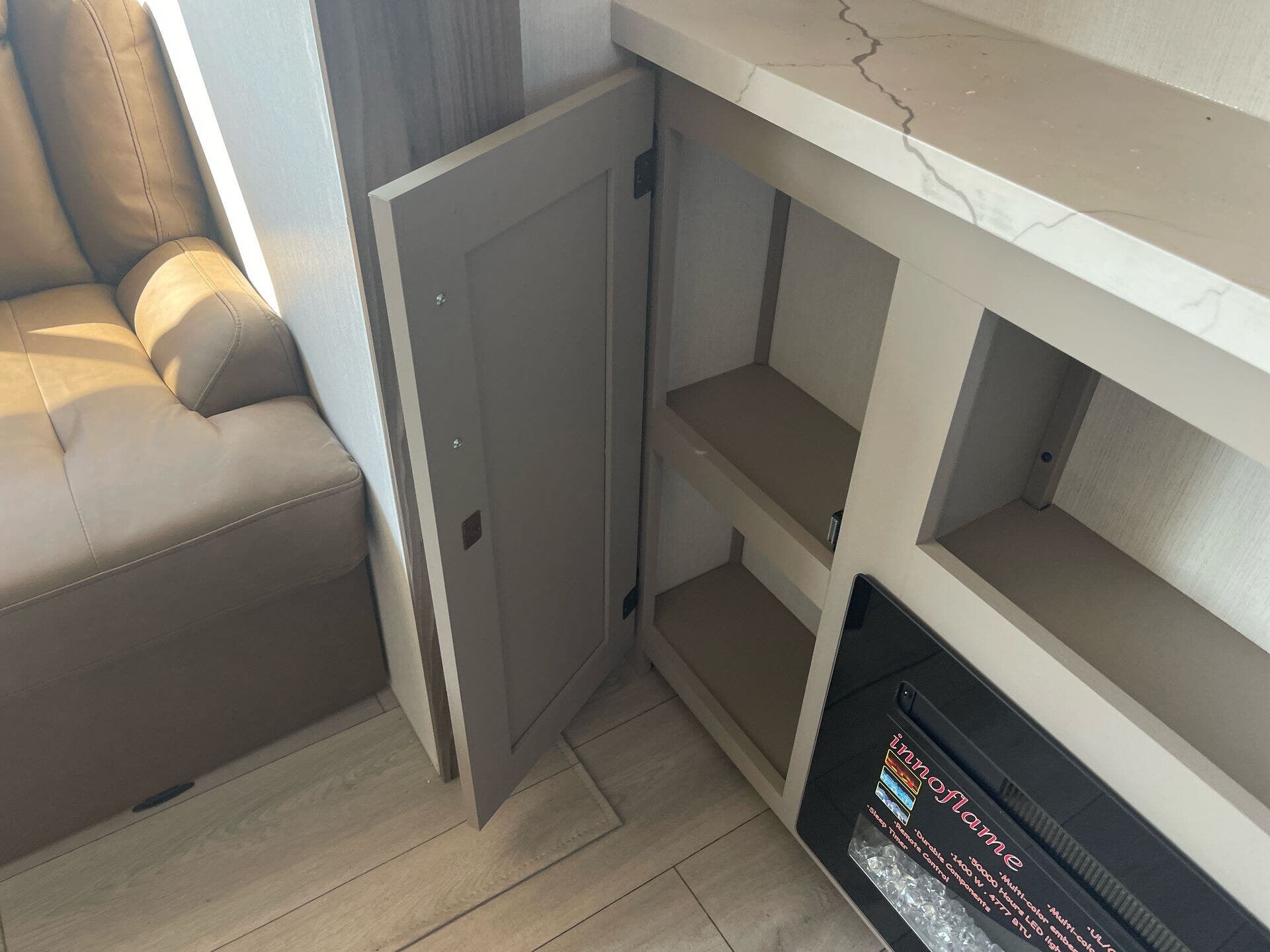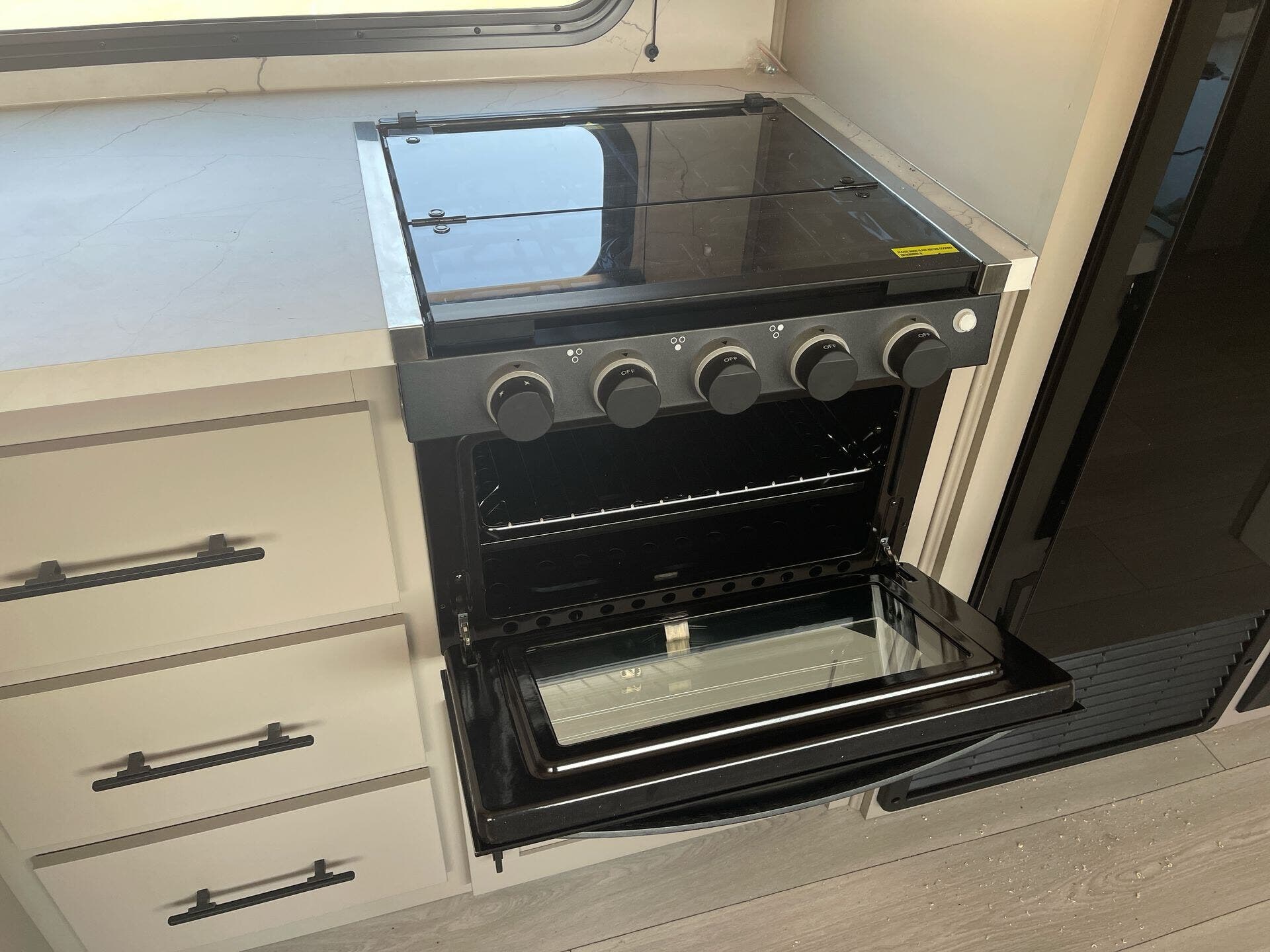 The kitchen is fully equipped with a 10 cu ft refrigerator, three-burner cooktop, microwave, pantry, and prep space. A full bathroom with a 30" × 36" shower and linen storage is conveniently positioned between the living area and bedroom.
