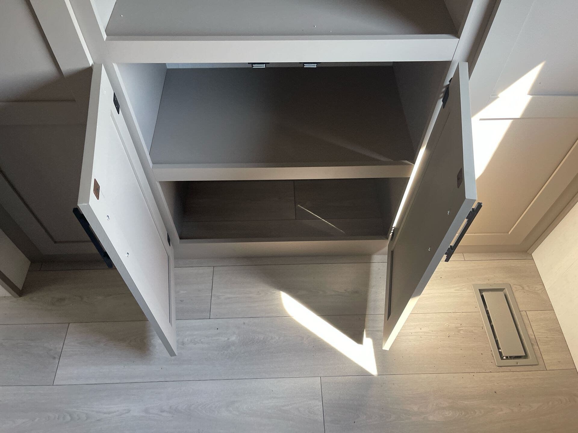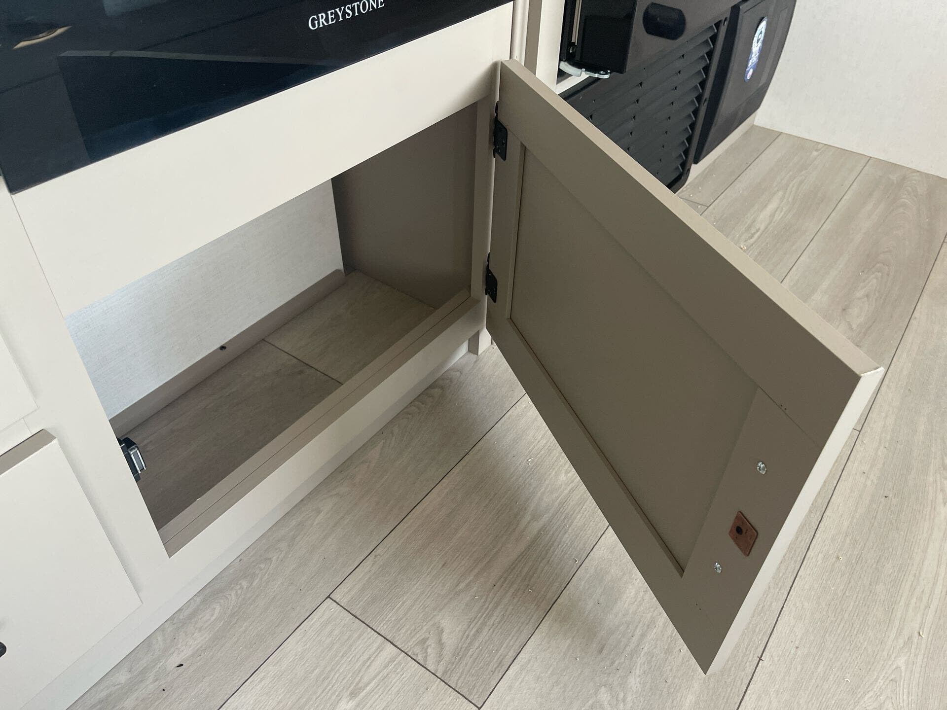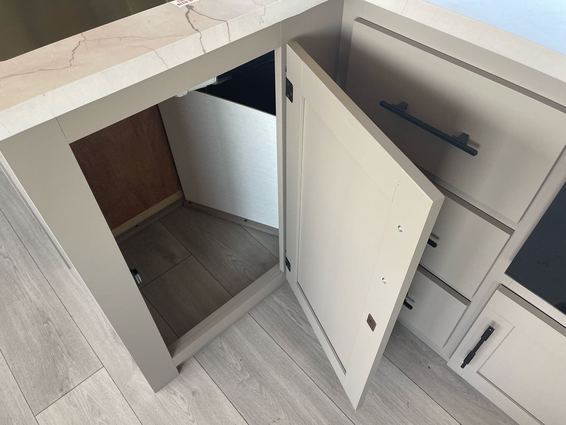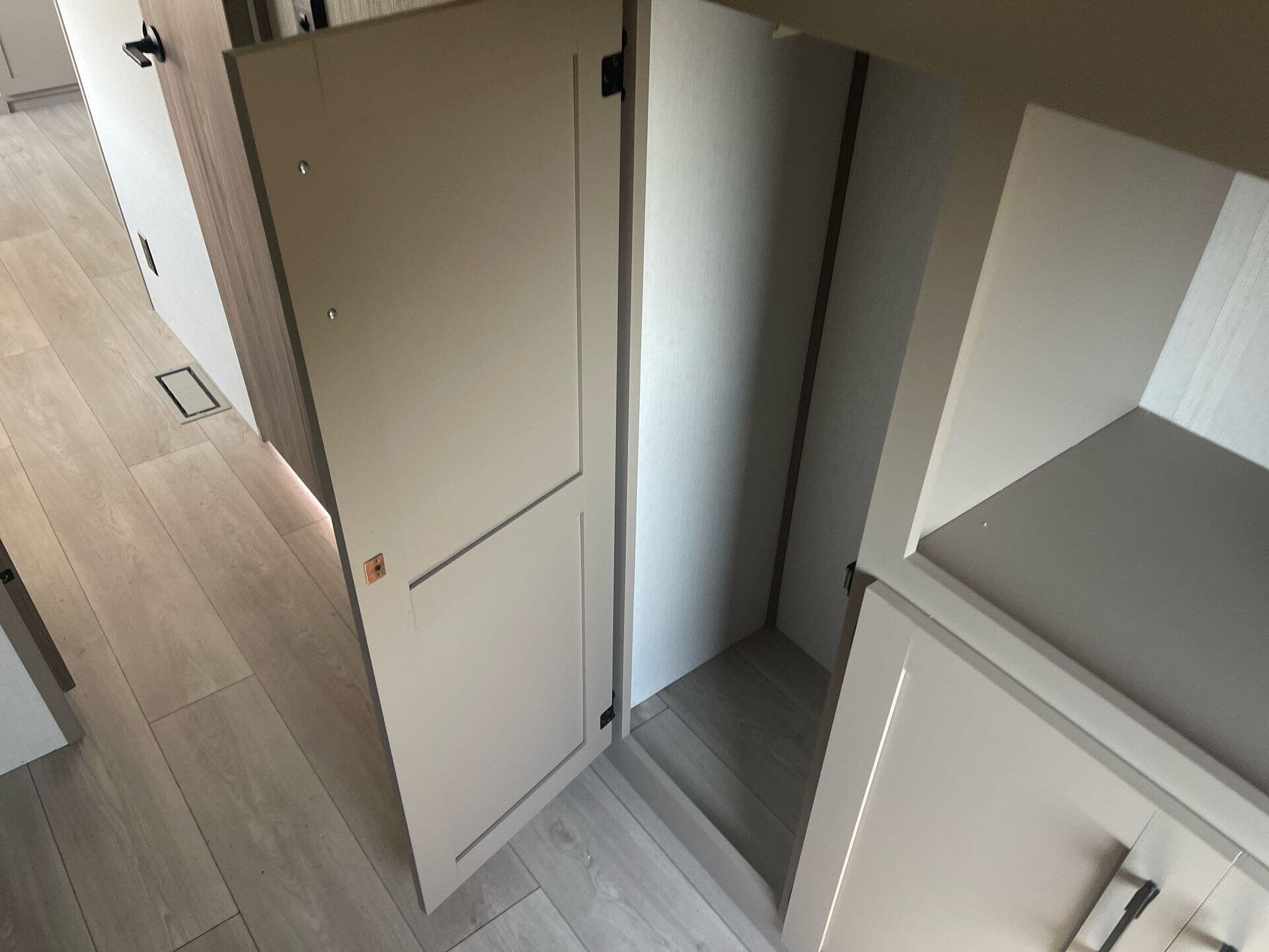 The kitchen is fully equipped with a 10 cu ft refrigerator, three-burner cooktop, microwave, pantry, and prep space. A full bathroom with a 30" × 36" shower and linen storage is conveniently positioned between the living area and bedroom.