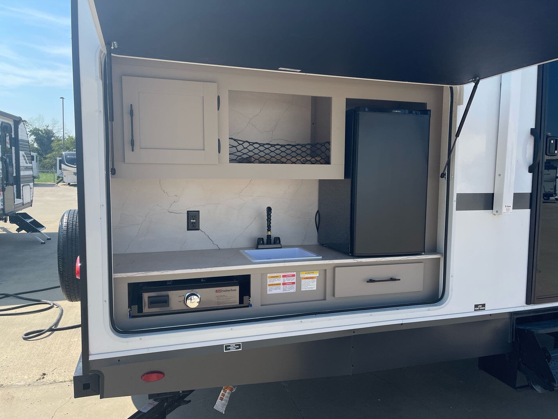 Awning, Exterior Grill, Exterior Speakers, External Shower, Leveling Jacks, Outside Kitchen, Skylight, Slideout, Spare Tire Kit -