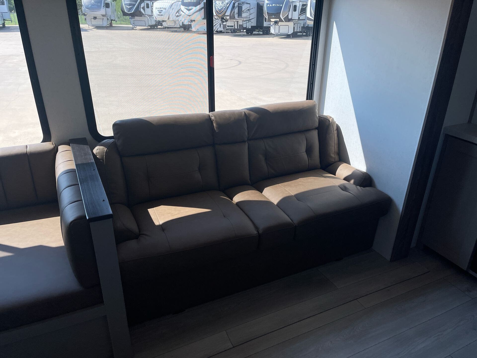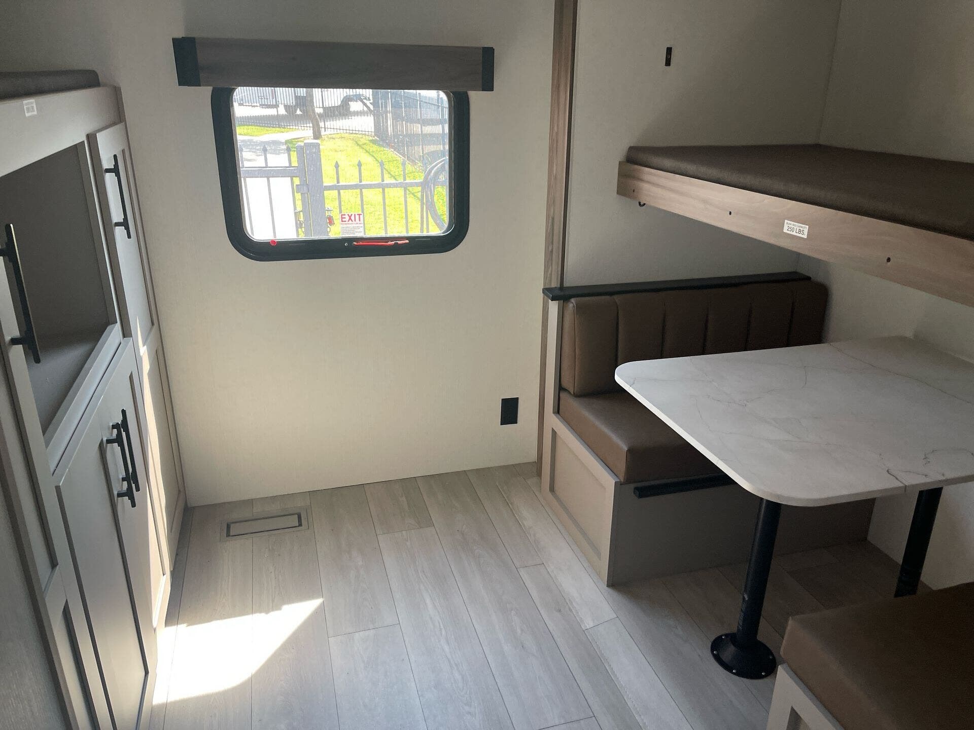 Inside, a rear bunkhouse offers dual bunks and a dinette with storage—ideal for kids or guests—while a private front bedroom features a walk-around queen bed, dual wardrobes, and a sliding door for privacy. In the center, the main living area opens up with a slide-out U-shaped dinette and a sofa, creating versatile space for dining, relaxing, or converting to extra sleeping spots.