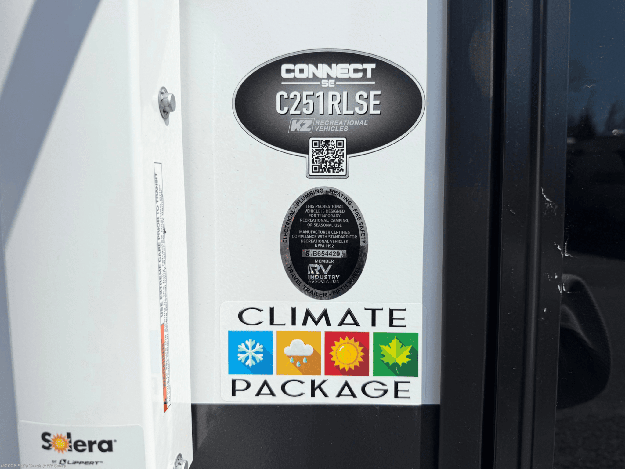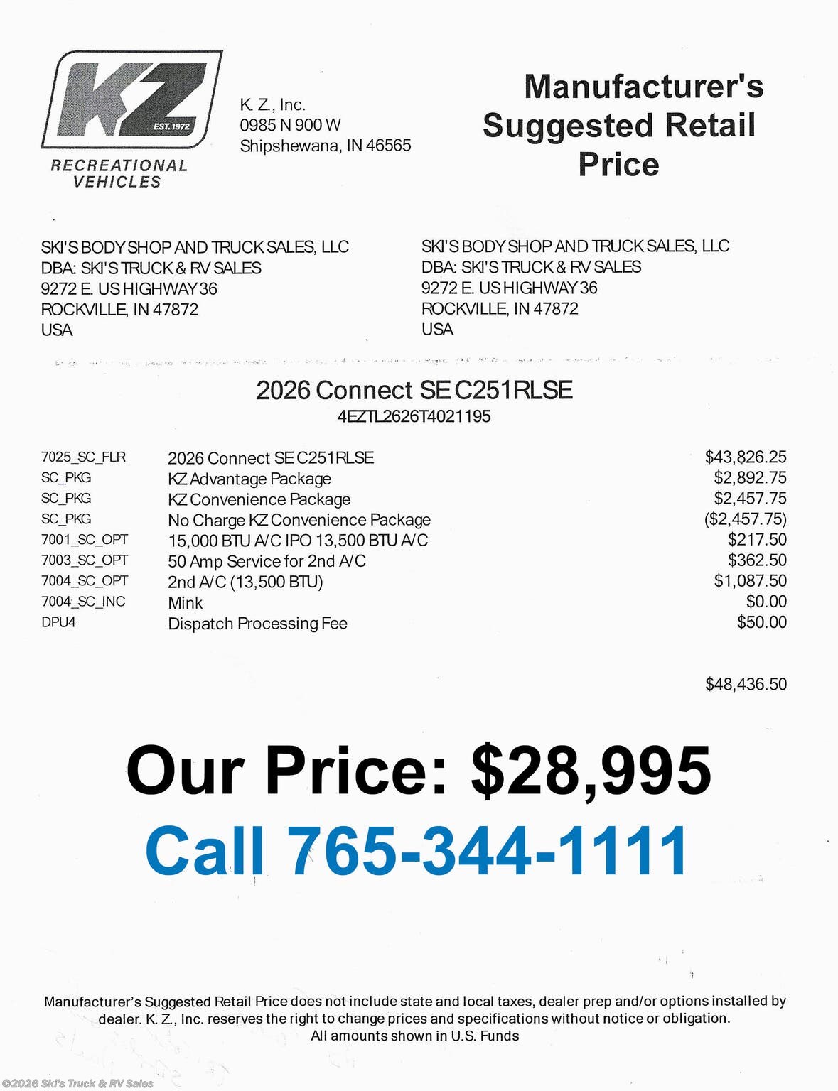 2026 KZ Connect SE C251RLSE Travel Trailer; 26 Foot; 1 Slide; Sleeps 6; Hitch Weight: 780 Lbs.; Dry Weight: 5,880 Lbs.; 50 Amp; Power Tongue Jacks; Manual Stabilizer Jacks; 45 Gal. Fresh Water Cap.; 32 Gal. Black Water Cap.; 32 Gal. Gray Water Cap.; Two 20 Lbs. Propane Tanks; Two ACs: 15,000 / 13,500 BTUs; 30,000 BTU Furnace; 10 C. F. (12V) Refrigerator; On Demand Water Heater; Microwave; 3-Burner Stove/Oven; Two TV Jacks; Speakers; One Fireplace; Stainless Steel Sink; U Shaped Dinette; Jack-knife Sofa; Queen Bed; One Bathroom with Shower; Porcelain Toilet; 19 Foot Power Awning with LED Lights; Backup Camera Prep.; Solar Prep.; Outside Shower; Exterior Storage; Foldup Steps; Grab Handle; Key Alike System; Magnetic Door Holder; *Battery Disconnect; Black Tank Flush; Climate Package; Azdel Sidewalls; Screen Defender; Screenshot; Tinted Windows; Roller Shades; Aluminum Wheels; Spare Tire; Two Year Limited Warranty; Financing Available; Great Deal on this Travel Trailer: $28,995. Call 765-344-1111 or visit us online at for more information and photos.