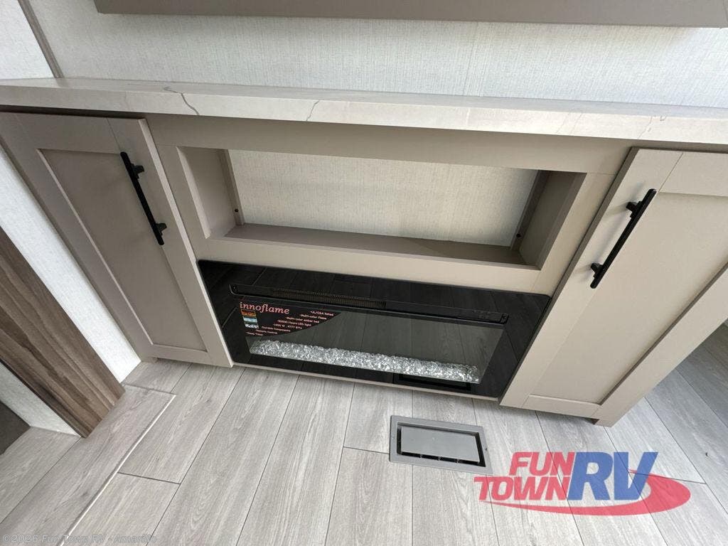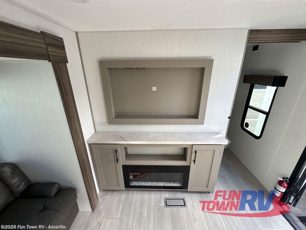 These travel trailer bunk beds are perfect for kids, while the closet provide ample storage space for clothing and essentials. The full bathroom features a linen closet, providing convenient storage for towels and toiletries. The pantry is perfect for storing snacks and ingredients, while the refrigerator keeps your food and drinks fresh, and the sink is conveniently located for meal prep. The U-shaped dinette is a great spot for meals or socializing, while the sofa offers a comfortable spot to relax. The entertainment center with a fireplace is perfect for cozying up on chilly nights. The front bedroom features a spacious queen bed and ample storage space in the wardrobes. Convenience is found in the exterior thanks to the two exterior awnings providing shade and protection from the elements, while the outside kitchen is perfect for outdoor cooking and entertaining