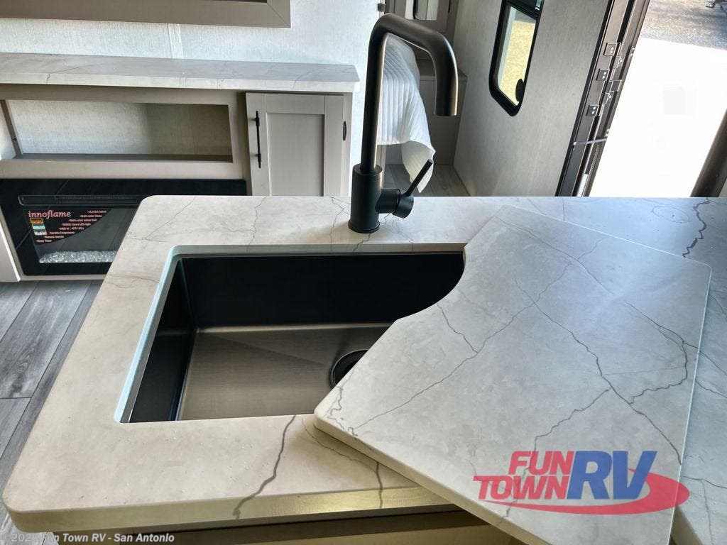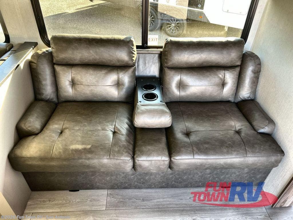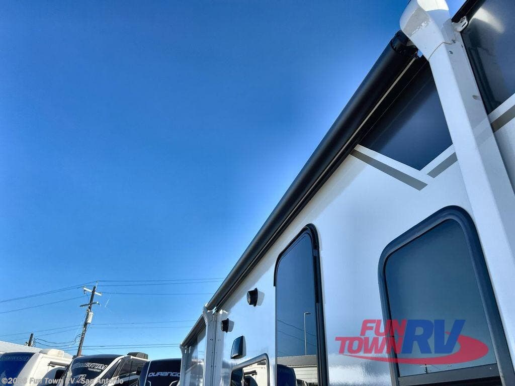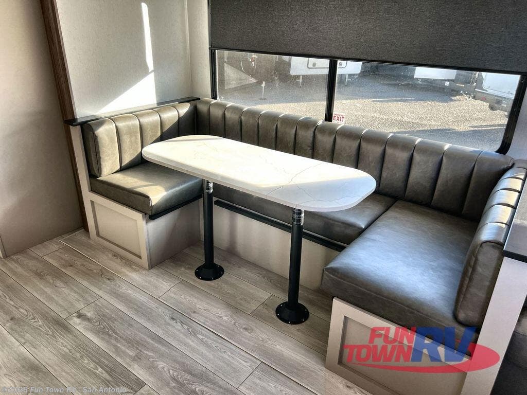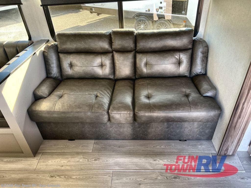 These travel trailer bunk beds are perfect for kids, while the closet provide ample storage space for clothing and essentials. The full bathroom features a linen closet, providing convenient storage for towels and toiletries. The pantry is perfect for storing snacks and ingredients, while the refrigerator keeps your food and drinks fresh, and the sink is conveniently located for meal prep. The U-shaped dinette is a great spot for meals or socializing, while the sofa offers a comfortable spot to relax. The entertainment center with a fireplace is perfect for cozying up on chilly nights. The front bedroom features a spacious queen bed and ample storage space in the wardrobes. Convenience is found in the exterior thanks to the two exterior awnings providing shade and protection from the elements, while the outside kitchen is perfect for outdoor cooking and entertaining