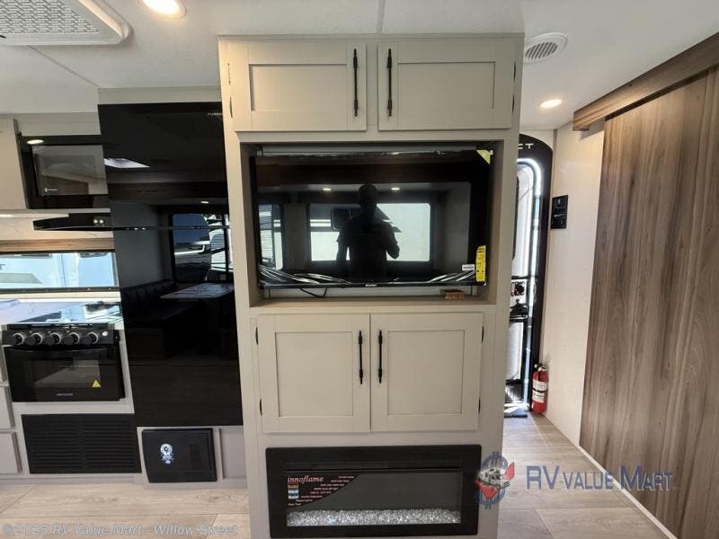Your family will love this travel trailer. Sleep comfortably with your partner in the amazing queen bed situated in the front room, which has dual wardrobes perfect for storing your clothing. This unit is fitted with a full walk-through bathroom and a half bathroom in the rear part of the trailer, both ideal for refreshing yourself on a hot day. You can relax a little in the 70" sofa equipped with a 34" fireplace in front of it allowing you to enjoy a cozy atmosphere. You can also cook delicious meals in the incredible kitchen, fitted with a microwave, three cooktop burners, a walk-in pantry with coat hooks, a sink, a dinette, and a refrigerator, ideal for cooking any delicious dish. Finally, you will find an outdoor refrigerator and griddle excellent for cooking under the stars with your family, and a pass-through storage perfect for placing your stuff.